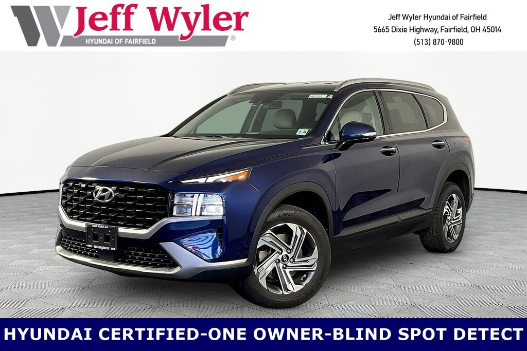 CARFAX One-Owner. Clean CARFAX. Jeff Wyler Hyundai of Fairfield is excited to offer this good-looking 2023 Hyundai Santa Fe SEL in Stormy Blue. Well equipped with: Option Group 01, Hyundai Certified Used Vehicles Certified, AWD, Beige Cloth, Android Auto, Apple CarPlay, CALL NOW FOR YOUR VIP APPOINTMENT 513-870-9800, FULLY SERVICED w/RECORDS, GUARANTEED FINANCING!! NO MATTER YOUR SITUATION WE CAN GET AN APPROVAL!!, THE #1 Volume dealer in the region! Come see why for yourself Today!!, WE PAY MORE FOR YOUR TRADE!!, 18" x 7.5J Alloy Wheels, 4-Wheel Disc Brakes, 6 Speakers, ABS brakes, Air Conditioning, Alloy wheels, AM/FM radio: SiriusXM, Apple CarPlay & Android Auto, Auto High-beam Headlights, Automatic temperature control, Axle Ratio: 4.081, Brake assist, Bumper Applique, Bumpers: body-color, Cargo Cover/Screen, Cargo Net, Cargo Tray, Carpeted Floor Mats, Delay-off headlights, Driver door bin, Driver vanity mirror, Dual front impact airbags, Dual front side impact airbags, Electronic Stability Control, Emergency communication system, Exterior Parking Camera Rear, First Aid Kit, Four wheel independent suspension, Front anti-roll bar, Front Bucket Seats, Front Center Armrest, Front dual zone A/C, Front reading lights, Fully automatic headlights, Heated door mirrors, Heated Front Bucket Seats, Heated front seats, Illuminated entry, Leather steering wheel, Low tire pressure warning, Navigation System, Occupant sensing airbag, Outside temperature display, Overhead airbag, Overhead console, Panic alarm, Passenger door bin, Passenger vanity mirror, Power door mirrors, Power driver seat, Power Liftgate, Power steering, Power windows, Radio: AM/FM Display Audio, Rear anti-roll bar, Rear seat center armrest, Rear window defroster, Rear window wiper, Remote keyless entry, Security system, Speed control, Speed-sensing steering, Split folding rear seat, Spoiler, Stain-Resistant Cloth Seat Trim, Steering wheel mounted audio controls, Tachometer, Telescoping steering wheel, Tilt steering wheel, Traction control, Trip computer, Turn signal indicator mirrors, Variably intermittent wipers, and Wheel Locks. Certified. Hyundai Certified Used Vehicles Details: * Vehicle History * Limited Warranty: 60 Month/60,000 Mile (whichever comes first) from original in-service date * Includes 10-year/Unlimited Mileage Roadside Assistance with Rental Car and Trip Interruption Reimbursement; Please See Dealers for Specific Vehicle Eligibility Requirements. 10-Year/100,000 Mile Hybrid/EV Battery Warranty. 3-Months SiriusXM Trial Subscription. Complimentary 1 Year (Connected Care & Remote Pkgs). * Powertrain Limited Warranty: 120 Month/100,000 Mile (whichever comes first) from original in-service date * Warranty Deductible: $50 * 173+ Point Inspection * Roadside AssistanceTO CHECK ON THE AVAILABILITY OF THIS VEHICLE REACH OUT TO ONE OF OUR TEAM MEMBERS!! ALSO SHOP ONLINE AT https://www.jeffwylerhyundaioffairfield.com/ Proudly Serving: Cincinnati, Dayton, Columbus, Louisville, Lexington, Indianapolis, Hamilton, Florence, Alexandria, Beavercreek, Springdale, West Chester, Monroe, Fairfield, Kenwood, Newport and all of greater Cincinnati Ohio, Indiana, and Northern Kentucky.