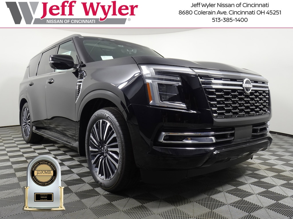 $10,903 off MSRP! Super Black 2025 Nissan Armada Platinum Reserve 4WD 9-Speed Automatic Jeff Wyler Nissan of Cincinnati is excited to offer this great 2025 Nissan Armada Platinum Reserve in Super Black. Well equipped with: Split Bench Seat Package (2nd-Row Split Bench Seat w/40/20/40-Split Folding, Center Armrest w/2 Cupholders, and EZ Flex 2nd-Row Seating System w/1-Touch Release), 4WD, 12 Speakers, 3rd row seats: split-bench, 4-Wheel Disc Brakes, ABS brakes, Adaptive suspension, Air Conditioning, Alloy wheels, AM/FM radio: SiriusXM, Anti-whiplash front head restraints, Auto High-beam Headlights, Auto tilt-away steering wheel, Auto-dimming door mirrors, Auto-dimming Rear-View mirror, Auto-leveling suspension, Automatic temperature control, Brake assist, Bumpers: body-color, Carpeted Floor Mats - Bench Seat, Center Front Spoiler, Climate Controlled Heated & Ventilated Front Seats, Delay-off headlights, Driver door bin, Driver vanity mirror, Dual front impact airbags, Dual front side impact airbags, Electronic Stability Control, Emergency communication system: NissanConnect Services, Four wheel independent suspension, Front anti-roll bar, Front Bucket Seats, Front Center Armrest, Front dual zone A/C, Front fog lights, Front reading lights, Fully automatic headlights, Garage door transmitter: myQ Connected Garage, Genuine wood dashboard insert, Heads-Up Display, Heated door mirrors, Heated front seats, Heated rear seats, Heated steering wheel, HVAC memory, Illuminated entry, Illuminated Kick Plates, Knee airbag, Leather steering wheel, Low tire pressure warning, Memory seat, Navigation System, Occupant sensing airbag, Outside temperature display, Overhead airbag, Overhead console, Panic alarm, Passenger door bin, Passenger vanity mirror, Power door mirrors, Power driver seat, Power Liftgate, Power moonroof, Power passenger seat, Power steering, Power windows, ProPILOT Assist 2.1 (PLAT RESERVE Grade), Quilted Leather Seat Trim, Radio: NissanConnect w/SiriusXM 360L, Rain sensing wipers, Rear air conditioning, Rear anti-roll bar, Rear Bumper Protector, Rear reading lights, Rear window defroster, Rear window wiper, Reclining 3rd row seat, Remote keyless entry, Roof Rail Cross Bars, Security system, Speed control, Speed-sensing steering, Speed-Sensitive Wipers, Splash Guards, Split folding rear seat, Spoiler, Steering wheel memory, Steering wheel mounted audio controls, Tachometer, Telescoping steering wheel, Tilt steering wheel, Traction control, Trip computer, Turn signal indicator mirrors, Variably intermittent wipers, Ventilated front seats, Voltmeter, and Wheels: 22" Painted Alloy. 3.5L DOHC 4WD.Wyler Family First Package Includes: NanoCure Appearance Protection: Exterior & Interior Chemical Sealant Applied to Protect Against Environmental Hazards (7 Year Warranty Coverage). Pulse- Rear end Collision Avoidance System Theft Deterrent Strategy gives you 5 Years of Coverage against vehicle Theft, Offering up to a $5,000 benefit. Price includes: $1500 - Nissan MY25 Armada Bonus Cash. Exp. 01/05/2026