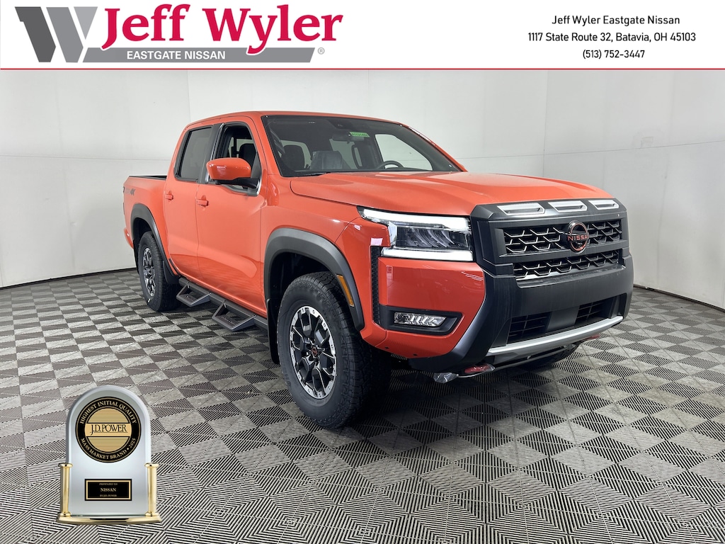 Afterburn Orange 2025 Nissan Frontier PRO-4X 3.8L DI DOHC 24V V6 4WD 9-Speed Automatic with Overdrive 18/22 City/Highway MPG Jeff Wyler Eastgate Auto Mall is pumped up to offer this gorgeous-looking 2025 Nissan Frontier PRO-4X in Afterburn Orange. Well equipped with: Bed Access Package, Fender Audio Package (Fender Premium Audio System w/10 Speakers and Partial Under-Seat Storage Delete), PRO Convenience Package (Bed Under-Rail Lighting, Heated Front Seats, Heated Outside Mirrors, Heated Steering Wheel, Intelligent Around View Monitor (I-AVM), Spray-In Bedliner, Trailer Hitch w/Wiring Harness, and Wireless Charging for Personal Devices), Tow Package (T11) (DISC), 17" Painted Alloy Wheels, 2-Tone Beadlock Style Wheel Accessory, 3.692 Axle Ratio, 4-Wheel Disc Brakes, 6 Speakers, ABS brakes, Air Conditioning, Alloy wheels, AM/FM radio: SiriusXM, Anti-whiplash front head restraints, Auto High-beam Headlights, Automatic temperature control, Blind Spot Warning, Brake assist, Bumpers: body-color, Delay-off headlights, Driver door bin, Driver vanity mirror, Dual front impact airbags, Dual front side impact airbags, Electronic Stability Control, Electronic Tailgate Lock, Emergency communication system, Essentials Kit, Front anti-roll bar, Front Bucket Seats, Front Center Armrest, Front dual zone A/C, Front fog lights, Front reading lights, Front wheel independent suspension, Fully automatic headlights, Illuminated entry, Knee airbag, Leather Shift Knob, Leather steering wheel, Low tire pressure warning, Mud Flap Accessory, Nissan Tailgate Audio by Kicker w/Utili-Track Brkt, Occupant sensing airbag, Off-Road Style Step Rails, Overhead airbag, Overhead console, Panic alarm, Passenger door bin, Passenger vanity mirror, Power door mirrors, Power driver seat, Power passenger seat, Power steering, Power windows, Premium Paint, PRO Embroidered Premium Cloth Seat Trim, PRO-4X Carpeted Floor Mats (DISC), Radio data system, Radio: SXM/AM/FM/AUX/USB Audio System, Rear anti-roll bar, Rear seat center armrest, Rear side impact airbag, Rear step bumper, Remote keyless entry, Security system, Speed control, Speed-sensing steering, Split folding rear seat, Steering wheel mounted audio controls, Tachometer, Telescoping steering wheel, Tilt steering wheel, Traction control, Trip computer, USB Charging Cable Kit, Variably intermittent wipers, Voltmeter, and Wireless Apple CarPlay/Wireless Android Auto. Price includes: $3500 - Nissan Customer Cash. Exp. 01/05/2026 $500 - Nissan MY25 Frontier Selldown Bonus Cash. Exp. 01/05/2026