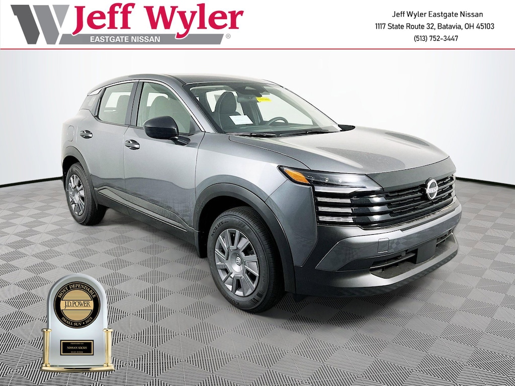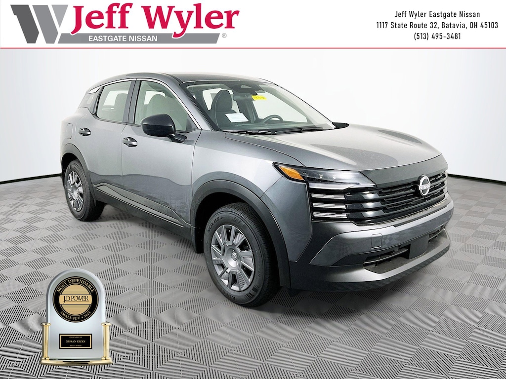 Priced below KBB Fair Purchase Price! Gun Metallic 2025 Nissan Kicks S 2.0L DOHC AWD CVT with Xtronic 27/34 City/Highway MPG Jeff Wyler Eastgate Auto Mall is honored to offer this great-looking 2025 Nissan Kicks S in Gun Metallic. Well equipped with: 16" Steel Wheels w/Full Covers, 4 Speakers, 4-Wheel Disc Brakes, ABS brakes, Air Conditioning, AM/FM radio, Auto High-beam Headlights, Blind Spot Warning, Brake assist, Bumpers: body-color, Carpeted Floor Mats, Cloth Seat Trim, Driver door bin, Driver vanity mirror, Driver's Seat Mounted Armrest, Dual front impact airbags, Dual front side impact airbags, Electronic Stability Control, Four wheel independent suspension, Front anti-roll bar, Front Bucket Seats, Front reading lights, Fully automatic headlights, Heated door mirrors, Illuminated entry, Knee airbag, Low tire pressure warning, Occupant sensing airbag, Outside temperature display, Overhead airbag, Panic alarm, Passenger door bin, Passenger vanity mirror, Power door mirrors, Power steering, Power windows, Radio data system, Radio: AM/FM Audio System, Rear anti-roll bar, Rear Parking Sensors, Rear reading lights, Rear side impact airbag, Rear window defroster, Rear window wiper, Remote keyless entry, Security system, Speed control, Speed-sensing steering, Splash Guards, Split folding rear seat, Spoiler, Sport steering wheel, Steering wheel mounted audio controls, Tachometer, Telescoping steering wheel, Tilt steering wheel, Traction control, Trip computer, and Variably intermittent wipers. 27/34 City/Highway MPG Price includes: $500 - Nissan MWR MY25 New Kicks Bonus Cash - December. Exp. 01/05/2026