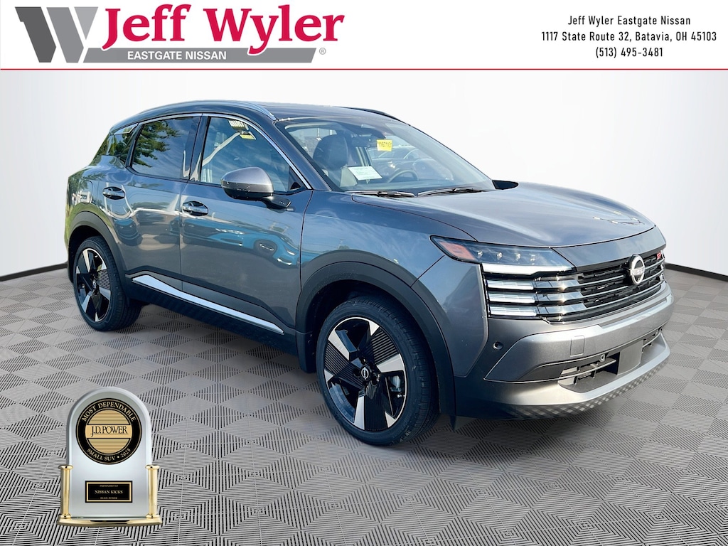 Gun Metallic 2025 Nissan Kicks SR 2.0L DOHC AWD CVT with Xtronic 27/34 City/Highway MPG Jeff Wyler Eastgate Auto Mall is delighted to offer this superb 2025 Nissan Kicks SR in Gun Metallic. Well equipped with: SR Premium Package (Bose 10 -Speaker Audio, Driver Seat-Mounted Supplemental Air Bag, Heated Front Seats, Heated Steering Wheel, Panoramic Moonroof, Rain Sensing Wipers, and Remote Engine Start), 17" Alloy Wheels, 19" Alloy Wheels, 4-Wheel Disc Brakes, 6 Speakers, ABS brakes, Air Conditioning, Alloy wheels, AM/FM radio: Sirius, Auto High-beam Headlights, Automatic temperature control, Brake assist, Bumpers: body-color, Carpeted Floor Mats, Delay-off headlights, Door Trim Panel Scuff Plates, Driver door bin, Driver vanity mirror, Dual front impact airbags, Dual front side impact airbags, Electronic Stability Control, Four wheel independent suspension, Front anti-roll bar, Front Bucket Seats, Front Center Armrest, Front reading lights, Fully automatic headlights, Heated door mirrors, Illuminated entry, Knee airbag, Leather Shift Knob, Leather steering wheel, Low tire pressure warning, Occupant sensing airbag, Outside temperature display, Overhead airbag, Overhead console, Panic alarm, Passenger door bin, Passenger vanity mirror, Power door mirrors, Power steering, Power windows, Radio data system, Radio: AM/FM Audio System, Rear anti-roll bar, Rear reading lights, Rear seat center armrest, Rear side impact airbag, Rear window defroster, Rear window wiper, Remote keyless entry, Security system, Speed control, Speed-sensing steering, Splash Guards, Split folding rear seat, Spoiler, Sport Cloth/Leatherette Seat Trim, Sport steering wheel, Steering wheel mounted audio controls, Tachometer, Telescoping steering wheel, Tilt steering wheel, Traction control, Trip computer, Turn signal indicator mirrors, Variably intermittent wipers, and Wireless Apple CarPlay/Wireless Android Auto. 27/34 City/Highway MPG Price includes: $1000 - Nissan MY25 New Kicks (SV and SR) Retail/Lease Bonus Cash. Exp. 01/05/2026 $500 - Nissan MWR MY25 New Kicks Bonus Cash - December. Exp. 01/05/2026
