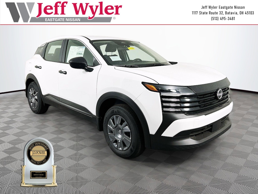 Priced below KBB Fair Purchase Price! Fresh Powder 2025 Nissan Kicks S 2.0L DOHC AWD CVT with Xtronic 27/34 City/Highway MPG Jeff Wyler Eastgate Auto Mall is very proud to offer this handsome 2025 Nissan Kicks S in Fresh Powder. Well equipped with: 16" Steel Wheels w/Full Covers, 4 Speakers, 4-Wheel Disc Brakes, ABS brakes, Air Conditioning, AM/FM radio, Auto High-beam Headlights, Blind Spot Warning, Brake assist, Bumpers: body-color, Carpeted Floor Mats, Cloth Seat Trim, Driver door bin, Driver vanity mirror, Driver's Seat Mounted Armrest, Dual front impact airbags, Dual front side impact airbags, Electronic Stability Control, Four wheel independent suspension, Front anti-roll bar, Front Bucket Seats, Front reading lights, Fully automatic headlights, Heated door mirrors, Illuminated entry, Knee airbag, Low tire pressure warning, Occupant sensing airbag, Outside temperature display, Overhead airbag, Panic alarm, Passenger door bin, Passenger vanity mirror, Power door mirrors, Power steering, Power windows, Radio data system, Radio: AM/FM Audio System, Rear anti-roll bar, Rear Parking Sensors, Rear reading lights, Rear side impact airbag, Rear window defroster, Rear window wiper, Remote keyless entry, Security system, Speed control, Speed-sensing steering, Splash Guards, Split folding rear seat, Spoiler, Sport steering wheel, Steering wheel mounted audio controls, Tachometer, Telescoping steering wheel, Tilt steering wheel, Traction control, Trip computer, and Variably intermittent wipers. 27/34 City/Highway MPG Price includes: $500 - Nissan MWR MY25 New Kicks Bonus Cash - December. Exp. 01/05/2026