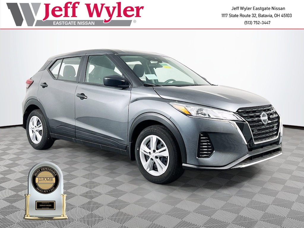 Gun Metallic 2025 Nissan Kicks Play S 1.6L 4-Cylinder DOHC 16V FWD CVT with Xtronic 31/36 City/Highway MPG Jeff Wyler Eastgate Auto Mall is delighted to offer this beautiful 2025 Nissan Kicks Play S in Gun Metallic. Well equipped with: 6 Speakers, ABS brakes, Air Conditioning, AM/FM radio, Auto High-beam Headlights, Blind Spot Warning, Brake assist, Driver door bin, Driver vanity mirror, Driver's Seat Mounted Armrest, Dual front impact airbags, Dual front side impact airbags, Electronic Stability Control, Front anti-roll bar, Front Bucket Seats, Front reading lights, Front wheel independent suspension, Fully automatic headlights, Illuminated entry, Knee airbag, Low tire pressure warning, Occupant sensing airbag, Outside temperature display, Overhead airbag, Panic alarm, Passenger door bin, Passenger vanity mirror, Power door mirrors, Power steering, Power windows, Radio data system, Rear Parking Sensors, Rear reading lights, Rear side impact airbag, Rear window defroster, Rear window wiper, Remote keyless entry, Speed control, Split folding rear seat, Sport steering wheel, Steering wheel mounted audio controls, Tachometer, Telescoping steering wheel, Tilt steering wheel, Traction control, Trip computer, and Variably intermittent wipers. 31/36 City/Highway MPG