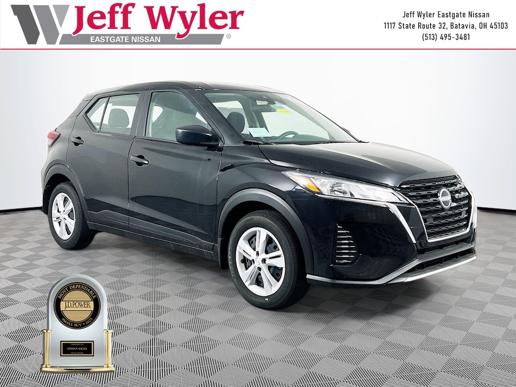 Super Black 2025 Nissan Kicks Play S 1.6L 4-Cylinder DOHC 16V FWD CVT with Xtronic 31/36 City/Highway MPG Jeff Wyler Eastgate Auto Mall is proud to offer this beautiful-looking 2025 Nissan Kicks Play S in Super Black. Well equipped with: 6 Speakers, ABS brakes, Air Conditioning, AM/FM radio, Auto High-beam Headlights, Blind Spot Warning, Brake assist, Driver door bin, Driver vanity mirror, Driver's Seat Mounted Armrest, Dual front impact airbags, Dual front side impact airbags, Electronic Stability Control, Front anti-roll bar, Front Bucket Seats, Front reading lights, Front wheel independent suspension, Fully automatic headlights, Illuminated entry, Knee airbag, Low tire pressure warning, Occupant sensing airbag, Outside temperature display, Overhead airbag, Panic alarm, Passenger door bin, Passenger vanity mirror, Power door mirrors, Power steering, Power windows, Radio data system, Rear Parking Sensors, Rear reading lights, Rear side impact airbag, Rear window defroster, Rear window wiper, Remote keyless entry, Speed control, Split folding rear seat, Sport steering wheel, Steering wheel mounted audio controls, Tachometer, Telescoping steering wheel, Tilt steering wheel, Traction control, Trip computer, and Variably intermittent wipers. 31/36 City/Highway MPG