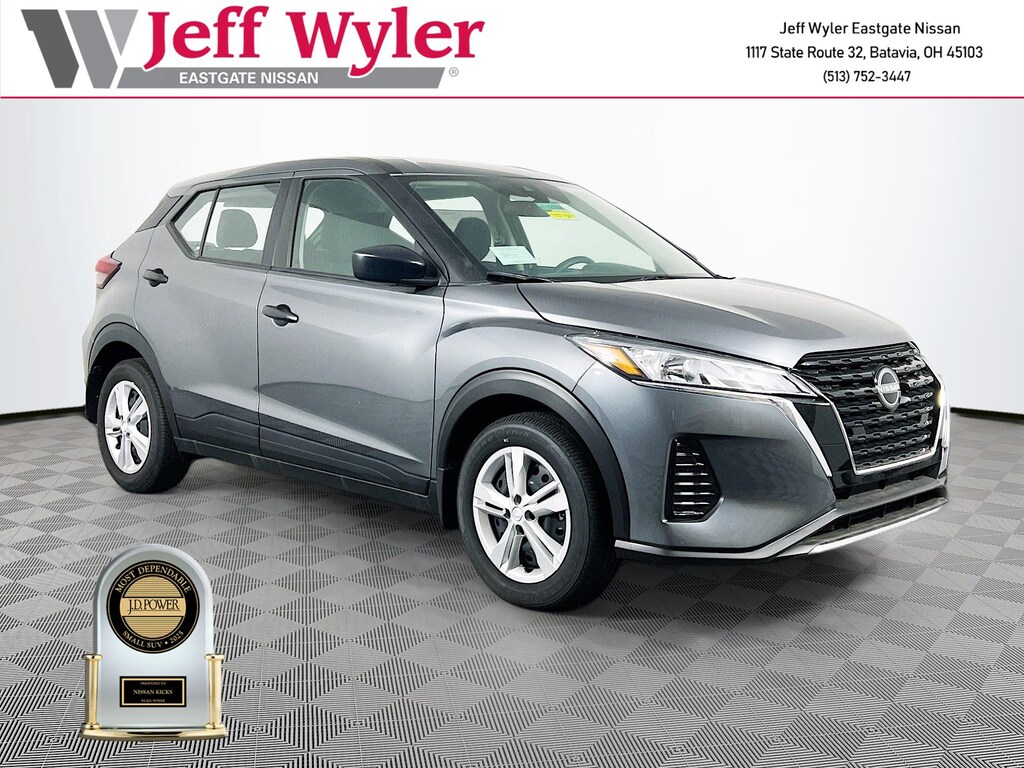 Gun Metallic 2025 Nissan Kicks Play S 1.6L 4-Cylinder DOHC 16V FWD CVT with Xtronic 31/36 City/Highway MPG Jeff Wyler Eastgate Auto Mall is delighted to offer this gorgeous 2025 Nissan Kicks Play S in Gun Metallic. Well equipped with: 6 Speakers, ABS brakes, Air Conditioning, AM/FM radio, Auto High-beam Headlights, Blind Spot Warning, Brake assist, Driver door bin, Driver vanity mirror, Driver's Seat Mounted Armrest, Dual front impact airbags, Dual front side impact airbags, Electronic Stability Control, Front anti-roll bar, Front Bucket Seats, Front reading lights, Front wheel independent suspension, Fully automatic headlights, Illuminated entry, Knee airbag, Low tire pressure warning, Occupant sensing airbag, Outside temperature display, Overhead airbag, Panic alarm, Passenger door bin, Passenger vanity mirror, Power door mirrors, Power steering, Power windows, Radio data system, Rear Parking Sensors, Rear reading lights, Rear side impact airbag, Rear window defroster, Rear window wiper, Remote keyless entry, Speed control, Split folding rear seat, Sport steering wheel, Steering wheel mounted audio controls, Tachometer, Telescoping steering wheel, Tilt steering wheel, Traction control, Trip computer, and Variably intermittent wipers. 31/36 City/Highway MPG