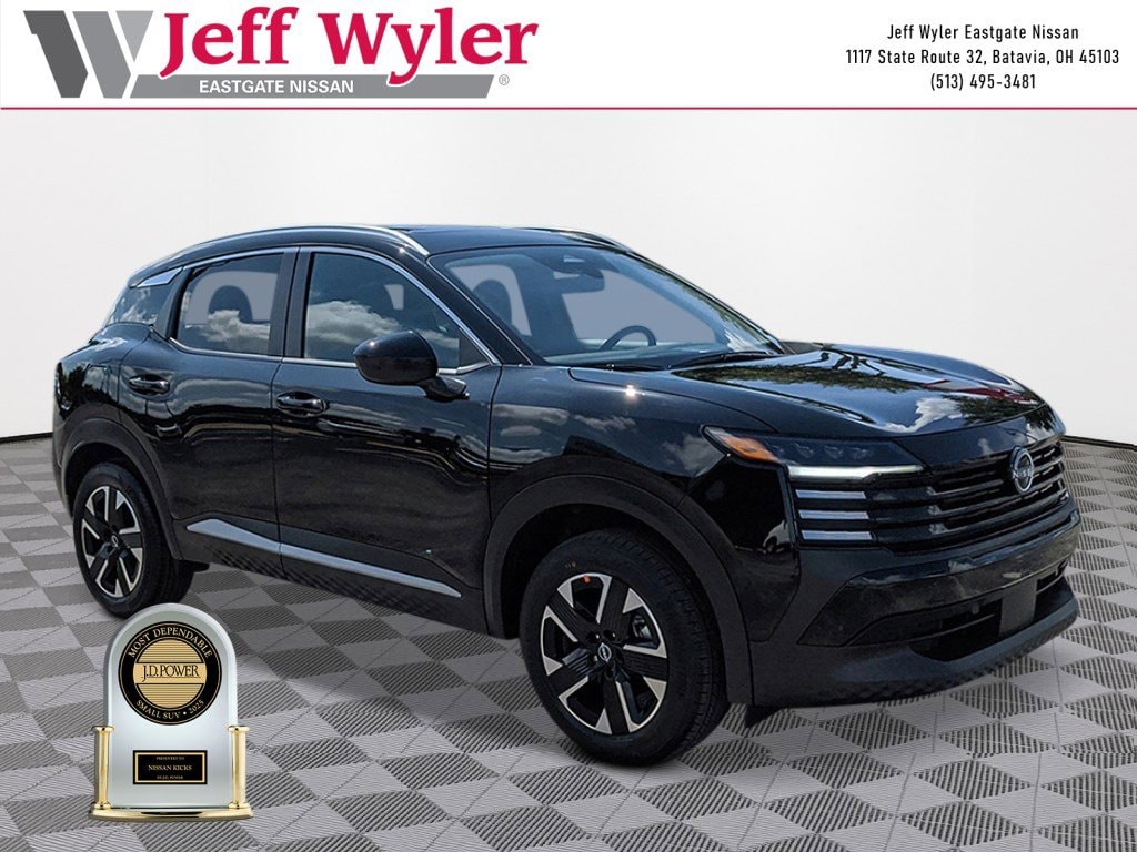 Super Black 2025 Nissan Kicks SV 2.0L DOHC AWD CVT with Xtronic 27/34 City/Highway MPG Jeff Wyler Eastgate Auto Mall is very proud to offer this handsome 2025 Nissan Kicks SV in Super Black. Well equipped with: SV Premium Package (Heated Front Seats, Illuminated Driver & Passenger Sun Visors, Panoramic Moonroof, Remote Engine Start, Roof Rails, Seat Back Pocket, and Sunglass Holder), 17" Alloy Wheels, 4 Speakers, 4-Wheel Disc Brakes, ABS brakes, Air Conditioning, Alloy wheels, AM/FM radio: Sirius, Auto High-beam Headlights, Blind Spot Warning, Brake assist, Bumpers: body-color, Carpeted Floor Mats, Cloth Seat Trim, Door Trim Panel Scuff Plates, Driver door bin, Driver vanity mirror, Dual front impact airbags, Dual front side impact airbags, Electronic Stability Control, Four wheel independent suspension, Front anti-roll bar, Front Bucket Seats, Front Center Armrest, Front reading lights, Fully automatic headlights, Heated door mirrors, Illuminated entry, Knee airbag, Low tire pressure warning, Occupant sensing airbag, Outside temperature display, Overhead airbag, Panic alarm, Passenger door bin, Passenger vanity mirror, Power door mirrors, Power steering, Power windows, Radio data system, Radio: AM/FM Audio System, Rear anti-roll bar, Rear Parking Sensors, Rear reading lights, Rear side impact airbag, Rear window defroster, Rear window wiper, Remote keyless entry, Security system, Speed control, Speed-sensing steering, Split folding rear seat, Spoiler, Sport steering wheel, Steering wheel mounted audio controls, Tachometer, Telescoping steering wheel, Tilt steering wheel, Traction control, Trip computer, Variably intermittent wipers, and Wireless Apple CarPlay/Wireless Android Auto. 27/34 City/Highway MPG Price includes: $1000 - Nissan MY25 New Kicks (SV and SR) Retail/Lease Bonus Cash. Exp. 01/05/2026 $500 - Nissan MWR MY25 New Kicks Bonus Cash - December. Exp. 01/05/2026