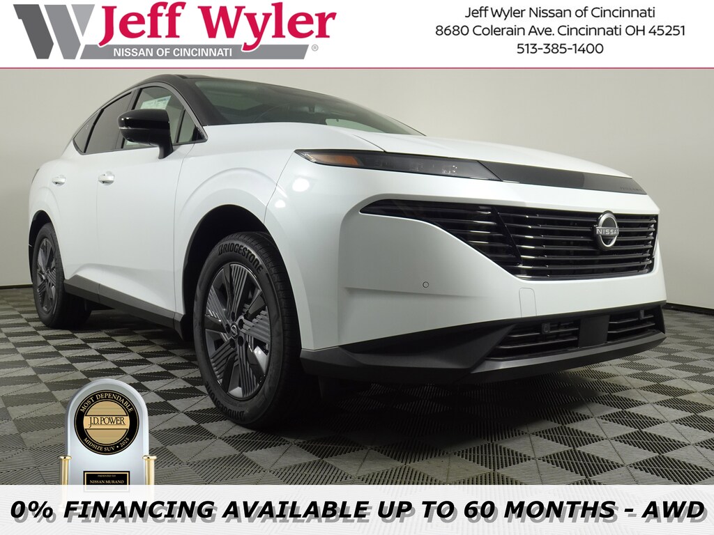 $11,195 off MSRP! Priced below KBB Fair Purchase Price! Everest White Pearl Tricoat/Super Black 2025 Nissan Murano SL AWD 9-Speed Automatic Jeff Wyler Nissan of Cincinnati is very proud to offer this good-looking 2025 Nissan Murano SL in Everest White Pearl Tricoat/Super Black. Well equipped with: Cargo Package (3-Position Cargo Area Protector, Cargo Net, First Aid Kit, and Retractable Cargo Cover), 9-Speed Automatic, AWD, 10 Speakers, 2-Tone w/Premium Paint, 20" Alloy Wheels, 4-Wheel Disc Brakes, ABS brakes, Air Conditioning, Alloy wheels, AM/FM radio: SiriusXM w/360L, Auto High-beam Headlights, Auto-dimming Rear-View mirror, Automatic temperature control, Brake assist, Bumpers: body-color, Carpeted Floor & Cargo Mats, Child-Seat-Sensing Airbag, Compass, Delay-off headlights, Driver door bin, Driver vanity mirror, Dual front impact airbags, Dual front side impact airbags, Electronic Stability Control, Emergency communication system: NissanConnect Services, Four wheel independent suspension, Front anti-roll bar, Front Bucket Seats, Front Center Armrest, Front dual zone A/C, Front reading lights, Fully automatic headlights, Garage door transmitter: myQ Connected Garage, Grained Splash Guards, Heated door mirrors, Heated Front Bucket Seats, Heated front seats, Heated steering wheel, Illuminated entry, Knee airbag, Low tire pressure warning, Memory seat, Navigation system: NissanConnect with Navigation and Services, Occupant sensing airbag, Outside temperature display, Overhead airbag, Overhead console, Panic alarm, Passenger door bin, Passenger vanity mirror, Power door mirrors, Power driver seat, Power Liftgate, Power moonroof: Panoramic, Power passenger seat, Power steering, Power windows, PVC (Leatherette) Seat Trim, Radio data system, Radio: NissanConnect w/Hybrid Radio, Rear anti-roll bar, Rear reading lights, Rear seat center armrest, Rear side impact airbag, Rear window defroster, Rear window wiper, Remote keyless entry, Security system, Speed control, Speed-Sensitive Wipers, Split folding rear seat, Spoiler, Steering wheel mounted audio controls, Tachometer, Telescoping steering wheel, Tilt steering wheel, Traction control, Trip computer, Turn signal indicator mirrors, USB Charging Cables, Variably intermittent wipers, and Wireless Apple CarPlay/Wireless Android Auto. I4 9-Speed Automatic, AWD.21/27 City/Highway MPGWyler Family First Package Includes: NanoCure Appearance Protection: Exterior & Interior Chemical Sealant Applied to Protect Against Environmental Hazards (7 Year Warranty Coverage). Pulse- Rear end Collision Avoidance System Theft Deterrent Strategy gives you 5 Years of Coverage against vehicle Theft, Offering up to a $5,000 benefit. Price includes: $5000 - Nissan Customer Cash. Exp. 01/05/2026