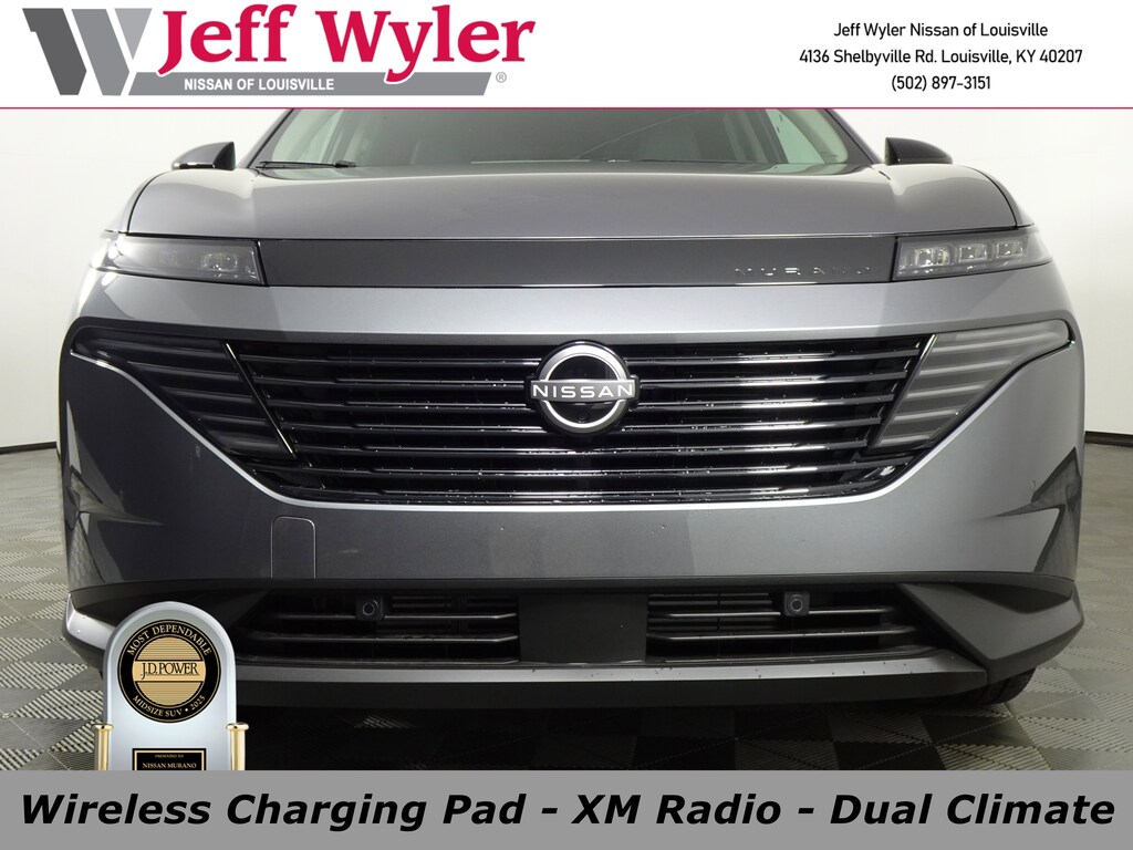 Jeff Wyler Nissan of Louisville is honored to offer this good-looking 2025 Nissan Murano SV in Gun Metallic. Well equipped with: 9-Speed Automatic, AWD, 20" Alloy Wheels, 4-Wheel Disc Brakes, 6 Speakers, ABS brakes, Air Conditioning, Alloy wheels, AM/FM radio: SiriusXM, Auto High-beam Headlights, Automatic temperature control, Brake assist, Bumpers: body-color, Carpeted Floor & Cargo Mats, Child-Seat-Sensing Airbag, Compass, Delay-off headlights, Driver door bin, Driver vanity mirror, Dual front impact airbags, Dual front side impact airbags, Electronic Stability Control, Four wheel independent suspension, Front anti-roll bar, Front Bucket Seats, Front Center Armrest, Front dual zone A/C, Front reading lights, Fully automatic headlights, Grained Splash Guards, Heated door mirrors, Heated Front Bucket Seats, Heated front seats, Illuminated entry, Knee airbag, Low tire pressure warning, Occupant sensing airbag, Outside temperature display, Overhead airbag, Overhead console, Panic alarm, Passenger door bin, Passenger vanity mirror, Power door mirrors, Power driver seat, Power Liftgate, Power passenger seat, Power steering, Power windows, PVC (Leatherette) Seat Trim, Radio data system, Radio: NissanConnect, Rear anti-roll bar, Rear reading lights, Rear seat center armrest, Rear side impact airbag, Rear window defroster, Rear window wiper, Remote keyless entry, Security system, Speed control, Speed-Sensitive Wipers, Split folding rear seat, Spoiler, Steering wheel mounted audio controls, Tachometer, Telescoping steering wheel, Tilt steering wheel, Traction control, Trip computer, USB Charging Cables, Variably intermittent wipers, Wheels: 20" Alloy (W10), and Wireless Apple CarPlay/Wireless Android Auto.2025 Nissan Murano SV Gun Metallic Wyler Family First Package Includes: NanoCure Appearance Protection: Exterior & Interior Chemical Sealant Applied to Protect Against Environmental Hazards (7 Year Warranty Coverage). Pulse- Rear end Collision Avoidance System Theft Deterrent Strategy gives you 5 Years of Coverage against vehicle Theft, Offering up to a $5,000 benefit. 9-Speed Automatic, AWD. Customer's May Not Qualify for All Rebates. Prices Do Not Include Tax, License. $5000 - Nissan Customer Cash. Exp. 01/05/2026
