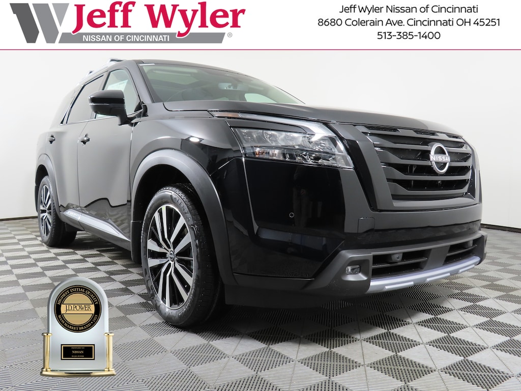 $10,604 off MSRP! Priced below KBB Fair Purchase Price! Super Black 2025 Nissan Pathfinder Platinum 4WD 9-Speed Automatic Jeff Wyler Nissan of Cincinnati is pleased to offer this wonderful-looking 2025 Nissan Pathfinder Platinum in Super Black. Well equipped with: Black Appearance Package (Black Grille and Black Liftgate Emblems), Cargo Package (Cargo Area Protector, Cargo Net, and First Aid), Lighting Package (Illuminated Kick Plate and Welcome Lighting), 4WD, 13 Speakers, 3rd row seats: bench, 4-Wheel Disc Brakes, ABS brakes, Air Conditioning, Alloy wheels, AM/FM radio: SiriusXM, Auto High-beam Headlights, Auto tilt-away steering wheel, Auto-dimming Rear-View mirror, Automatic temperature control, Bench Seat Carpeted Floor Mats (set of 4), Bodyside moldings, Bose Premium Audio System, Brake assist, Bumpers: body-color, Climate Controlled Front Bucket Seats, Cross Bars, Delay-off headlights, Driver door bin, Driver vanity mirror, Dual front impact airbags, Dual front side impact airbags, Electronic Stability Control, Emergency communication system, Exterior Parking Camera Rear, Four wheel independent suspension, Front anti-roll bar, Front Bucket Seats, Front Center Armrest, Front dual zone A/C, Front reading lights, Fully automatic headlights, Garage door transmitter: HomeLink, Heads-Up Display, Heated door mirrors, Heated front seats, Heated rear seats, Heated steering wheel, Illuminated entry, Knee airbag, Leather steering wheel, LED Fog Lamps, Low tire pressure warning, Memory seat, Navigation system: NissanConnect with Navigation and Services, NissanConnect featuring Apple CarPlay and Android Auto, NissanConnect with Navigation and Services, Occupant sensing airbag, Outside temperature display, Overhead airbag, Overhead console, Panic alarm, Passenger door bin, Passenger vanity mirror, Power door mirrors, Power driver seat, Power Liftgate, Power moonroof, Power passenger seat, Power steering, Power windows, Radio data system, Radio: AM/FM Audio System, Rain sensing wipers, Rear air conditioning, Rear anti-roll bar, Rear reading lights, Rear seat center armrest, Rear side impact airbag, Rear window defroster, Rear window wiper, Reclining 3rd row seat, Remote keyless entry, Security system, Semi-Aniline Leather-Appointed Seating Surfaces, Speed control, Speed-sensing steering, Speed-Sensitive Wipers, Split folding rear seat, Spoiler, Steering wheel memory, Steering wheel mounted audio controls, Tachometer, Telescoping steering wheel, Tilt steering wheel, Traction control, Trip computer, Turn signal indicator mirrors, Variably intermittent wipers, Ventilated front seats, and Wheels: 20" x 8J Machined Alloy. 3.5L V6 DOHC 4WD.Wyler Family First Package Includes: NanoCure Appearance Protection: Exterior & Interior Chemical Sealant Applied to Protect Against Environmental Hazards (7 Year Warranty Coverage). Pulse- Rear end Collision Avoidance System Theft Deterrent Strategy gives you 5 Years of Coverage against vehicle Theft, Offering up to a $5,000 benefit. Price includes: $5000 - Nissan Customer Cash. Exp. 01/05/2026
