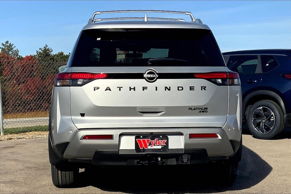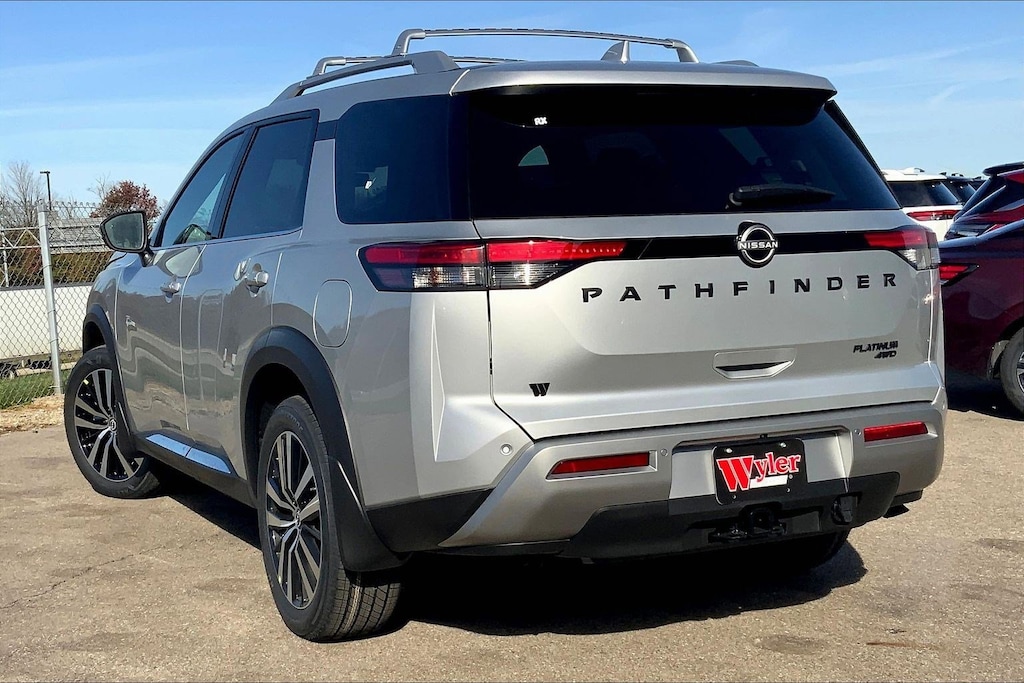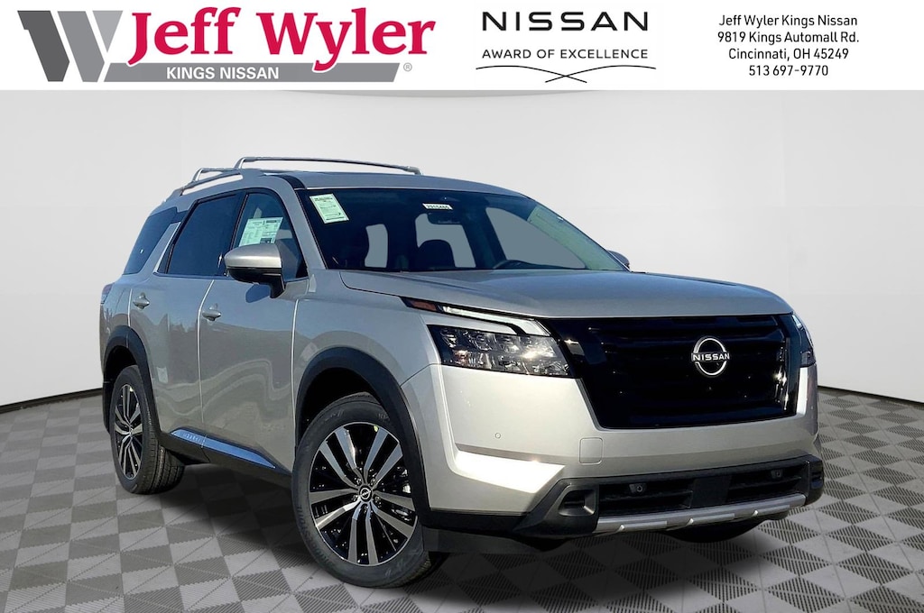 $9,137 off MSRP! Jeff Wyler Kings Nissan is excited to offer this fantastic 2025 Nissan Pathfinder Platinum in Brilliant Silver Metallic. Well equipped with: Black Appearance Package (Black Grille and Black Liftgate Emblems), Cargo Package (Cargo Area Protector, Cargo Net, and First Aid), 4WD, 13 Speakers, 3rd row seats: bench, 4-Wheel Disc Brakes, ABS brakes, Air Conditioning, Alloy wheels, AM/FM radio: SiriusXM, Auto High-beam Headlights, Auto tilt-away steering wheel, Auto-dimming Rear-View mirror, Automatic temperature control, Bench Seat Carpeted Floor Mats (Set of 4), Bodyside moldings, Bose Premium Audio System, Brake assist, Bumpers: body-color, Climate Controlled Front Bucket Seats, Cross Bars, Delay-off headlights, Driver door bin, Driver vanity mirror, Dual front impact airbags, Dual front side impact airbags, Electronic Stability Control, Emergency communication system, Exterior Parking Camera Rear, Four wheel independent suspension, Front anti-roll bar, Front Bucket Seats, Front Center Armrest, Front dual zone A/C, Front reading lights, Fully automatic headlights, Garage door transmitter: HomeLink, Heads-Up Display, Heated door mirrors, Heated front seats, Heated rear seats, Heated steering wheel, Illuminated entry, Knee airbag, Leather steering wheel, Low tire pressure warning, Memory seat, Navigation system: NissanConnect with Navigation and Services, NissanConnect featuring Apple CarPlay and Android Auto, NissanConnect w/Navigation & Services, Occupant sensing airbag, Outside temperature display, Overhead airbag, Overhead console, Panic alarm, Passenger door bin, Passenger vanity mirror, Power door mirrors, Power driver seat, Power Liftgate, Power moonroof, Power passenger seat, Power steering, Power windows, Radio data system, Radio: AM/FM Audio System, Rain sensing wipers, Rear air conditioning, Rear anti-roll bar, Rear reading lights, Rear seat center armrest, Rear side impact airbag, Rear window defroster, Rear window wiper, Reclining 3rd row seat, Remote keyless entry, Security system, Semi-Aniline Leather-Appointed Seating Surfaces, Speed control, Speed-sensing steering, Speed-Sensitive Wipers, Split folding rear seat, Spoiler, Steering wheel memory, Steering wheel mounted audio controls, Tachometer, Telescoping steering wheel, Tilt steering wheel, Traction control, Trip computer, Turn signal indicator mirrors, Variably intermittent wipers, Ventilated front seats, and Wheels: 20" x 8J Machined Alloy.Wyler Family First Package Includes: NanoCure Appearance Protection: Exterior & Interior Chemical Sealant Applied to Protect Against Environmental Hazards (7 Year Warranty Coverage). Pulse- Rear end Collision Avoidance System Theft Deterrent Strategy gives you 5 Years of Coverage against vehicle Theft, Offering up to a $5,000 benefit. Used vehicles 10 years of age or newer with less than 100,000 miles are eligible for the Wyler Assurance Program, but eligible vehicles must pass our reconditioning process and multi-point inspection. Provided the vehicle passes inspection, vehicles will be eligible for the 6 month/6,000 mile limited warranty. The 6 month/6,000 mile limited warranty is NOT available on AS-IS vehicles, wholesale vehicles, lease buyback/pass-thru vehicles or un-inspected vehicles. Note that this program can also apply to vehicles where the remaining factory coverage is less than 6 months or 6,000 miles. Please check the Federal Trade Commission (FTC) Buyers guide on the vehicle for full details as to whether or not warranty coverage may apply. Contact Dealer for additional details. The Wyler Assurance 6 month/6,000 Mile limited warranty ends 6 months from the date of the Retail Purchase Agreement (BUYERS ORDER) or when the vehicle's odometer registers 6,000 additional miles to the mileage listed on the BUYERS ORDER, whichever comes first. Your Deductible - The warranty holder on your contract pays the first $100 of each covered rep Price includes: $5000 - Nissan Customer Cash. Exp. 12/01/2025
