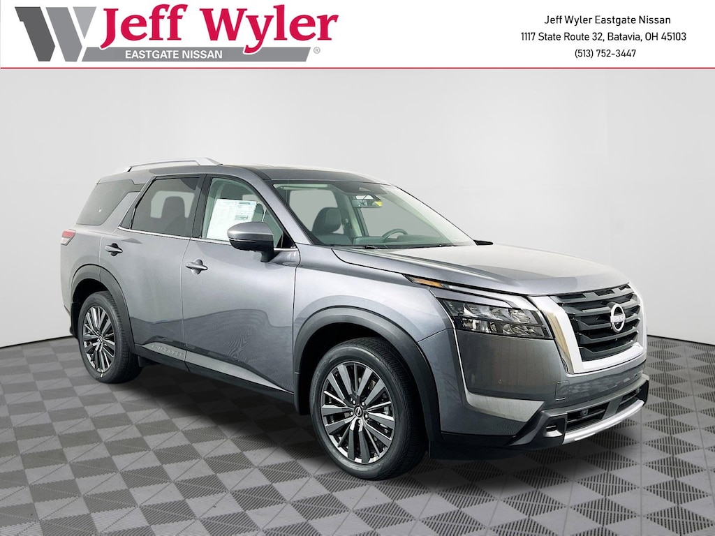 Priced below KBB Fair Purchase Price! Gun Metallic 2025 Nissan Pathfinder SL 3.5L V6 DOHC 4WD 9-Speed Automatic 21/27 City/Highway MPG Jeff Wyler Eastgate Auto Mall is excited to offer this good-looking 2025 Nissan Pathfinder SL in Gun Metallic. Well equipped with: 3rd row seats: bench, 4-Wheel Disc Brakes, 6 Speakers, ABS brakes, Air Conditioning, Alloy wheels, AM/FM radio: SiriusXM, Auto High-beam Headlights, Auto-dimming Rear-View mirror, Automatic temperature control, Brake assist, Bumpers: body-color, Delay-off headlights, Driver door bin, Driver vanity mirror, Dual front impact airbags, Dual front side impact airbags, Electronic Stability Control, Emergency communication system, Exterior Parking Camera Rear, Four wheel independent suspension, Front anti-roll bar, Front Bucket Seats, Front Center Armrest, Front dual zone A/C, Front reading lights, Fully automatic headlights, Garage door transmitter: HomeLink, Heated door mirrors, Heated Front Bucket Seats, Heated front seats, Heated steering wheel, Illuminated entry, Knee airbag, Leather steering wheel, Leather-Appointed Seating Surfaces, Low tire pressure warning, Navigation system: NissanConnect with Navigation and Services, NissanConnect featuring Apple CarPlay and Android Auto, NissanConnect w/Navigation & Services, Occupant sensing airbag, Outside temperature display, Overhead airbag, Overhead console, Panic alarm, Passenger door bin, Passenger vanity mirror, Power door mirrors, Power driver seat, Power Liftgate, Power passenger seat, Power steering, Power windows, Radio data system, Radio: AM/FM Audio System, Rear air conditioning, Rear anti-roll bar, Rear reading lights, Rear seat center armrest, Rear side impact airbag, Rear window defroster, Rear window wiper, Reclining 3rd row seat, Remote keyless entry, Security system, Speed control, Speed-sensing steering, Split folding rear seat, Spoiler, Steering wheel mounted audio controls, Tachometer, Telescoping steering wheel, Tilt steering wheel, Traction control, Trip computer, Turn signal indicator mirrors, Variably intermittent wipers, and Wheels: 18" x 8J Machined Alloy. 21/27 City/Highway MPG Price includes: $5000 - Nissan Customer Cash. Exp. 12/01/2025