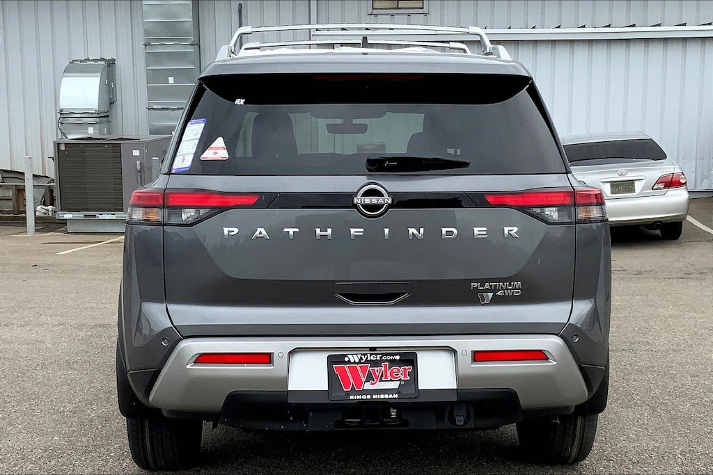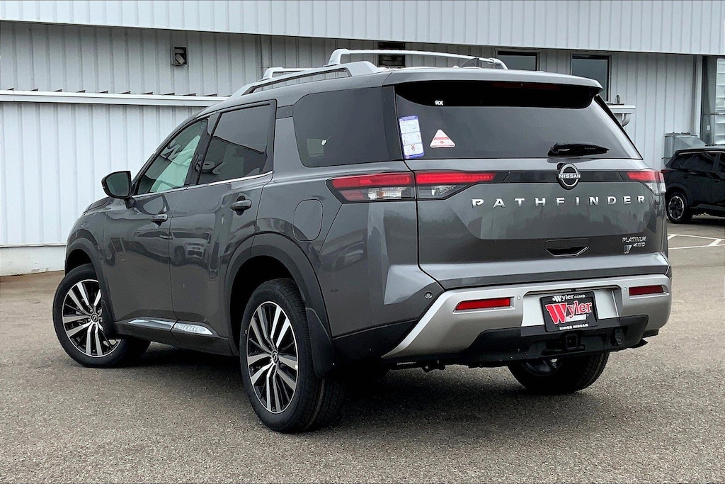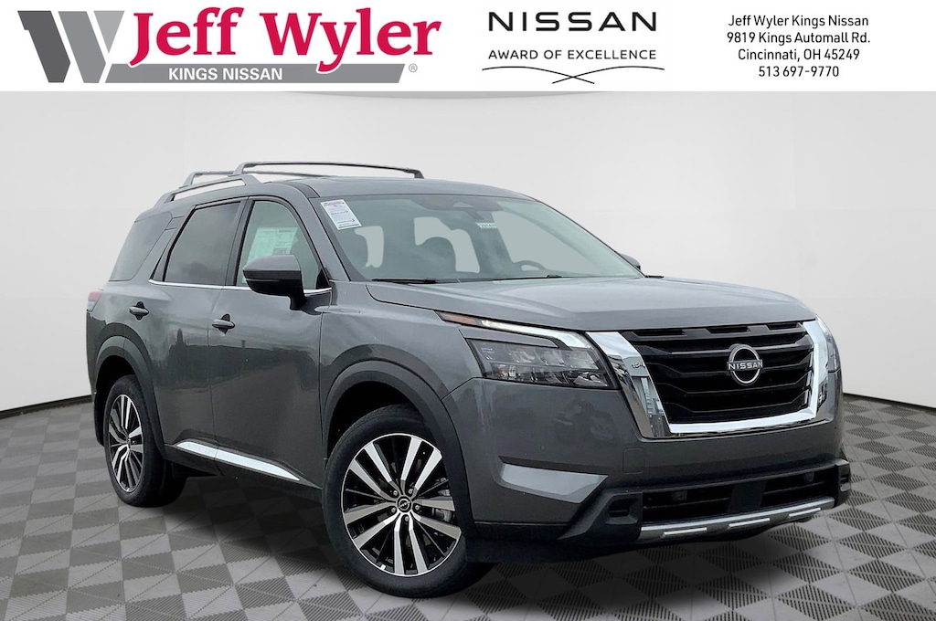 $9,137 off MSRP! Jeff Wyler Kings Nissan is very proud to offer this fantastic-looking 2025 Nissan Pathfinder Platinum in Gun Metallic. Well equipped with: Black Appearance Package (Black Grille and Black Liftgate Emblems), Cargo Package (Cargo Area Protector, Cargo Net, and First Aid), 4WD, 13 Speakers, 3rd row seats: bench, 4-Wheel Disc Brakes, ABS brakes, Air Conditioning, Alloy wheels, AM/FM radio: SiriusXM, Auto High-beam Headlights, Auto tilt-away steering wheel, Auto-dimming Rear-View mirror, Automatic temperature control, Bench Seat Carpeted Floor Mats (Set of 4), Bodyside moldings, Bose Premium Audio System, Brake assist, Bumpers: body-color, Climate Controlled Front Bucket Seats, Cross Bars, Delay-off headlights, Driver door bin, Driver vanity mirror, Dual front impact airbags, Dual front side impact airbags, Electronic Stability Control, Emergency communication system, Exterior Parking Camera Rear, Four wheel independent suspension, Front anti-roll bar, Front Bucket Seats, Front Center Armrest, Front dual zone A/C, Front reading lights, Fully automatic headlights, Garage door transmitter: HomeLink, Heads-Up Display, Heated door mirrors, Heated front seats, Heated rear seats, Heated steering wheel, Illuminated entry, Knee airbag, Leather steering wheel, Low tire pressure warning, Memory seat, Navigation system: NissanConnect with Navigation and Services, NissanConnect featuring Apple CarPlay and Android Auto, NissanConnect w/Navigation & Services, Occupant sensing airbag, Outside temperature display, Overhead airbag, Overhead console, Panic alarm, Passenger door bin, Passenger vanity mirror, Power door mirrors, Power driver seat, Power Liftgate, Power moonroof, Power passenger seat, Power steering, Power windows, Radio data system, Radio: AM/FM Audio System, Rain sensing wipers, Rear air conditioning, Rear anti-roll bar, Rear reading lights, Rear seat center armrest, Rear side impact airbag, Rear window defroster, Rear window wiper, Reclining 3rd row seat, Remote keyless entry, Security system, Semi-Aniline Leather-Appointed Seating Surfaces, Speed control, Speed-sensing steering, Speed-Sensitive Wipers, Split folding rear seat, Spoiler, Steering wheel memory, Steering wheel mounted audio controls, Tachometer, Telescoping steering wheel, Tilt steering wheel, Traction control, Trip computer, Turn signal indicator mirrors, Variably intermittent wipers, Ventilated front seats, and Wheels: 20" x 8J Machined Alloy.Wyler Family First Package Includes: NanoCure Appearance Protection: Exterior & Interior Chemical Sealant Applied to Protect Against Environmental Hazards (7 Year Warranty Coverage). Pulse- Rear end Collision Avoidance System Theft Deterrent Strategy gives you 5 Years of Coverage against vehicle Theft, Offering up to a $5,000 benefit. Used vehicles 10 years of age or newer with less than 100,000 miles are eligible for the Wyler Assurance Program, but eligible vehicles must pass our reconditioning process and multi-point inspection. Provided the vehicle passes inspection, vehicles will be eligible for the 6 month/6,000 mile limited warranty. The 6 month/6,000 mile limited warranty is NOT available on AS-IS vehicles, wholesale vehicles, lease buyback/pass-thru vehicles or un-inspected vehicles. Note that this program can also apply to vehicles where the remaining factory coverage is less than 6 months or 6,000 miles. Please check the Federal Trade Commission (FTC) Buyers guide on the vehicle for full details as to whether or not warranty coverage may apply. Contact Dealer for additional details. The Wyler Assurance 6 month/6,000 Mile limited warranty ends 6 months from the date of the Retail Purchase Agreement (BUYERS ORDER) or when the vehicle's odometer registers 6,000 additional miles to the mileage listed on the BUYERS ORDER, whichever comes first. Your Deductible - The warranty holder on your contract pays the first $100 of each covered repai Price includes: $5000 - Nissan Customer Cash. Exp. 11/03/2025