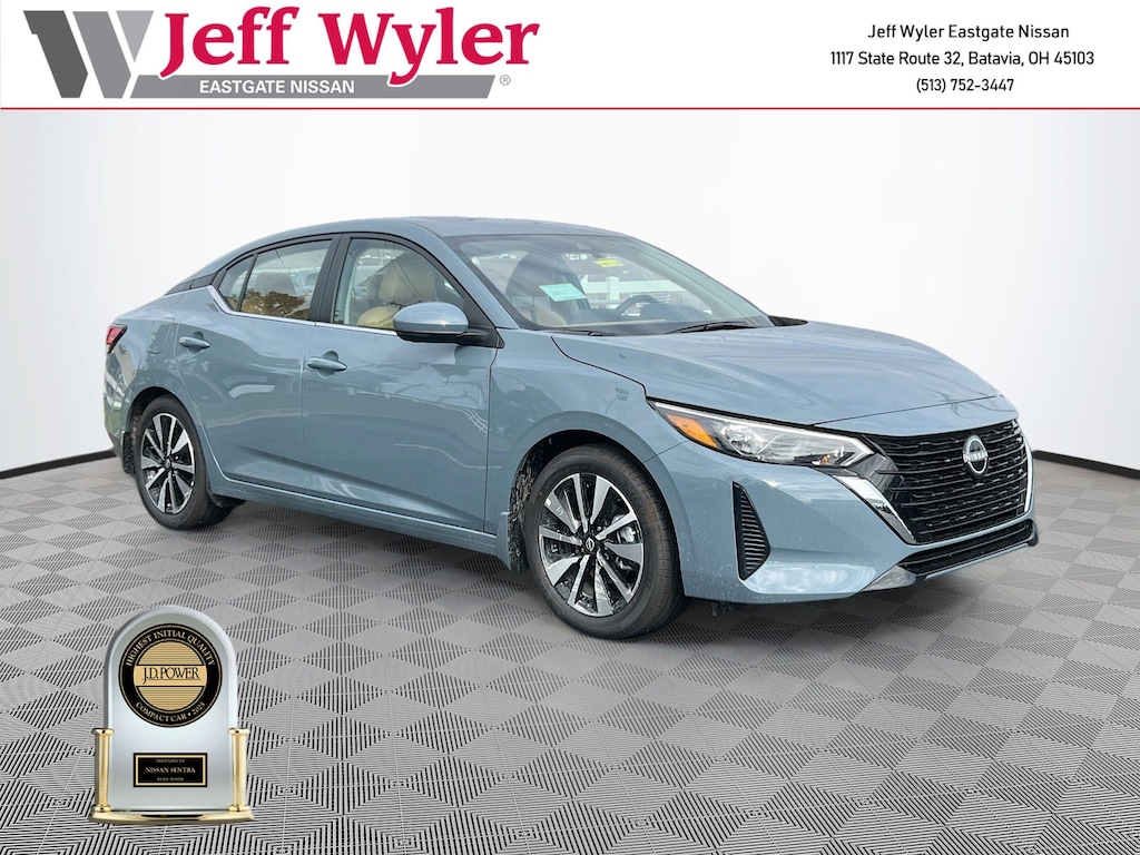 Atlantic Gray Metallic 2025 Nissan Sentra SV 2.0L I4 DOHC FWD CVT with Xtronic 30/40 City/Highway MPG Jeff Wyler Eastgate Auto Mall is pleased to offer this great-looking 2025 Nissan Sentra SV in Atlantic Gray Metallic. Well equipped with: All-Weather Package (Dual Zone Auto Climate Control, Heated Exterior Mirrors, Heated Front Seats, Leather-Wrapped Heated Steering Wheel, and Remote Engine Start), SV Premium Package (17" Alloy Wheels, 6-Way Power Driver's Seat, Bose Premium Audio System with 8 Speakers, Intelligent Around View Monitor (I-AVM), Leather Shift Knob, Power Sliding Glass Moonroof with Tilt Feature, Quilted Leather Seat Trim, Rear Armrest with 2 Cupholders, and Turn Signal Indicators on Exterior Mirrors), Trunk Package (Hide-A-Way Trunk Net), 16" Alloy Wheels, 4-Wheel Disc Brakes, 8 Speakers, ABS brakes, Air Conditioning, Alloy wheels, AM/FM radio: SiriusXM, Auto High-beam Headlights, Blind Spot Warning, Body Colored Splash Guards (4-Piece), Brake assist, Bumpers: body-color, Carpeted Floor Mats with Trunk Mat, Clear Rear Bumper Protector, Delay-off headlights, Door Sill Plates, Driver door bin, Driver vanity mirror, Dual front impact airbags, Dual front side impact airbags, Electronic Stability Control, Four wheel independent suspension, Front anti-roll bar, Front Bucket Seats, Front Center Armrest, Front reading lights, Fully automatic headlights, Illuminated entry, Knee airbag, Low tire pressure warning, Nissan Connect Services, NissanConnect featuring Apple CarPlay and Android Auto, NissanConnect Services, Occupant sensing airbag, Outside temperature display, Overhead airbag, Overhead console, Panic alarm, Passenger door bin, Passenger vanity mirror, Power door mirrors, Power steering, Power windows, Premium Paint, Radio data system, Radio: AM/FM with RDS/MP3/Aux-in, Rear anti-roll bar, Rear Parking Sensors, Rear side impact airbag, Rear window defroster, Remote keyless entry, Security system, Speed control, Speed-sensing steering, Split folding rear seat, Steering wheel mounted audio controls, Tachometer, Telescoping steering wheel, Tilt steering wheel, Traction control, Trip computer, Upgraded Cloth Seat Trim, Variably intermittent wipers, and Wi-Fi Hotspot. 30/40 City/Highway MPG Price includes: $500 - Nissan MY25 Sentra Bonus Cash. Exp. 01/05/2026