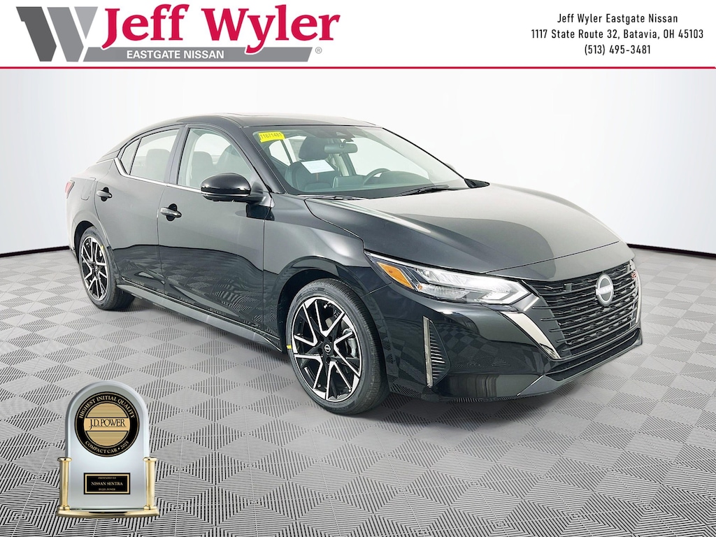 Super Black 2025 Nissan Sentra SR 2.0L I4 DOHC FWD CVT with Xtronic 30/38 City/Highway MPG Jeff Wyler Eastgate Auto Mall is very proud to offer this wonderful-looking 2025 Nissan Sentra SR in Super Black. Well equipped with: SR Premium Package (6-Way Power Driver's Seat, Bose Premium Audio System with 8 Speakers, Intelligent Around View Monitor (I-AVM), Leather Heated Steering Wheel, Leatherette Seat Trim, NissanConnect Services, Power Sliding Glass Moonroof with Tilt Feature, Sunvisors with Illuminated Vanity Mirrors, and Wi-Fi Hotspot), 18" Alloy Wheels, 4-Wheel Disc Brakes, 8 Speakers, ABS brakes, Air Conditioning, Alloy wheels, AM/FM radio: SiriusXM, Auto High-beam Headlights, Automatic temperature control, Blind Spot Warning, Brake assist, Bumpers: body-color, Carpeted Floor Mats with Trunk Mat, Clear Rear Bumper Protector, Delay-off headlights, Door Sill Plates, Driver door bin, Driver vanity mirror, Dual front impact airbags, Dual front side impact airbags, Electronic Stability Control, Four wheel independent suspension, Front anti-roll bar, Front Bucket Seats, Front Center Armrest, Front dual zone A/C, Front reading lights, Fully automatic headlights, Heated door mirrors, Heated Front Bucket Seats, Heated front seats, Illuminated entry, Knee airbag, Leather Shift Knob, Low tire pressure warning, NissanConnect featuring Apple CarPlay and Android Auto, Occupant sensing airbag, Outside temperature display, Overhead airbag, Overhead console, Panic alarm, Passenger door bin, Passenger vanity mirror, Power door mirrors, Power steering, Power windows, Radio data system, Radio: AM/FM with RDS/MP3/Aux-in, Rear anti-roll bar, Rear Parking Sensors, Rear seat center armrest, Rear side impact airbag, Rear window defroster, Remote keyless entry, Security system, Speed control, Speed-sensing steering, Split folding rear seat, Spoiler, Sport Cloth Seat Trim, Steering wheel mounted audio controls, Tachometer, Telescoping steering wheel, Tilt steering wheel, Traction control, Trip computer, Turn signal indicator mirrors, and Variably intermittent wipers. 30/38 City/Highway MPG Price includes: $500 - Nissan MY25 Sentra Bonus Cash. Exp. 01/05/2026 $500 - Nissan National Holiday Bonus Cash. Exp. 01/02/2026