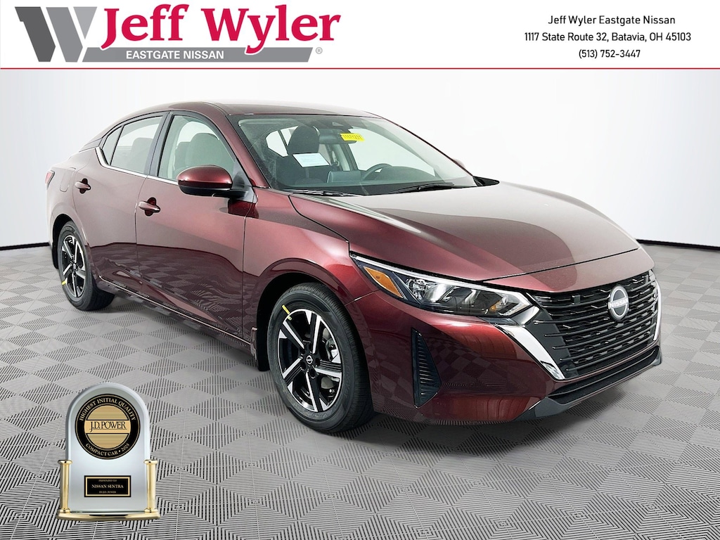Rosewood Metallic 2025 Nissan Sentra SV 2.0L I4 DOHC FWD CVT with Xtronic 30/40 City/Highway MPG Jeff Wyler Eastgate Auto Mall is very proud to offer this wonderful 2025 Nissan Sentra SV in Rosewood Metallic. Well equipped with: All-Weather Package (Dual Zone Auto Climate Control, Heated Exterior Mirrors, Heated Front Seats, Leather-Wrapped Heated Steering Wheel, and Remote Engine Start), 16" Alloy Wheels, 4-Wheel Disc Brakes, 8 Speakers, ABS brakes, Air Conditioning, Alloy wheels, AM/FM radio: SiriusXM, Auto High-beam Headlights, Blind Spot Warning, Body Colored Splash Guards (4-Piece), Brake assist, Bumpers: body-color, Carpeted Floor Mats with Trunk Mat, Clear Rear Bumper Protector, Delay-off headlights, Door Sill Plates, Driver door bin, Driver vanity mirror, Dual front impact airbags, Dual front side impact airbags, Electronic Stability Control, Four wheel independent suspension, Front anti-roll bar, Front Bucket Seats, Front Center Armrest, Front reading lights, Fully automatic headlights, Illuminated entry, Knee airbag, Low tire pressure warning, NissanConnect featuring Apple CarPlay and Android Auto, Occupant sensing airbag, Outside temperature display, Overhead airbag, Overhead console, Panic alarm, Passenger door bin, Passenger vanity mirror, Power door mirrors, Power steering, Power windows, Radio data system, Radio: AM/FM with RDS/MP3/Aux-in, Rear anti-roll bar, Rear Parking Sensors, Rear side impact airbag, Rear window defroster, Remote keyless entry, Security system, Speed control, Speed-sensing steering, Split folding rear seat, Steering wheel mounted audio controls, Tachometer, Telescoping steering wheel, Tilt steering wheel, Traction control, Trip computer, Upgraded Cloth Seat Trim, and Variably intermittent wipers. 30/40 City/Highway MPG Price includes: $500 - Nissan MY25 Sentra Bonus Cash. Exp. 01/05/2026