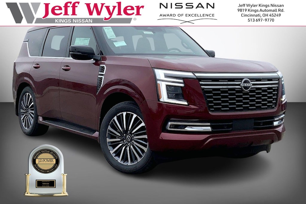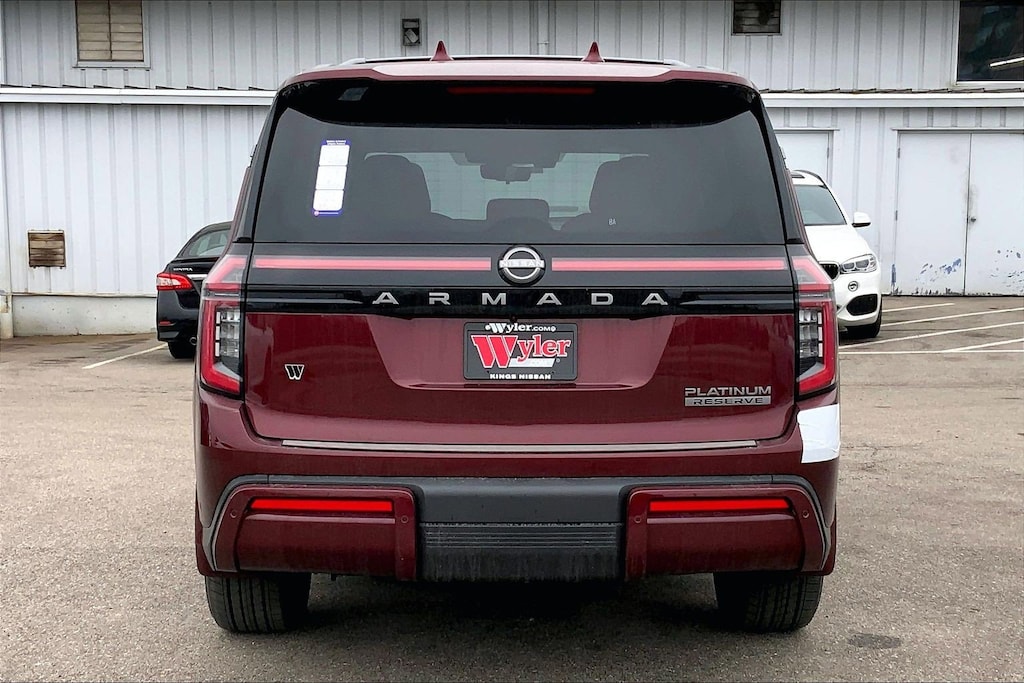 $6,902 off MSRP! Jeff Wyler Kings Nissan is excited to offer this beautiful 2026 Nissan Armada Platinum Reserve in Coulis Red Pearl. Well equipped with: Accent Package (Illuminated Cargo Scuff Plates), Convenience Package, 4WD, 12 Speakers, 3rd row seats: split-bench, 4-Wheel Disc Brakes, ABS brakes, Adaptive suspension, Air Conditioning, Alloy wheels, AM/FM radio: SiriusXM w/360L, Anti-whiplash front head restraints, Apple CarPlay/Android Auto, Auto High-beam Headlights, Auto tilt-away steering wheel, Auto-dimming door mirrors, Auto-dimming Rear-View mirror, Auto-leveling suspension, Automatic temperature control, Brake assist, Bumpers: body-color, Carpeted Floor Mats with Captain Chairs, Center Front Spoiler, Climate Controlled Heated and Ventilated Front Seats, Compass, Cross Bars, Delay-off headlights, Driver door bin, Driver vanity mirror, Dual front impact airbags, Dual front side impact airbags, Electronic Stability Control, Emergency communication system: NissanConnect Services, Four wheel independent suspension, Front anti-roll bar, Front Bucket Seats, Front Center Armrest, Front dual zone A/C, Front fog lights, Front reading lights, Fully automatic headlights, Garage door transmitter: HomeLink, Genuine wood dashboard insert, Heads-Up Display, Heated door mirrors, Heated front seats, Heated rear seats, Heated steering wheel, HVAC memory, Illuminated entry, Illuminated Kick Plates, Knee airbag, Leather steering wheel, Low tire pressure warning, Memory seat, Navigation system: Google Maps, Occupant sensing airbag, Outside temperature display, Overhead airbag, Overhead console, Panic alarm, Passenger door bin, Passenger vanity mirror, Power door mirrors, Power driver seat, Power Liftgate, Power moonroof, Power passenger seat, Power steering, Power windows, Premium Paint, ProPILOT Assist 2.1, Quilted Leather Seat Trim, Radio: NissanConnect with SiriusXM 360L, Rain sensing wipers, Rear air conditioning, Rear anti-roll bar, Rear Bumper Protector, Rear reading lights, Rear window defroster, Rear window wiper, Reclining 3rd row seat, Remote keyless entry, Security system, Speed control, Speed-sensing steering, Speed-Sensitive Wipers, Splash Guards, Split folding rear seat, Spoiler, Steering wheel memory, Steering wheel mounted audio controls, Tachometer, Telescoping steering wheel, Tilt steering wheel, Traction control, Trip computer, Turn signal indicator mirrors, Variably intermittent wipers, Ventilated front seats, Voltmeter, and Wheels: 22" x 8.5J Machined & Painted Alloy.Wyler Family First Package Includes: NanoCure Appearance Protection: Exterior & Interior Chemical Sealant Applied to Protect Against Environmental Hazards (7 Year Warranty Coverage). Pulse- Rear end Collision Avoidance System Theft Deterrent Strategy gives you 5 Years of Coverage against vehicle Theft, Offering up to a $5,000 benefit. Used vehicles 10 years of age or newer with less than 100,000 miles are eligible for the Wyler Assurance Program, but eligible vehicles must pass our reconditioning process and multi-point inspection. Provided the vehicle passes inspection, vehicles will be eligible for the 6 month/6,000 mile limited warranty. The 6 month/6,000 mile limited warranty is NOT available on AS-IS vehicles, wholesale vehicles, lease buyback/pass-thru vehicles or un-inspected vehicles. Note that this program can also apply to vehicles where the remaining factory coverage is less than 6 months or 6,000 miles. Please check the Federal Trade Commission (FTC) Buyers guide on the vehicle for full details as to whether or not warranty coverage may apply. Contact Dealer for additional details. The Wyler Assurance 6 month/6,000 Mile limited warranty ends 6 months from the date of the Retail Purchase Agreement (BUYERS ORDER) or when the vehicle's odometer registers 6,000 additional miles to the mileage listed on the BUYERS ORDER, whichever comes first. Your Deductible - The warranty holder on your contract pays the first $100 of each covered repair.