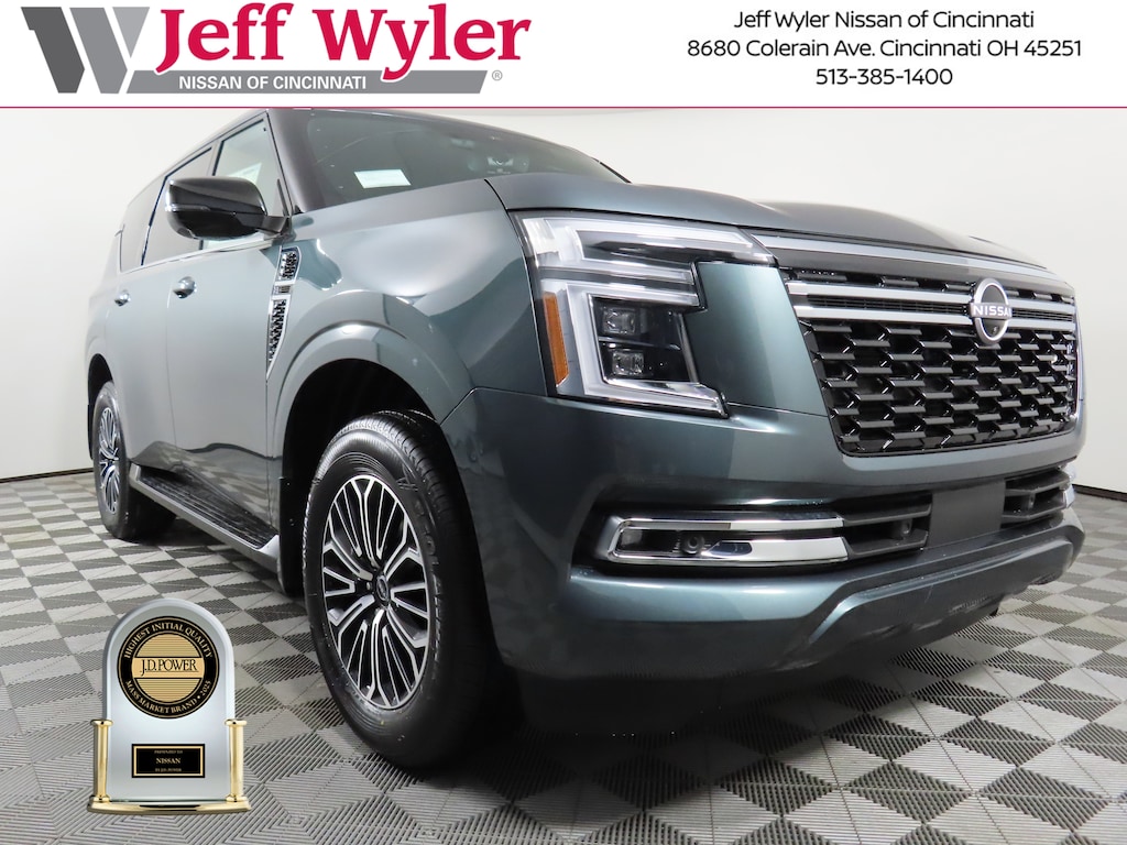 $5,920 off MSRP! Alpine Metallic 2026 Nissan Armada Platinum 4WD 9-Speed Automatic Jeff Wyler Nissan of Cincinnati is honored to offer this attractive 2026 Nissan Armada Platinum in Alpine Metallic. Well equipped with: 4WD, 12 Speakers, 3rd row seats: split-bench, 4-Wheel Disc Brakes, ABS brakes, Air Conditioning, Alloy wheels, AM/FM radio: SiriusXM w/360L, Anti-whiplash front head restraints, Apple CarPlay/Android Auto, Auto High-beam Headlights, Auto tilt-away steering wheel, Auto-dimming door mirrors, Auto-dimming Rear-View mirror, Auto-leveling suspension, Automatic temperature control, Brake assist, Bumpers: body-color, Carpeted Floor Mats with Captain Chairs, Climate Controlled Heated and Ventilated Front Seats, Compass, Cross Bars, Delay-off headlights, Driver door bin, Driver vanity mirror, Dual front impact airbags, Dual front side impact airbags, Electronic Stability Control, Emergency communication system: NissanConnect Services, Four wheel independent suspension, Front anti-roll bar, Front Bucket Seats, Front Center Armrest, Front dual zone A/C, Front fog lights, Front reading lights, Fully automatic headlights, Garage door transmitter: HomeLink, Genuine wood dashboard insert, Heated door mirrors, Heated front seats, Heated rear seats, Heated steering wheel, HVAC memory, Illuminated entry, Illuminated Kick Plates, Knee airbag, Leather steering wheel, Low tire pressure warning, Memory seat, Navigation system: Google Maps, Occupant sensing airbag, Outside temperature display, Overhead airbag, Overhead console, Panic alarm, Passenger door bin, Passenger vanity mirror, Power door mirrors, Power driver seat, Power Liftgate, Power moonroof, Power passenger seat, Power steering, Power windows, Premium Paint, Quilted Leather Seat Trim, Radio: NissanConnect with SiriusXM 360L, Rain sensing wipers, Rear air conditioning, Rear anti-roll bar, Rear Bumper Protector, Rear reading lights, Rear window defroster, Rear window wiper, Reclining 3rd row seat, Remote keyless entry, Security system, Speed control, Speed-sensing steering, Speed-Sensitive Wipers, Splash Guards, Split folding rear seat, Spoiler, Steering wheel memory, Steering wheel mounted audio controls, Tachometer, Telescoping steering wheel, Tilt steering wheel, Traction control, Trip computer, Turn signal indicator mirrors, Variably intermittent wipers, Ventilated front seats, Voltmeter, and Wheels: 20" x 8.5J Machined and Painted Alloy. 3.5L DOHC 4WD.Recent Arrival!Wyler Family First Package Includes: NanoCure Appearance Protection: Exterior & Interior Chemical Sealant Applied to Protect Against Environmental Hazards (7 Year Warranty Coverage). Pulse- Rear end Collision Avoidance System Theft Deterrent Strategy gives you 5 Years of Coverage against vehicle Theft, Offering up to a $5,000 benefit.