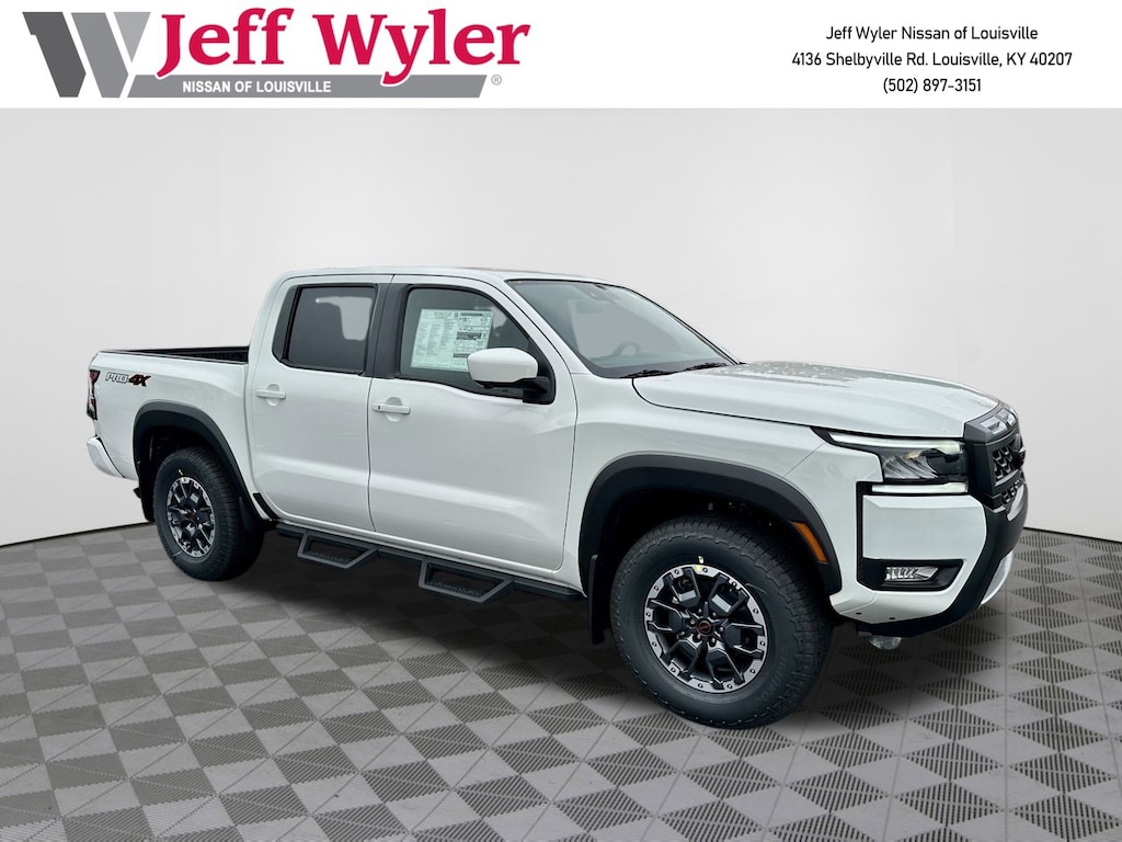 Recent Arrival! Jeff Wyler Nissan of Louisville is honored to offer this wonderful 2026 Nissan Frontier PRO-4X in Glacier White. Well equipped with: Black Accent Package, PRO Premium Package (Leather Seat Trim), PRO-4X Convenience Package, 4WD, 17" Painted Alloy Wheels, 2-Tone Beadlock Style Wheel, 3.692 Axle Ratio, 4-Wheel Disc Brakes, 6 Speakers, ABS brakes, Air Conditioning, Alloy wheels, AM/FM radio: SiriusXM, Anti-whiplash front head restraints, Auto High-beam Headlights, Automatic temperature control, Blind Spot Warning, Brake assist, Bumpers: body-color, Delay-off headlights, Driver door bin, Driver vanity mirror, Dual front impact airbags, Dual front side impact airbags, Electronic Stability Control, Electronic Tailgate Lock, Emergency communication system, Essentials Kit, Front anti-roll bar, Front Bucket Seats, Front Center Armrest, Front dual zone A/C, Front fog lights, Front reading lights, Front wheel independent suspension, Fully automatic headlights, Heated Front Bucket Seats, Heated front seats, Heated steering wheel, Illuminated entry, Knee airbag, Leather steering wheel, Low tire pressure warning, Mud Flaps, Occupant sensing airbag, Off-Road Style Step Rails, Overhead airbag, Overhead console, Panic alarm, Passenger door bin, Passenger vanity mirror, Power door mirrors, Power driver seat, Power passenger seat, Power steering, Power windows, PRO Embroidered Premium Cloth Seat Trim, Radio data system, Radio: SXM/AM/FM/AUX/USB Audio System, Rear anti-roll bar, Rear seat center armrest, Rear side impact airbag, Rear step bumper, Remote keyless entry, Security system, Speed control, Speed-sensing steering, Split folding rear seat, Steering wheel mounted audio controls, Tachometer, Telescoping steering wheel, Tilt steering wheel, Traction control, Trip computer, Variably intermittent wipers, Voltmeter, and Wireless Apple CarPlay/Wireless Android Auto.2026 Nissan Frontier PRO-4X Glacier White Wyler Family First Package Includes: NanoCure Appearance Protection: Exterior & Interior Chemical Sealant Applied to Protect Against Environmental Hazards (7 Year Warranty Coverage). Pulse- Rear end Collision Avoidance System Theft Deterrent Strategy gives you 5 Years of Coverage against vehicle Theft, Offering up to a $5,000 benefit. 4WD. Customer's May Not Qualify for All Rebates. Prices Do Not Include Tax, License. $2000 - Nissan Customer Cash. Exp. 12/01/2025