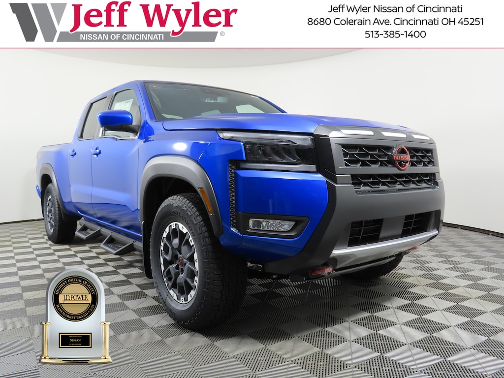 $5,712 off MSRP! Bluestone Pearl 2026 Nissan Frontier PRO-4X 4WD 9-Speed Automatic with Overdrive Jeff Wyler Nissan of Cincinnati is delighted to offer this fantastic 2026 Nissan Frontier PRO-4X in Bluestone Pearl. Well equipped with: Black Accent Package, PRO Premium Package (Auto-Dimming Mirror, Auto-Tilt & Slide Sunroof w/Manual Shade, Fender Premium Audio System w/10 Speakers, HomeLink UGDO, Leather Seat Trim, Nissan Door-to-Door Navigation, Partial Under-Seat Storage Delete, and Traffic Sign Recognition (TSR)), PRO-4X Convenience Package (Heated Steering Wheel, Intelligent Around View Monitor (I-AVM), and Wireless Charging for Personal Devices), 4WD, 17" Painted Alloy Wheels, 2-Tone Beadlock Style Wheel, 3.692 Axle Ratio, 4-Wheel Disc Brakes, 6 Speakers, ABS brakes, Air Conditioning, All Season Floor Mats w/PRO-4X Logo, Alloy wheels, AM/FM radio: SiriusXM, Anti-whiplash front head restraints, Auto High-beam Headlights, Automatic temperature control, Blind Spot Warning, Brake assist, Bumpers: body-color, Delay-off headlights, Driver door bin, Driver vanity mirror, Dual front impact airbags, Dual front side impact airbags, Electronic Stability Control, Electronic Tailgate Lock, Emergency communication system, Essentials Kit, Front anti-roll bar, Front Bucket Seats, Front Center Armrest, Front dual zone A/C, Front fog lights, Front reading lights, Front wheel independent suspension, Fully automatic headlights, Grille Accent Lighting, Heated Front Bucket Seats, Heated front seats, Heated steering wheel, Illuminated entry, Knee airbag, Leather steering wheel, Low tire pressure warning, Mud Flaps, Occupant sensing airbag, Off-Road Style Step Rails, Overhead airbag, Overhead console, Panic alarm, Passenger door bin, Passenger vanity mirror, Power door mirrors, Power driver seat, Power passenger seat, Power steering, Power windows, Premium Paint, PRO Embroidered Premium Cloth Seat Trim, Radio data system, Radio: SXM/AM/FM/AUX/USB Audio System, Rear anti-roll bar, Rear seat center armrest, Rear side impact airbag, Rear step bumper, Remote keyless entry, Security system, Speed control, Speed-sensing steering, Split folding rear seat, Steering wheel mounted audio controls, Tachometer, Telescoping steering wheel, Tilt steering wheel, Traction control, Trip computer, USB Charging Cable Kit, Variably intermittent wipers, Voltmeter, and Wireless Apple CarPlay/Wireless Android Auto. 3.8L DI DOHC 24V V6 4WD.Wyler Family First Package Includes: NanoCure Appearance Protection: Exterior & Interior Chemical Sealant Applied to Protect Against Environmental Hazards (7 Year Warranty Coverage). Pulse- Rear end Collision Avoidance System Theft Deterrent Strategy gives you 5 Years of Coverage against vehicle Theft, Offering up to a $5,000 benefit. Price includes: $2500 - Nissan Customer Cash. Exp. 02/02/2026