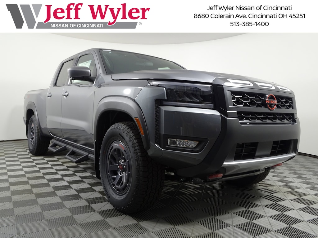 $3,407 off MSRP! Gun Metallic 2026 Nissan Frontier PRO-4X 4WD 9-Speed Automatic with Overdrive Jeff Wyler Nissan of Cincinnati is pleased to offer this terrific-looking 2026 Nissan Frontier PRO-4X in Gun Metallic. Well equipped with: PRO-4X Convenience Package (Heated Steering Wheel, Intelligent Around View Monitor (I-AVM), and Wireless Charging for Personal Devices), 4WD, 17" Painted Alloy Wheels, 3.692 Axle Ratio, 4-Wheel Disc Brakes, 6 Speakers, ABS brakes, Air Conditioning, Alloy wheels, AM/FM radio: SiriusXM, Anti-whiplash front head restraints, Auto High-beam Headlights, Automatic temperature control, Blind Spot Warning, Brake assist, Bumpers: body-color, Delay-off headlights, Driver door bin, Driver vanity mirror, Dual front impact airbags, Dual front side impact airbags, Electronic Stability Control, Electronic Tailgate Lock, Emergency communication system, Essentials Kit, Front anti-roll bar, Front Bucket Seats, Front Center Armrest, Front dual zone A/C, Front fog lights, Front reading lights, Front wheel independent suspension, Fully automatic headlights, Heated Front Bucket Seats, Illuminated entry, Knee airbag, Leather steering wheel, Low tire pressure warning, Mud Flaps, Occupant sensing airbag, Off-Road Style Step Rails, Overhead airbag, Overhead console, Panic alarm, Passenger door bin, Passenger vanity mirror, Power door mirrors, Power driver seat, Power passenger seat, Power steering, Power windows, PRO Embroidered Premium Cloth Seat Trim, Radio data system, Radio: SXM/AM/FM/AUX/USB Audio System, Rear anti-roll bar, Rear seat center armrest, Rear side impact airbag, Rear step bumper, Remote keyless entry, Security system, Speed control, Speed-sensing steering, Split folding rear seat, Steering wheel mounted audio controls, Tachometer, Telescoping steering wheel, Tilt steering wheel, Traction control, Trip computer, Variably intermittent wipers, Voltmeter, and Wireless Apple CarPlay/Wireless Android Auto. 3.8L DI DOHC 24V V6 4WD.Recent Arrival!Wyler Family First Package Includes: NanoCure Appearance Protection: Exterior & Interior Chemical Sealant Applied to Protect Against Environmental Hazards (7 Year Warranty Coverage). Pulse- Rear end Collision Avoidance System Theft Deterrent Strategy gives you 5 Years of Coverage against vehicle Theft, Offering up to a $5,000 benefit. Price includes: $2000 - Nissan Customer Cash. Exp. 11/03/2025