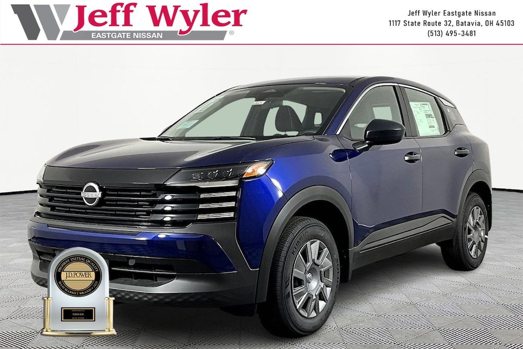Deep Blue Pearl 2026 Nissan Kicks S 2.0L DOHC FWD CVT with Xtronic 28/35 City/Highway MPG Jeff Wyler Eastgate Auto Mall is honored to offer this wonderful 2026 Nissan Kicks S in Deep Blue Pearl. Well equipped with: 4 Speakers, 4-Wheel Disc Brakes, ABS brakes, Air Conditioning, AM/FM radio, Auto High-beam Headlights, Blind Spot Warning, Brake assist, Bumpers: body-color, Carpeted Floor Mats and Cargo Mat, Cloth Seat Trim, Driver door bin, Driver vanity mirror, Driver's Seat Mounted Armrest, Dual front impact airbags, Dual front side impact airbags, Electronic Stability Control, Emergency communication system, Exterior Parking Camera Rear, Front anti-roll bar, Front Bucket Seats, Front reading lights, Front wheel independent suspension, Fully automatic headlights, Illuminated entry, Knee airbag, Low tire pressure warning, NissanConnect featuring Apple CarPlay and Android Auto, Occupant sensing airbag, Outside temperature display, Overhead airbag, Panic alarm, Passenger door bin, Passenger vanity mirror, Power door mirrors, Power steering, Power windows, Radio data system, Radio: AM/FM/SiriusXM Audio System, Rear anti-roll bar, Rear reading lights, Rear side impact airbag, Rear window defroster, Rear window wiper, Remote keyless entry, Security system, Speed control, Speed-sensing steering, Splash Guards, Split folding rear seat, Spoiler, Sport steering wheel, Steering wheel mounted audio controls, Tachometer, Telescoping steering wheel, Tilt steering wheel, Traction control, Trip computer, Variably intermittent wipers, and Wheels: 16" Steel with Full Covers. 28/35 City/Highway MPG