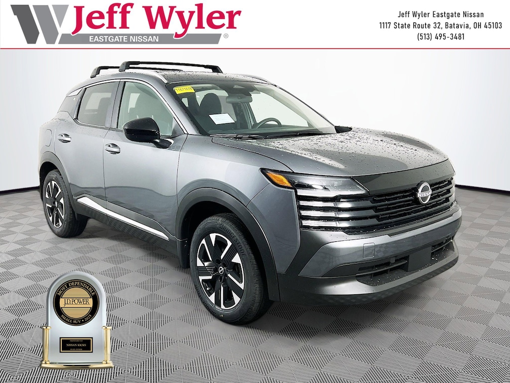 Gun Metallic 2026 Nissan Kicks SV 2.0L DOHC AWD CVT with Xtronic 27/34 City/Highway MPG Jeff Wyler Eastgate Auto Mall is honored to offer this superb-looking 2026 Nissan Kicks SV in Gun Metallic. Well equipped with: Cold Weather Package (Heated Front Seats, Heated Mirrors, and Rear Floor Heater Ducts), 17" Alloy Wheels, 4 Speakers, 4-Wheel Disc Brakes, ABS brakes, Air Conditioning, Alloy wheels, AM/FM radio, Auto High-beam Headlights, Automatic temperature control, Blind Spot Warning, Brake assist, Bumpers: body-color, Carpeted Floor Mats, Cloth Seat Trim, Crossbars, Driver door bin, Driver vanity mirror, Dual front impact airbags, Dual front side impact airbags, Electronic Stability Control, Emergency communication system, Exterior Parking Camera Rear, Four wheel independent suspension, Front anti-roll bar, Front Bucket Seats, Front Center Armrest, Front reading lights, Fully automatic headlights, Illuminated entry, Knee airbag, Low tire pressure warning, NissanConnect featuring Apple CarPlay and Android Auto, Occupant sensing airbag, Outside temperature display, Overhead airbag, Panic alarm, Passenger door bin, Passenger vanity mirror, Power door mirrors, Power steering, Power windows, Radio data system, Radio: AM/FM/SiriusXM Audio System, Rear anti-roll bar, Rear reading lights, Rear side impact airbag, Rear window defroster, Rear window wiper, Remote keyless entry, Security system, Speed control, Speed-sensing steering, Splash Guards, Split folding rear seat, Spoiler, Sport steering wheel, Steering wheel mounted audio controls, Tachometer, Telescoping steering wheel, Tilt steering wheel, Traction control, Trip computer, and Variably intermittent wipers. 27/34 City/Highway MPG Price includes: $1000 - Nissan Customer Cash. Exp. 01/05/2026 $500 - Nissan MWR MY26 Kicks Bonus Cash - December. Exp. 01/05/2026