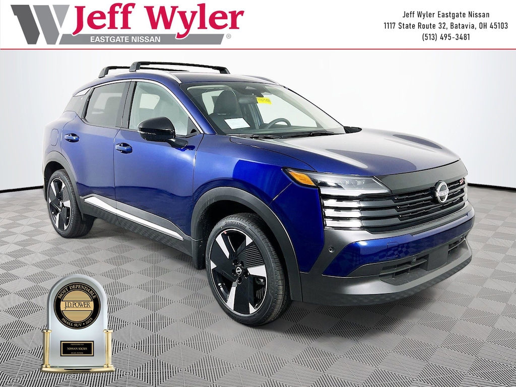 Priced below KBB Fair Purchase Price! Deep Blue Pearl 2026 Nissan Kicks SR 2.0L DOHC AWD CVT with Xtronic 27/34 City/Highway MPG Jeff Wyler Eastgate Auto Mall is honored to offer this charming 2026 Nissan Kicks SR in Deep Blue Pearl. Well equipped with: Cold Weather Package (Heated Front Seats, Heated Mirrors, and Rear Floor Heater Ducts), 17" Alloy Wheels, 19" Alloy Wheels, 4-Wheel Disc Brakes, 6 Speakers, ABS brakes, Air Conditioning, Alloy wheels, AM/FM radio, Auto High-beam Headlights, Automatic temperature control, Brake assist, Bumpers: body-color, Carpeted Floor Mats, Crossbars, Delay-off headlights, Driver door bin, Driver vanity mirror, Dual front impact airbags, Dual front side impact airbags, Electronic Stability Control, Emergency communication system: NissanConnect Services, Exterior Parking Camera Rear, Four wheel independent suspension, Front anti-roll bar, Front Bucket Seats, Front Center Armrest, Front reading lights, Fully automatic headlights, Garage door transmitter: myQ Connected Garage, Illuminated entry, Knee airbag, Leather Shift Knob, Leather steering wheel, Low tire pressure warning, NissanConnect featuring Apple CarPlay and Android Auto, Occupant sensing airbag, Outside temperature display, Overhead airbag, Overhead console, Panic alarm, Passenger door bin, Passenger vanity mirror, Power door mirrors, Power steering, Power windows, Radio data system, Radio: AM/FM/SiriusXM Audio System, Rear anti-roll bar, Rear reading lights, Rear seat center armrest, Rear side impact airbag, Rear window defroster, Rear window wiper, Remote keyless entry, Security system, Speed control, Speed-sensing steering, Splash Guards, Split folding rear seat, Spoiler, Sport Leatherette w/Cloth Insert Seat Trim, Sport steering wheel, Steering wheel mounted audio controls, Tachometer, Telescoping steering wheel, Tilt steering wheel, Traction control, Trip computer, Turn signal indicator mirrors, and Variably intermittent wipers. 27/34 City/Highway MPG Price includes: $1000 - Nissan Customer Cash. Exp. 02/02/2026 $500 - Nissan MWR MY26 Kicks Bonus Cash - January . Exp. 02/02/2026