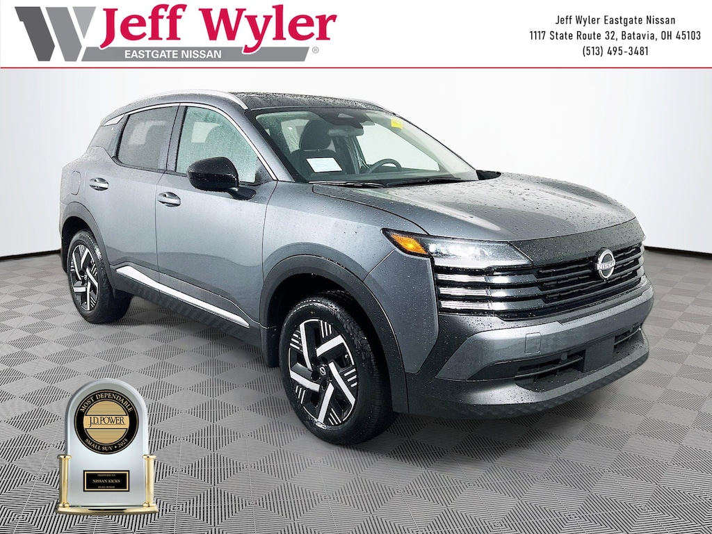Gun Metallic 2026 Nissan Kicks SV 2.0L DOHC FWD CVT with Xtronic 28/35 City/Highway MPG Jeff Wyler Eastgate Auto Mall is very proud to offer this fantastic-looking 2026 Nissan Kicks SV in Gun Metallic. Well equipped with: Cold Weather Package (Heated Front Seats, Heated Mirrors, and Rear Floor Heater Ducts), SV Premium Package (Illuminated Driver & Passenger Sun Visors, Panoramic Moonroof, and Sunglass Holder), 4 Speakers, 4-Wheel Disc Brakes, ABS brakes, Air Conditioning, AM/FM radio, Auto High-beam Headlights, Automatic temperature control, Blind Spot Warning, Brake assist, Bumpers: body-color, Carpeted Floor Mats & Underfloor Protector, Cloth Seat Trim, Driver door bin, Driver vanity mirror, Dual front impact airbags, Dual front side impact airbags, Electronic Stability Control, Emergency communication system, Exterior Parking Camera Rear, Front anti-roll bar, Front Bucket Seats, Front Center Armrest, Front reading lights, Front wheel independent suspension, Fully automatic headlights, Illuminated entry, Knee airbag, Low tire pressure warning, NissanConnect featuring Apple CarPlay and Android Auto, Occupant sensing airbag, Outside temperature display, Overhead airbag, Panic alarm, Passenger door bin, Passenger vanity mirror, Power door mirrors, Power steering, Power windows, Radio data system, Radio: AM/FM/SiriusXM Audio System, Rear anti-roll bar, Rear reading lights, Rear side impact airbag, Rear window defroster, Rear window wiper, Remote keyless entry, Security system, Speed control, Speed-sensing steering, Splash Guards, Split folding rear seat, Spoiler, Sport steering wheel, Steering wheel mounted audio controls, Tachometer, Telescoping steering wheel, Tilt steering wheel, Traction control, Trip computer, Variably intermittent wipers, and Wheels: 17" Steel Flex w/Full Covers. 28/35 City/Highway MPG Price includes: $1000 - Nissan Customer Cash. Exp. 02/02/2026 $500 - Nissan MWR MY26 Kicks Bonus Cash - January . Exp. 02/02/2026