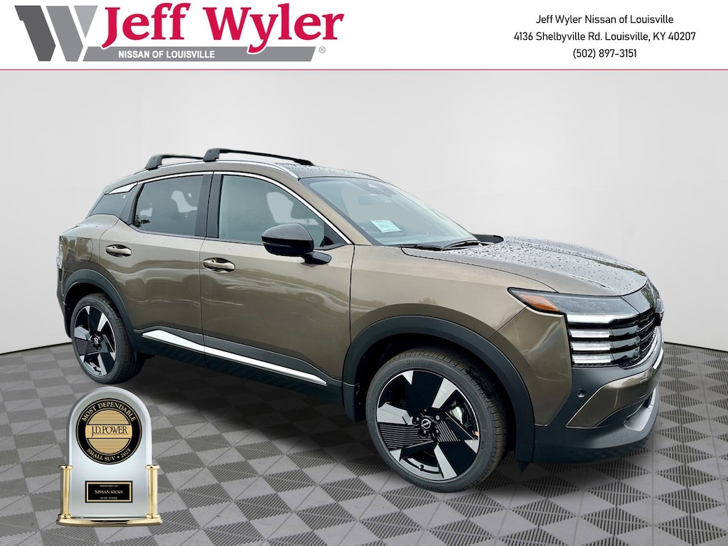 Jeff Wyler Nissan of Louisville is very proud to offer this handsome-looking 2026 Nissan Kicks SR in Canyon Bronze Metallic. Well equipped with: Cold Weather Package (Heated Front Seats, Heated Mirrors, and Rear Floor Heater Ducts), 17" Alloy Wheels, 19" Alloy Wheels, 4-Wheel Disc Brakes, 6 Speakers, ABS brakes, Air Conditioning, Alloy wheels, AM/FM radio, Auto High-beam Headlights, Automatic temperature control, Brake assist, Bumpers: body-color, Carpeted Floor Mats, Crossbars, Delay-off headlights, Driver door bin, Driver vanity mirror, Dual front impact airbags, Dual front side impact airbags, Electronic Stability Control, Emergency communication system: NissanConnect Services, Exterior Parking Camera Rear, Four wheel independent suspension, Front anti-roll bar, Front Bucket Seats, Front Center Armrest, Front reading lights, Fully automatic headlights, Garage door transmitter: myQ Connected Garage, Illuminated entry, Knee airbag, Leather Shift Knob, Leather steering wheel, Low tire pressure warning, NissanConnect featuring Apple CarPlay and Android Auto, Occupant sensing airbag, Outside temperature display, Overhead airbag, Overhead console, Panic alarm, Passenger door bin, Passenger vanity mirror, Power door mirrors, Power steering, Power windows, Radio data system, Radio: AM/FM/SiriusXM Audio System, Rear anti-roll bar, Rear reading lights, Rear seat center armrest, Rear side impact airbag, Rear window defroster, Rear window wiper, Remote keyless entry, Security system, Speed control, Speed-sensing steering, Splash Guards, Split folding rear seat, Spoiler, Sport Leatherette w/Cloth Insert Seat Trim, Sport steering wheel, Steering wheel mounted audio controls, Tachometer, Telescoping steering wheel, Tilt steering wheel, Traction control, Trip computer, Turn signal indicator mirrors, and Variably intermittent wipers.2026 Nissan Kicks SR Canyon Bronze Metallic Wyler Family First Package Includes: NanoCure Appearance Protection: Exterior & Interior Chemical Sealant Applied to Protect Against Environmental Hazards (7 Year Warranty Coverage). Pulse- Rear end Collision Avoidance System Theft Deterrent Strategy gives you 5 Years of Coverage against vehicle Theft, Offering up to a $5,000 benefit. Customer's May Not Qualify for All Rebates. Prices Do Not Include Tax, License. $1000 - Nissan Customer Cash. Exp. 01/05/2026 $500 - Nissan MWR MY26 Kicks Bonus Cash - December. Exp. 01/05/2026