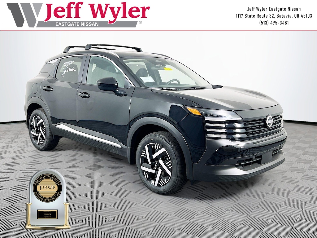 Super Black 2026 Nissan Kicks SV 2.0L DOHC FWD CVT with Xtronic 28/35 City/Highway MPG Jeff Wyler Eastgate Auto Mall is proud to offer this outstanding-looking 2026 Nissan Kicks SV in Super Black. Well equipped with: Cold Weather Package (Heated Front Seats, Heated Mirrors, and Rear Floor Heater Ducts), SV Premium Package (Illuminated Driver & Passenger Sun Visors, Panoramic Moonroof, and Sunglass Holder), 4 Speakers, 4-Wheel Disc Brakes, ABS brakes, Air Conditioning, AM/FM radio, Auto High-beam Headlights, Automatic temperature control, Blind Spot Warning, Brake assist, Bumpers: body-color, Carpeted Floor Mats & Underfloor Protector, Cloth Seat Trim, Crossbars, Driver door bin, Driver vanity mirror, Dual front impact airbags, Dual front side impact airbags, Electronic Stability Control, Emergency communication system, Exterior Parking Camera Rear, Front anti-roll bar, Front Bucket Seats, Front Center Armrest, Front reading lights, Front wheel independent suspension, Fully automatic headlights, Illuminated entry, Knee airbag, Low tire pressure warning, NissanConnect featuring Apple CarPlay and Android Auto, Occupant sensing airbag, Outside temperature display, Overhead airbag, Panic alarm, Passenger door bin, Passenger vanity mirror, Power door mirrors, Power steering, Power windows, Radio data system, Radio: AM/FM/SiriusXM Audio System, Rear anti-roll bar, Rear reading lights, Rear side impact airbag, Rear window defroster, Rear window wiper, Remote keyless entry, Security system, Speed control, Speed-sensing steering, Splash Guards, Split folding rear seat, Spoiler, Sport steering wheel, Steering wheel mounted audio controls, Tachometer, Telescoping steering wheel, Tilt steering wheel, Traction control, Trip computer, Variably intermittent wipers, and Wheels: 17" Steel Flex w/Full Covers. 28/35 City/Highway MPG Price includes: $1000 - Nissan Customer Cash. Exp. 03/02/2026