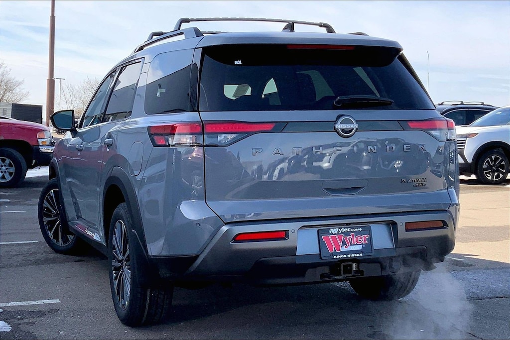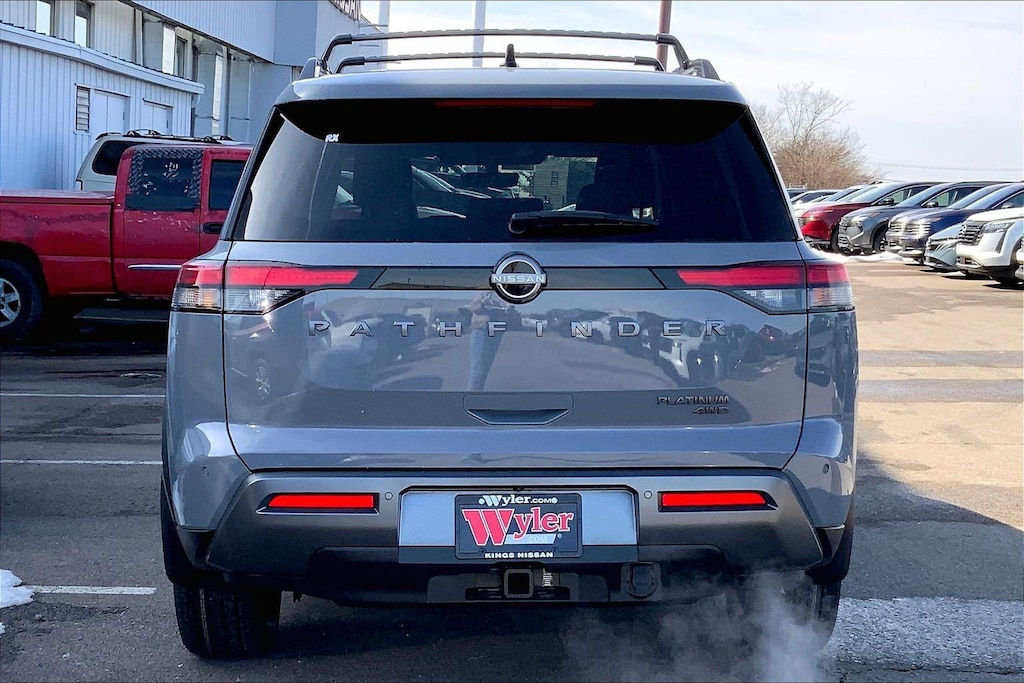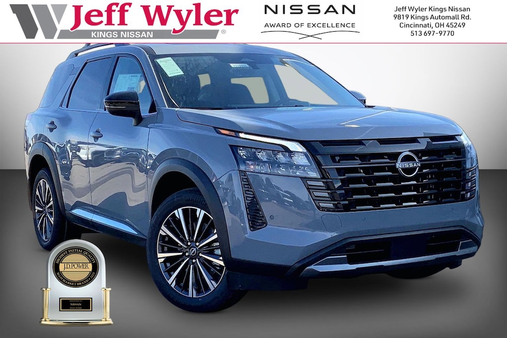 $5,493 off MSRP! Jeff Wyler Kings Nissan is pleased to offer this fantastic 2026 Nissan Pathfinder Platinum in Boulder Gray Pearl. Well equipped with: Cargo Package (Cargo Area Protector, Cargo Net, and First Aid), 4WD, 13 Speakers, 3rd row seats: bench, 4-Piece Black Splash Guards, 4-Wheel Disc Brakes, ABS brakes, Air Conditioning, Alloy wheels, AM/FM radio: SiriusXM w/360L, Auto High-beam Headlights, Auto tilt-away steering wheel, Auto-dimming Rear-View mirror, Automatic temperature control, Bench Seat Carpeted Floor Mats, Bodyside moldings, Bose Premium Audio System, Brake assist, Bumpers: body-color, Climate Controlled Front Bucket Seats, Cross Bars, Delay-off headlights, Driver door bin, Driver vanity mirror, Dual front impact airbags, Dual front side impact airbags, Electronic Stability Control, Emergency communication system: NissanConnect Services, Four wheel independent suspension, Front anti-roll bar, Front Bucket Seats, Front Center Armrest, Front dual zone A/C, Front reading lights, Fully automatic headlights, Garage door transmitter: HomeLink, Heads-Up Display, Heated door mirrors, Heated front seats, Heated rear seats, Heated steering wheel, Illuminated entry, Knee airbag, Low tire pressure warning, Memory seat, Navigation system: NissanConnect with Navigation and Services, NissanConnect featuring Apple CarPlay and Android Auto, Occupant sensing airbag, Outside temperature display, Overhead airbag, Overhead console, Panic alarm, Passenger door bin, Passenger vanity mirror, Power door mirrors, Power driver seat, Power Liftgate, Power moonroof, Power passenger seat, Power steering, Power windows, Premium Paint, Radio data system, Radio: AM/FM Audio System with NissanConnect, Rain sensing wipers, Rear air conditioning, Rear anti-roll bar, Rear reading lights, Rear seat center armrest, Rear side impact airbag, Rear window defroster, Rear window wiper, Reclining 3rd row seat, Remote keyless entry, Security system, Semi-Aniline Leather-Appointed Seating Surfaces, Speed control, Speed-sensing steering, Speed-Sensitive Wipers, Split folding rear seat, Spoiler, Steering wheel memory, Steering wheel mounted audio controls, Tachometer, Telescoping steering wheel, Tilt steering wheel, Traction control, Trip computer, Turn signal indicator mirrors, Variably intermittent wipers, Ventilated front seats, and Wheels: 20" Machined Alloy.Wyler Family First Package Includes: NanoCure Appearance Protection: Exterior & Interior Chemical Sealant Applied to Protect Against Environmental Hazards (7 Year Warranty Coverage). Pulse- Rear end Collision Avoidance System Theft Deterrent Strategy gives you 5 Years of Coverage against vehicle Theft, Offering up to a $5,000 benefit. Used vehicles 10 years of age or newer with less than 100,000 miles are eligible for the Wyler Assurance Program, but eligible vehicles must pass our reconditioning process and multi-point inspection. Provided the vehicle passes inspection, vehicles will be eligible for the 6 month/6,000 mile limited warranty. The 6 month/6,000 mile limited warranty is NOT available on AS-IS vehicles, wholesale vehicles, lease buyback/pass-thru vehicles or un-inspected vehicles. Note that this program can also apply to vehicles where the remaining factory coverage is less than 6 months or 6,000 miles. Please check the Federal Trade Commission (FTC) Buyers guide on the vehicle for full details as to whether or not warranty coverage may apply. Contact Dealer for additional details. The Wyler Assurance 6 month/6,000 Mile limited warranty ends 6 months from the date of the Retail Purchase Agreement (BUYERS ORDER) or when the vehicle's odometer registers 6,000 additional miles to the mileage listed on the BUYERS ORDER, whichever comes first. Your Deductible - The warranty holder on your contract pays the first $100 of each covered repair. Price includes: $2000 - Nissan Customer Cash. Exp. 03/02/2026