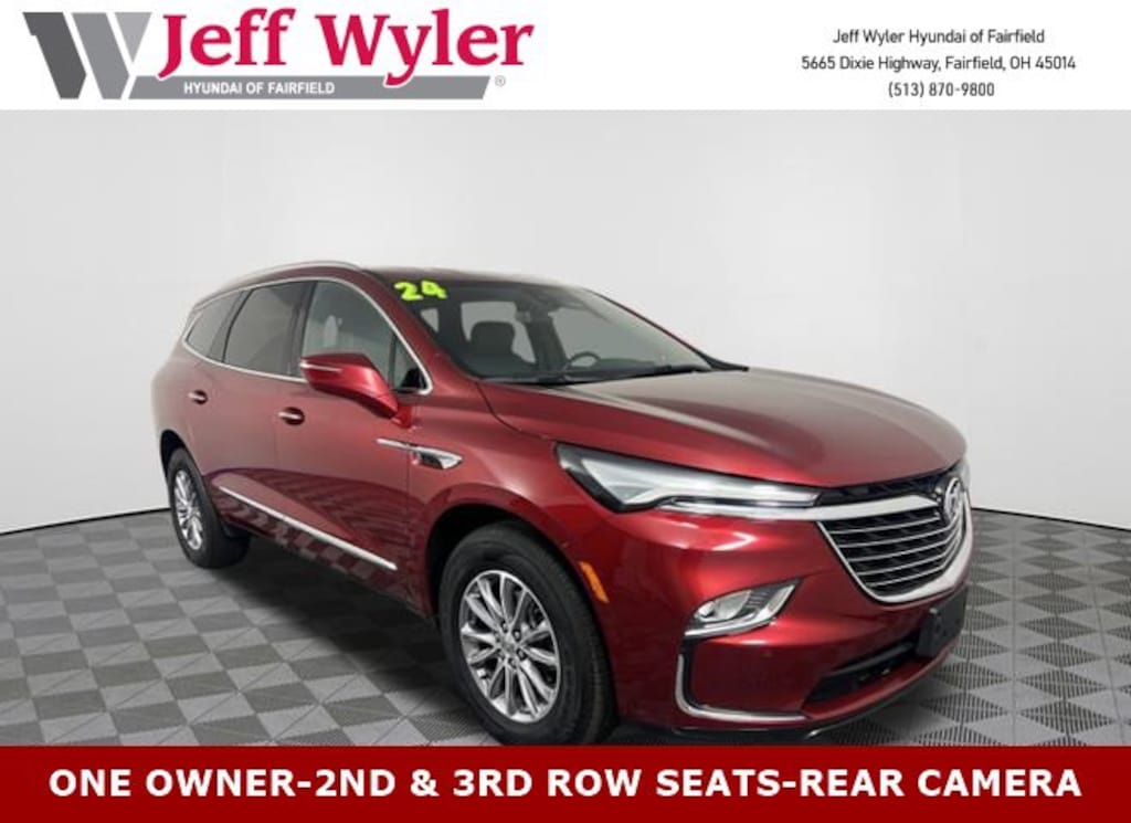 CARFAX One-Owner. Clean CARFAX. Jeff Wyler Hyundai of Fairfield is honored to offer this superb 2024 Buick Enclave Premium Group in Cherry Red Tintcoat. Well equipped with: Front Mounting License Plate Bracket Package, Preferred Equipment Group 1SN (Vehicle Health Management), AWD, Android Auto, Apple CarPlay, CALL NOW FOR YOUR VIP APPOINTMENT 513-870-9800, FULLY SERVICED w/RECORDS, GUARANTEED FINANCING!! NO MATTER YOUR SITUATION WE CAN GET AN APPROVAL!!, THE #1 Volume dealer in the region! Come see why for yourself Today!!, WE PAY MORE FOR YOUR TRADE!!, 10 Speakers, 18" Aluminum Wheels, 3.49 Final Drive Axle Ratio, 3rd row seats: split-bench, 4-Wheel Disc Brakes, 6-Way Power Front Passenger Seat Adjuster, 7-Passenger Seating, 8-Way Power Driver Seat Adjuster, ABS brakes, Air Conditioning, Alloy wheels, AM/FM radio: SiriusXM with 360L, Auto High-beam Headlights, Auto-dimming door mirrors, Auto-dimming Rear-View mirror, Automatic temperature control, Bose Performance-Enhanced 10-Speaker System, Brake assist, Bumpers: body-color, Compass, Delay-off headlights, Driver 4-Way Power Lumbar Seat Adjuster, Driver door bin, Driver vanity mirror, Dual front impact airbags, Dual front side impact airbags, Electronic Stability Control, Emergency communication system: OnStar and Buick connected services capable, Exterior Parking Camera Rear, Four wheel independent suspension, Front anti-roll bar, Front Bucket Seats, Front Center Armrest, Front dual zone A/C, Front Passenger 4-Way Power Lumbar Seat Adjuster, Front reading lights, Fully automatic headlights, Garage door transmitter, Heads-Up Display, Heated door mirrors, Heated Driver & Front Passenger Seats, Heated front seats, Heated rear seats, Heated steering wheel, Illuminated entry, Leather steering wheel, Low tire pressure warning, Memory seat, Navigation System, Occupant sensing airbag, Outside temperature display, Overhead airbag, Overhead console, Panic alarm, Passenger door bin, Passenger vanity mirror, Perforated Leather-Appointed Seat Trim, Power door mirrors, Power driver seat, Power Liftgate, Power passenger seat, Power steering, Power windows, Premium audio system: Buick Infotainment System, Radio data system, Radio: Buick Infotainment Sys AM/FM Stereo w/Nav, Rear air conditioning, Rear anti-roll bar, Rear reading lights, Rear window defroster, Rear window wiper, Remote keyless entry, Security system, SiriusXM w/360L, Speed control, Speed-sensing steering, Spoiler, Steering wheel memory, Steering wheel mounted audio controls, Tachometer, Telescoping steering wheel, Tilt steering wheel, Traction control, Trip computer, Turn signal indicator mirrors, Variably intermittent wipers, Ventilated Driver & Front Passenger Seats, Ventilated front seats, Voltmeter, and Wireless Apple CarPlay/Wireless Android Auto. TO CHECK ON THE AVAILABILITY OF THIS VEHICLE REACH OUT TO ONE OF OUR TEAM MEMBERS!! ALSO SHOP ONLINE AT https://www.jeffwylerhyundaioffairfield.com/ Proudly Serving: Cincinnati, Dayton, Columbus, Louisville, Lexington, Indianapolis, Hamilton, Florence, Alexandria, Beavercreek, Springdale, West Chester, Monroe, Fairfield, Kenwood, Newport and all of greater Cincinnati Ohio, Indiana, and Northern Kentucky.