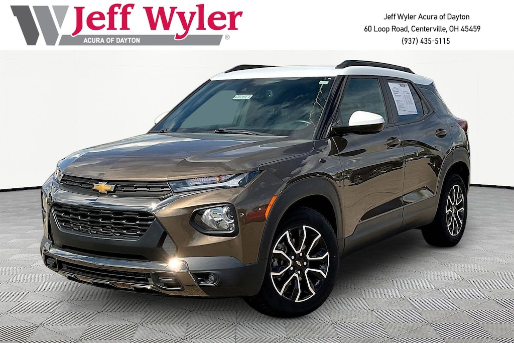 Jeff Wyler Acura of Dayton is proud to offer this gorgeous 2021 Chevrolet TrailBlazer ACTIV in Zeus Bronze Metallic. Convenience Package (1 Type-A & 1 Type-C USB Charging-Only Ports, 120-Volt Power Outlet, 8" Diagonal Color Touchscreen Display, Cabin Humidity Sensor, Driver & Front Passenger Illuminated Vanity Mirrors, Inside Rear-View Auto-Dimming Mirror, Single-Zone Auto Climate Control Air Conditioning, and SiriusXM Radio), Driver Confidence Package (Lane Change Alert w/Side Blind Zone Alert, Rear Cross Traffic Alert, and Rear Park Assist), Preferred Equipment Group 1SA, Technology Package (4.2" Diagonal Multi-Color Driver Info Center, Adaptive Cruise Control, Bose Premium 7-Speaker Audio System Feature, HD Radio, HD Rear Vision Camera, LED Headlamps, Memory Card Receptacle, Radio: Chevrolet Infotainment 3 Plus System, SiriusXM w/360L, and Wireless Charging), 2-Way Power Driver Lumbar Seat Adjuster, 4-Way Manual Front Passenger Seat Adjuster, 4-Wheel Disc Brakes, 5.45 Axle Ratio, 6 Speakers, 6-Speaker Audio System Feature, 8-Way Power Driver Seat Adjuster, ABS brakes, Air Conditioning, Alloy wheels, AM/FM radio, Apple CarPlay/Android Auto, Auto High-beam Headlights, Brake assist, Bumpers: body-color, Compass, Delay-off headlights, Driver door bin, Driver vanity mirror, Dual front impact airbags, Dual front side impact airbags, Electronic Stability Control, Emergency communication system: OnStar and Chevrolet connected services capable, Exterior Parking Camera Rear, Flat-Folding Front Passenger Seatback, Front & Rear All-Weather Floor Liners (LPO), Front anti-roll bar, Front Bucket Seats, Front Center Armrest, Front fog lights, Front reading lights, Front wheel independent suspension, Fully automatic headlights, Heated door mirrors, Heated Driver & Front Passenger Seats, Heated front seats, Illuminated entry, Knee airbag, Leather Shift Knob, Leather steering wheel, Leatherette Seat Trim, Low tire pressure warning, Occupant sensing airbag, Overhead airbag, Overhead console, Panic alarm, Passenger door bin, Passenger vanity mirror, Power door mirrors, Power driver seat, Power steering, Power windows, Radio data system, Radio: Chevrolet Infotainment 3 System, Rear seat center armrest, Rear side impact airbag, Rear window defroster, Rear window wiper, Remote keyless entry, Ride & Handling Suspension, Roof rack: rails only, Security system, Speed control, Split folding rear seat, Spoiler, Steering wheel mounted audio controls, Summit White Two-Tone Roof, Tachometer, Telescoping steering wheel, Tilt steering wheel, Traction control, Trip computer, Variably intermittent wipers, Wheels: 17" High Gloss Black Machined Aluminum, and Wireless Apple CarPlay/Android Auto Our PRE-OWNED vehicles are put through a rigorous 167- POINT QUALITY ASSURANCE INSPECTION along with an average amount of over $1,400.00 SPENT to recondition each vehicle so we can be sure to deliver you the highest quality vehicle like you deserve! ***ONLINE PRICE DOES NOT INCLUDE WYLER FAMILY FIRST PACKAGE*** CARFAX One-Owner. Clean CARFAX.