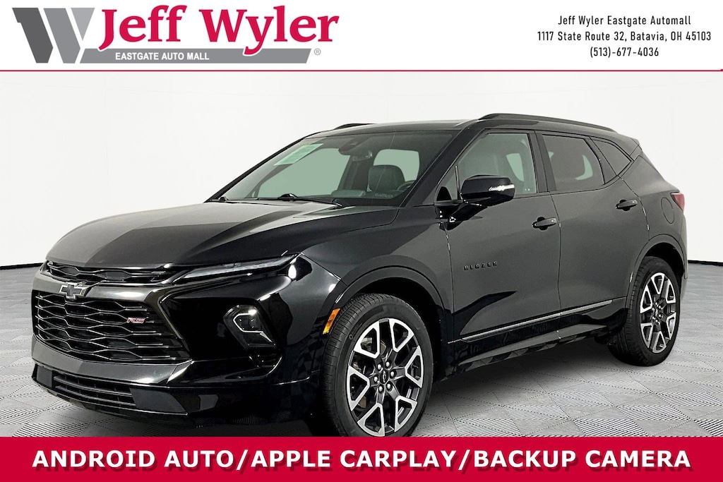 Jeff Wyler Eastgate Auto Mall is proud to offer this good-looking 2023 Chevrolet Blazer RS in Black. Well equipped with: Preferred Equipment Group 1RS (Heated Steering Wheel and Rear Park Assist w/Audible Warning), 3.49 Final Drive Axle Ratio, 4-Wheel Disc Brakes, 6-Way Power Front Passenger Seat Adjuster, 8 Speakers, 8-Way Power Driver Seat Adjuster, ABS brakes, Air Conditioning, Alloy wheels, AM/FM radio: SiriusXM with 360L, Apple CarPlay/Android Auto, Auto High-beam Headlights, Auto-dimming door mirrors, Auto-dimming Rear-View mirror, Automatic temperature control, Bose Premium 8-Speaker Audio System Feature, Brake assist, Bumpers: body-color, Child-Seat-Sensing Airbag, Compass, Delay-off headlights, Driver door bin, Driver vanity mirror, Dual front impact airbags, Dual front side impact airbags, Electronic Stability Control, Emergency communication system: OnStar and Chevrolet connected services capable, Four wheel independent suspension, Front anti-roll bar, Front Bucket Seats, Front Center Armrest, Front dual zone A/C, Front reading lights, Fully automatic headlights, Garage door transmitter, Heated door mirrors, Heated Driver & Front Passenger Seats, Heated front seats, Heated steering wheel, Illuminated entry, Knee airbag, Leather Shift Knob, Low tire pressure warning, Navigation System, Not Equipped w/Rear Park Assist, Occupant sensing airbag, Outside temperature display, Overhead airbag, Overhead console, Panic alarm, Passenger door bin, Passenger vanity mirror, Perforated Leather-Appointed Seat Trim, Power door mirrors, Power Driver Lumbar Control, Power driver seat, Power Liftgate, Power Panoramic Tilt-Sliding Sunroof, Power passenger seat, Power steering, Power windows, Premium audio system: Chevrolet Infotainment 3 Premium, Radio data system, Radio: Chevrolet Infotainment 3 Premium System, Rear anti-roll bar, Rear reading lights, Rear seat center armrest, Rear window defroster, Rear window wiper, Remote keyless entry, Ride & Handling Suspension, Security system, SiriusXM w/360L, Speed control, Speed-sensing steering, Split folding rear seat, Spoiler, Steering wheel mounted audio controls, Tachometer, Telescoping steering wheel, Tilt steering wheel, Traction control, Trip computer, Turn signal indicator mirrors, Variably intermittent wipers, Voltmeter, and Wheels: 20" Technical Gray Aluminum. Clean CARFAX. Ask about available certifications. Used vehicles 10 years of age or newer with less than 100,000 miles are eligible for the Wyler Assurance Program, but eligible vehicles must pass our reconditioning process and multi-point inspection. Provided the vehicle passes inspection, vehicles will be eligible for the 6 month/6,000 mile limited warranty. The 6 month/6,000 mile limited warranty is NOT available on AS-IS vehicles, wholesale vehicles, lease buyback/pass-thru vehicles or un-inspected vehicles. Note that this program can also apply to vehicles where the remaining factory coverage is less than 6 months or 6,000 miles. Please check the Federal Trade Commission (FTC) Buyers guide on the vehicle for full details as to whether or not warranty coverage may apply. Contact Dealer for additional details. The Wyler Assurance 6 month/6,000 Mile limited warranty ends 6 months from the date of the Retail Purchase Agreement (BUYERS ORDER) or when the vehicle's odometer registers 6,000 additional miles to the mileage listed on the BUYERS ORDER, whichever comes first. Your Deductible - The warranty holder on your contract pays the first $100 of each covered repair.