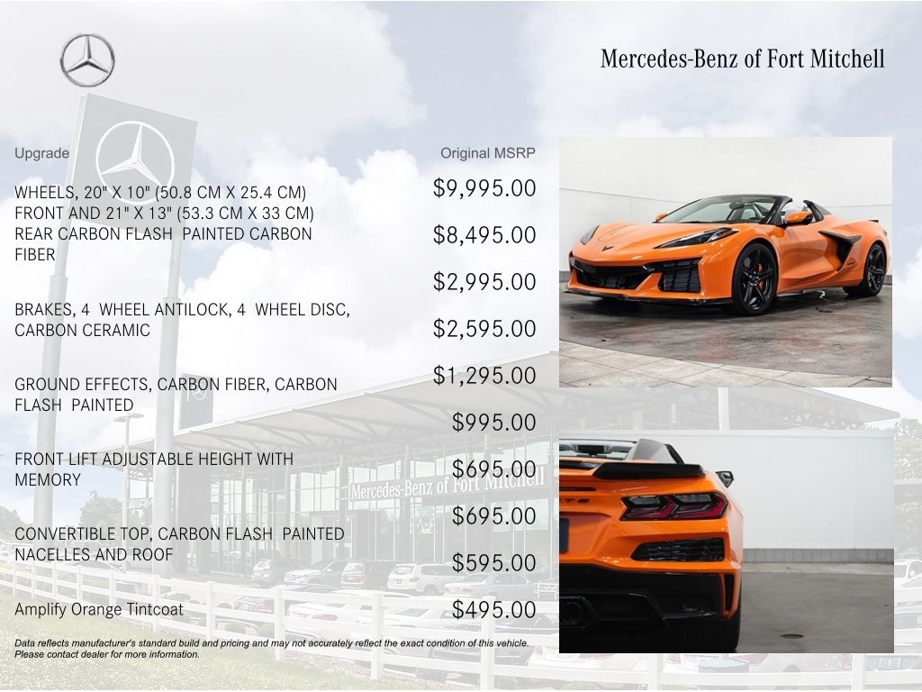 Amplify Orange Tintcoat 2023 Chevrolet Corvette Z06 3LZ RWD 8-Speed Dual Clutch 5.5L V8 CARBON CERAMIC BRAKES, GROUND EFFECTS - CARBON FIBER, CARBON FLASH PAINTED NACELLES AND ROOF, CONVERTIBLE TOP, EXHAUST TIPS, BLACK, 2 Cargo Nets, 8-Way Power Driver Seat Adjuster, 8-Way Power Passenger Seat Adjuster, Apple CarPlay®/Android Auto®, Automatic Leveling System Headlamp Control, Bose Performance Series Sound System w/14 Speakers, Carbon Fiber/Sueded Microfiber-Wrap Steering Wheel, Convertible HardTop, Convertible roof lining, Custom Leather Wrapped Interior Package, Driver Power Bolster Seat Adjuster, Electrical Theft Deterrent System, Front Lift Adjustable Height w/Memory, Fully automatic headlights, GT2 Bucket Seats, HD Front & Rear Vision Cameras, Heads-Up Display, Heated & Vented Driver & Passenger Seats, Heated Steering Wheel, Memory Driver & Passenger Convenience Package, Napa Lthr Seating Surfaces w/Perforated Inserts, Orange Seat Belt Color, Orange-Painted Calipers, Passenger Power Bolster Seat Adjuster, Performance Data & Video Recorder, Power Driver Lumbar Control Seat Adjuster, Power Passenger Lumbar Control Seat Adjuster, Power-Adjustable Outside Heated Mirrors, Preferred Equipment Group 3LZ, Rear Cross Traffic Alert, Side Blind Zone Alert, Stealth Interior Trim Package, Sueded Microfiber-Wrapped Upper Interior Trim Pkg, Universal Home Remote, Vehicle Inclination Theft Deterrent Sensor, Vehicle Interior Movement Theft Deterrent Sensor, Wheels: 20" x 10" Fr/21" x 13" Rr Carbon Flash, Wireless Charging for Devices.