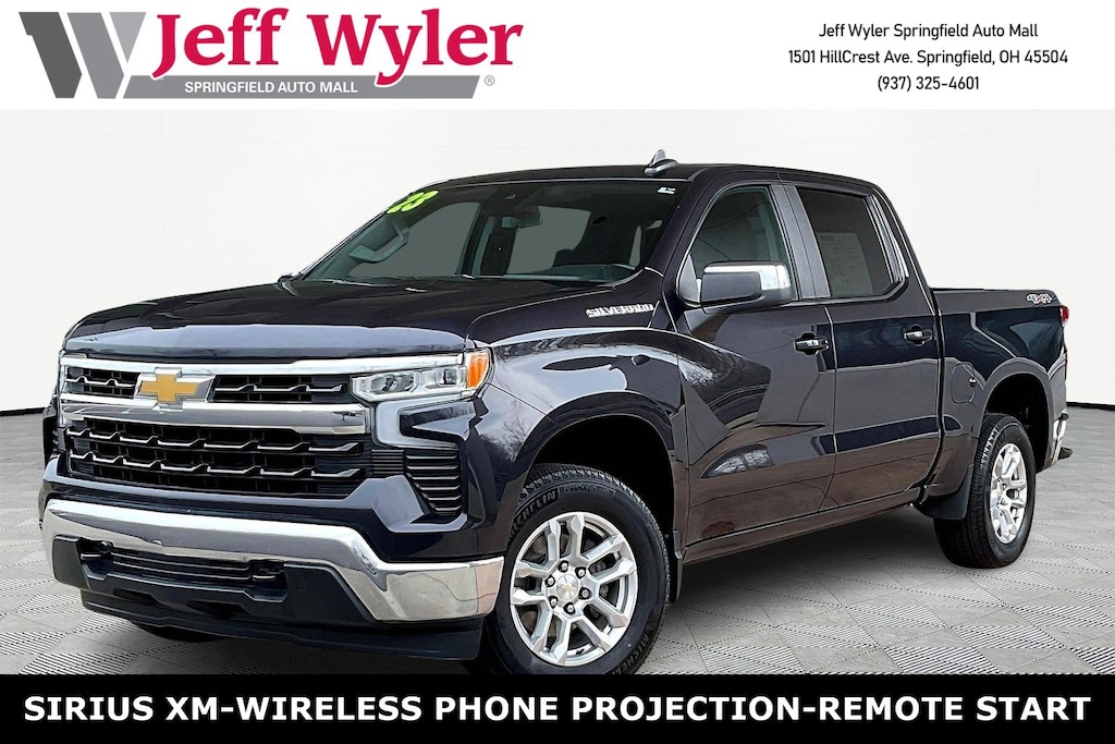 Jeff Wyler Springfield Auto Mall is honored to offer this outstanding 2023 Chevrolet Silverado 1500 LT in Dark Ash Metallic. Well equipped with: Convenience Package (10-Way Power Driver Seat w/Lumbar, 120-Volt Bed Mounted Power Outlet, 120-Volt Instrument Panel Power Outlet, Dual Rear USB Ports (Charge Only), Dual-Zone Automatic Climate Control, Heated Driver & Front Outboard Passenger Seats, Heated Steering Wheel, Keyless Open & Start, and Wrapped Steering Wheel), Standard Suspension Package, Trailering Package (Hitch Guidance), 12.3" Multicolor Reconfigurable Digital Display, 3.42 Rear Axle Ratio, 4-Wheel Disc Brakes, 40/20/40 Front Split-Bench Seat, 6 Speakers, 6-Speaker Audio System, ABS brakes, Air Conditioning, All-Star Edition, Alloy wheels, AM/FM radio: SiriusXM with 360L, Apple CarPlay/Android Auto, Auto High-beam Headlights, Auto-Locking Rear Differential, Automatic Emergency Braking, Automatic temperature control, Bluetooth® For Phone, Brake assist, Bumpers: chrome, Chevrolet Connected Access Capable, Chrome Mirror Caps, Cloth Seat Trim, Color-Keyed Carpeting Floor Covering, Compass, Deep-Tinted Glass, Delay-off headlights, Driver door bin, Driver vanity mirror, Dual front impact airbags, Dual front side impact airbags, Electric Rear-Window Defogger, Electrical Steering Column Lock, Electronic Cruise Control, Electronic Stability Control, Following Distance Indicator, Forward Collision Alert, Front anti-roll bar, Front Center Armrest w/Storage, Front dual zone A/C, Front Frame-Mounted Black Recovery Hooks, Front Pedestrian Braking, Front reading lights, Front wheel independent suspension, Fully automatic headlights, HD Rear Vision Camera, Heated door mirrors, Heated front seats, Heated steering wheel, Illuminated entry, IntelliBeam Automatic High Beam On/Off, Lane Keep Assist w/Lane Departure Warning, LED Cargo Area Lighting, Low tire pressure warning, Not Equipped w/Steering Column Lock, Occupant sensing airbag, OnStar & Chevrolet Connected Services Capable, Outside temperature display, Overhead airbag, Overhead console, Panic alarm, Passenger door bin, Passenger vanity mirror, Power door mirrors, Power driver seat, Power Front Windows w/Driver Express Up/Down, Power Front Windows w/Passenger Express Down, Power Rear Windows w/Express Down, Power steering, Power windows, Premium audio system: Chevrolet Infotainment 3 Premium, Radio data system, Radio: Chevrolet Infotainment 3 Premium System, Rear 60/40 Folding Bench Seat (Folds Up), Rear reading lights, Rear step bumper, Rear window defroster, Remote keyless entry, Remote Vehicle Starter System, Security system, SiriusXM w/360L, Speed control, Speed-sensing steering, Split folding rear seat, Steering Wheel Audio Controls, Steering wheel mounted audio controls, Tachometer, Telescoping steering wheel, Theft Deterrent System (Unauthorized Entry), Tilt steering wheel, Traction control, Trip computer, Variably intermittent wipers, Voltmeter, Wheels: 18" x 8.5" Bright Silver Painted Aluminum, Wi-Fi Hot Spot Capable, and Wireless Phone Projection. Ask about available certifications. Used vehicles 10 years of age or newer with less than 100,000 miles are eligible for the Wyler Assurance Program, but eligible vehicles must pass our reconditioning process and multi-point inspection. Provided the vehicle passes inspection, vehicles will be eligible for the 6 month/6,000 mile limited warranty. The 6 month/6,000 mile limited warranty is NOT available on AS-IS vehicles, wholesale vehicles, lease buyback/pass-thru vehicles or un-inspected vehicles. Note that this program can also apply to vehicles where the remaining factory coverage is less than 6 months or 6,000 miles. Please check the Federal Trade Commission (FTC) Buyers guide on the vehicle for full details as to whether or not warranty coverage may apply. Contact Dealer for additional details. The Wyler Assurance 6 month/6,000 Mile limited warranty ends 6 months from the date of the Retail Purchase Agreement (BUYERS ORDER)