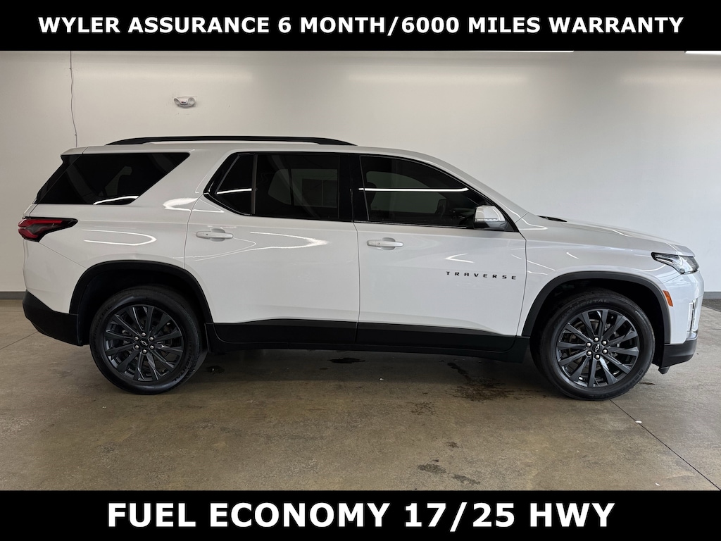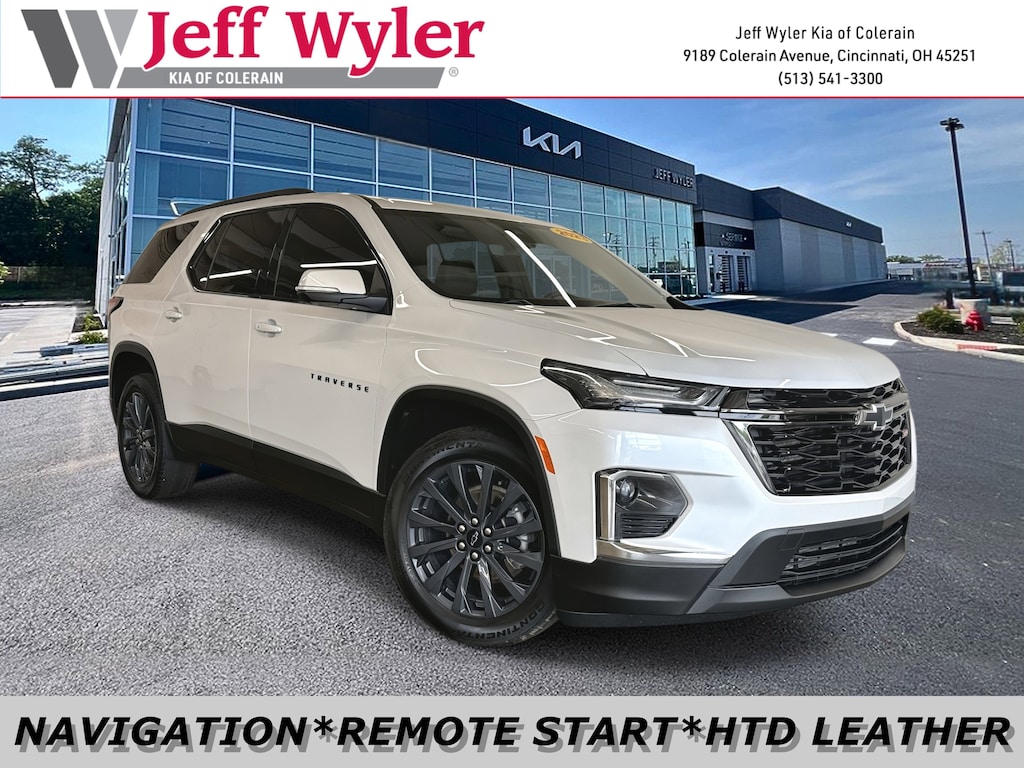 Jeff Wyler Kia of Colerain is very proud to offer this wonderful-looking 2023 Chevrolet Traverse RS in Iridescent Pearl Tricoat. NAVIGATION, Blind Spot Collision Avoidance Assist-Rear (BCA-R), Lane Keeping Assist (LKA), Bluetooth® Wireless Technology Hands-Free Connectivity, Bluetooth Wireless Technology With Voice Recognition, REAR BACK-UP CAMERA, Driver Attention Warning (DAW), Forward Collision Avoidance (FCA), w/ Pedestrian Detection, and Forward Collision Warning (FCW) Preferred Equipment Group 2LT (Heated Driver & Front Passenger Seats), Navigation System, Remote keyless entry, 10 Speakers, 3.49 Axle Ratio, 3rd row seats: split-bench, 4-Wheel Disc Brakes, 6-Way Power Front Passenger Seat, 8-Way Power Driver Seat Adjuster, ABS brakes, Air Conditioning, Alloy wheels, AM/FM radio: SiriusXM with 360L, Apple CarPlay/Android Auto, Auto High-beam Headlights, Auto-dimming Rear-View mirror, Automatic temperature control, Bose Premium 10-Speaker Audio System Feature, Brake assist, Bumpers: body-color, Compass, Delay-off headlights, Driver door bin, Driver vanity mirror, Dual front impact airbags, Dual front side impact airbags, Dual SkyScape 2-Panel Power Sunroof, Electronic Stability Control, Emergency communication system, Exterior Parking Camera Rear, Four wheel independent suspension, Front anti-roll bar, Front Bucket Seats, Front Center Armrest, Front dual zone A/C, Front Passenger 2-Way Power Lumbar, Front reading lights, Fully automatic headlights, Garage door transmitter, Heated door mirrors, Heated front seats, Heated steering wheel, Illuminated entry, Leather steering wheel, Low tire pressure warning, Not Equipped w/Rear Park Assist (060), Occupant sensing airbag, Outside temperature display, Overhead airbag, Overhead console, Panic alarm, Passenger door bin, Passenger vanity mirror, Perforated Leather-Appointed Seat Trim, Power door mirrors, Power Driver Lumbar Control, Power driver seat, Power Liftgate, Power passenger seat, Power steering, Power windows, Premium audio system: Chevrolet Infotainment 3 Plus, Radio data system, Radio: Chevrolet Infotainment 3 Plus System w/Navi, Rear air conditioning, Rear anti-roll bar, Rear reading lights, Rear window defroster, Rear window wiper, Security system, SiriusXM w/360L, Speed control, Speed-sensing steering, Spoiler, Steering wheel mounted audio controls, Tachometer, Telescoping steering wheel, Tilt steering wheel, Traction control, Trip computer, Turn signal indicator mirrors, Variably intermittent wipers, Voltmeter, and Wheels: 20" Dark Aluminum Our PRE-OWNED vehicles are put through a rigorous 167- POINT QUALITY ASSURANCE INSPECTION along with an average amount of over $1,400.00 SPENT to recondition each vehicle so we can be sure to deliver you the highest quality vehicle like you deserve! ***ONLINE PRICE DOES NOT INCLUDE WYLER FAMILY FIRST PACKAGE***