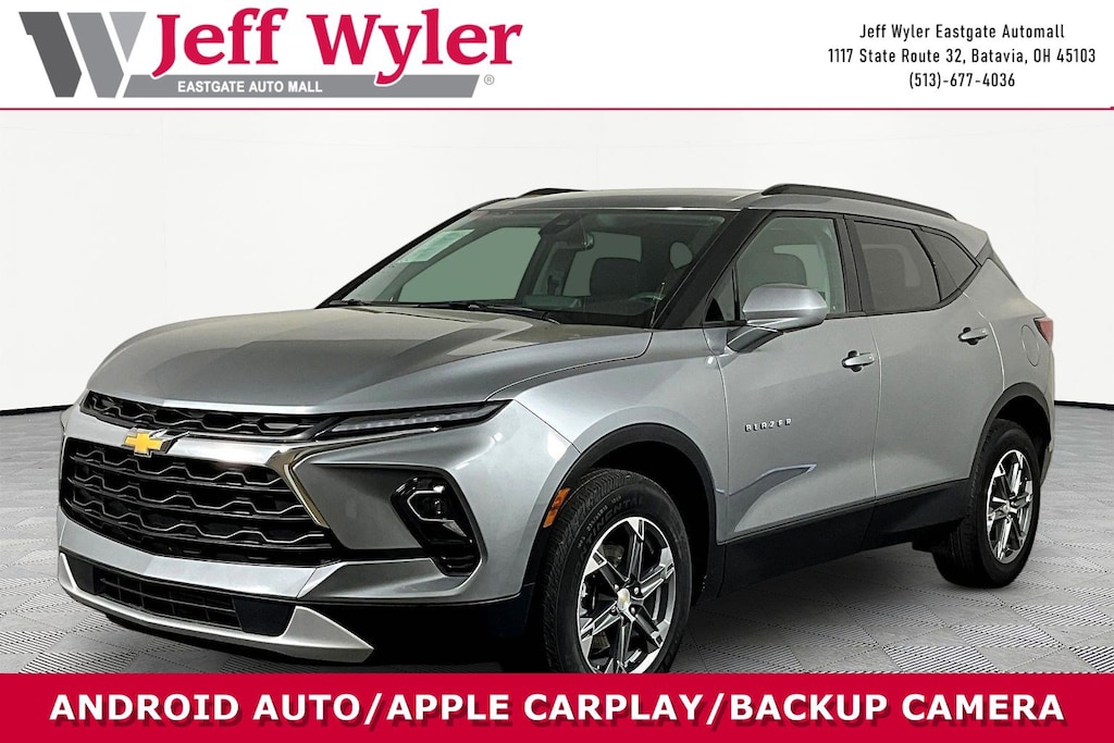Jeff Wyler Eastgate Auto Mall is proud to offer this good-looking 2024 Chevrolet Blazer LT in Sterling Gray Metallic. Well equipped with: Convenience Package (Adaptive Cruise Control, Black Roof-Mounted Side Rails, Enhanced Automatic Emergency Braking, Inside Rear-View Auto-Dimming Mirror, Rear Power Programmable Liftgate, Universal Home Remote, and Wireless Charging), Driver Confidence Package (Lane Change Alert w/Side Blind Zone Alert, Rear Cross Traffic Alert, and Rear Park Assist w/Audible Warning), Floor Liner Package (LPO) (1st & 2nd Row All-Weather Floor Liners (LPO) and Integrated Cargo Liner (LPO)), Preferred Equipment Group 2LT, 170 Amp Alternator, 3.47 Final Drive Axle Ratio, 4-Way Manual Front Passenger Seat Adjuster, 4-Wheel Disc Brakes, 6 Speakers, 6-Speaker Audio System Feature, 8-Way Power Driver Seat Adjuster, ABS brakes, Air Conditioning, Alloy wheels, AM/FM radio: SiriusXM with 360L, Apple CarPlay/Android Auto, Auto High-beam Headlights, Automatic temperature control, Brake assist, Bumpers: body-color, Child-Seat-Sensing Airbag, Compass, Delay-off headlights, Driver door bin, Driver vanity mirror, Dual front impact airbags, Dual front side impact airbags, Electronic Stability Control, Emergency communication system: OnStar and Chevrolet connected services capable, Four wheel independent suspension, Front anti-roll bar, Front Bucket Seats, Front Center Armrest, Front dual zone A/C, Front reading lights, Fully automatic headlights, Heated door mirrors, Heated Driver & Front Passenger Seats, Heated front seats, Illuminated entry, Knee airbag, Leather Shift Knob, Low tire pressure warning, Occupant sensing airbag, Outside temperature display, Overhead airbag, Overhead console, Panic alarm, Passenger door bin, Passenger vanity mirror, Power door mirrors, Power Driver Lumbar Control, Power driver seat, Power steering, Power windows, Premium audio system: Chevrolet Infotainment 3 Plus, Premium Cloth Seat Trim, Radio data system, Radio: Chevrolet Infotainment 3 Plus System, Rear anti-roll bar, Rear reading lights, Rear seat center armrest, Rear window defroster, Rear window wiper, Remote keyless entry, Ride & Handling Suspension, Security system, SiriusXM w/360L, Speed control, Speed-sensing steering, Split folding rear seat, Spoiler, Steering wheel mounted audio controls, Tachometer, Telescoping steering wheel, Tilt steering wheel, Traction control, Trip computer, Variably intermittent wipers, Voltmeter, and Wheels: 18" Grazen Metallic Aluminum. Ask about available certifications. Used vehicles 10 years of age or newer with less than 100,000 miles are eligible for the Wyler Assurance Program, but eligible vehicles must pass our reconditioning process and multi-point inspection. Provided the vehicle passes inspection, vehicles will be eligible for the 6 month/6,000 mile limited warranty. The 6 month/6,000 mile limited warranty is NOT available on AS-IS vehicles, wholesale vehicles, lease buyback/pass-thru vehicles or un-inspected vehicles. Note that this program can also apply to vehicles where the remaining factory coverage is less than 6 months or 6,000 miles. Please check the Federal Trade Commission (FTC) Buyers guide on the vehicle for full details as to whether or not warranty coverage may apply. Contact Dealer for additional details. The Wyler Assurance 6 month/6,000 Mile limited warranty ends 6 months from the date of the Retail Purchase Agreement (BUYERS ORDER) or when the vehicle's odometer registers 6,000 additional miles to the mileage listed on the BUYERS ORDER, whichever comes first. Your Deductible - The warranty holder on your contract pays the first $100 of each covered repair.
