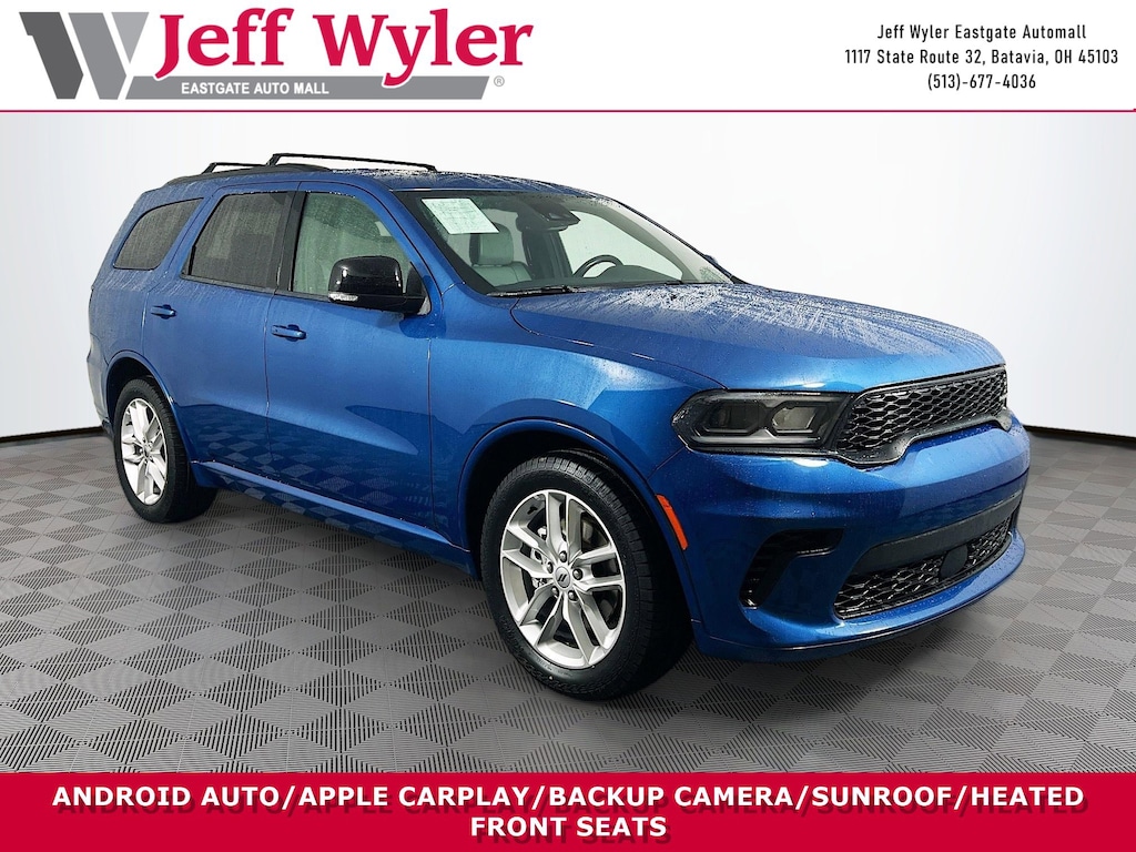 Jeff Wyler Eastgate Auto Mall is pumped up to offer this superb 2024 Dodge Durango GT Plus in Frostbite Pearlcoat. Well equipped with: Quick Order Package 2BG GT Plus (1-Year Trial (Registration Required), 10.1" Touchscreen Display, 115V Auxiliary Power Outlet, 180 Amp Alternator, 4G LTE Wi-Fi Hot Spot, 7 & 4 Pin Wiring Harness, Adaptive Cruise Control w/Stop, Apple CarPlay, Auto-Dimming Exterior Driver Mirror, Black Roof Rails, Blind Spot w/Trailer Detection, Class IV Receiver Hitch, Connected Travel & Traffic Services, Disassociated Touchscreen Display, Dual Remote USB Port - Charge Only, Exterior Mirrors w/Heating Element, Exterior Mirrors w/Memory, Exterior Mirrors w/Supplemental Signals, Floor Console w/Leather Armrest, For Details, Visit DriveUconnect.com, Full Speed Forward Collision Warning Plus, Global Telematics Box Module (TBM), Gloss Black Exterior Mirrors, Google Android Auto, GPS Antenna Input, GPS Navigation, HD Radio, Heated Second Row Seats, Heavy-Duty Engine Cooling, Integrated Center Stack Radio, Integrated Roof Rail Crossbars, Integrated Voice Command w/Bluetooth, Leather Trimmed Bucket Seats, Leather Wrapped Door Panels, LED Auxiliary Low Beam & Turn Signal, Power 6x9 Multi-Function Foldaway Mirrors, Power 8-Way Driver Memory 8-Way Passenger Seats, Power Driver/Passenger 4-Way Lumbar Adjust, Power Sunroof, Power Tilt & Telescopic Steering Column, Radio: Uconnect 5 Nav w/10.1" Display, Radio/Driver Seat/Mirrors Memory, Red Accent Stitching, SiriusXM Guardian - Included Trial (B), SiriusXM w/360L, Trailer Brake Control, USB Host Flip, and Ventilated Front Seats), 3.27 Rear Axle Ratio, 3rd row seats: split-bench, 4-Wheel Disc Brakes, 6 Speakers, ABS brakes, Air Conditioning, Alloy wheels, AM/FM radio: SiriusXM, Apple CarPlay/Android Auto, Auto-dimming Rear-View mirror, Auto-leveling suspension, Automatic temperature control, Brake assist, Bumpers: body-color, Cloth Bucket Seats w/Shift Insert, Compass, Delay-off headlights, Driver door bin, Driver vanity mirror, Dual front impact airbags, Dual front side impact airbags, Electronic Stability Control, Four wheel independent suspension, Front anti-roll bar, Front Bucket Seats, Front Center Armrest w/Storage, Front dual zone A/C, Front License Plate Bracket, Front reading lights, Fully automatic headlights, Garage door transmitter, Heated door mirrors, Heated front seats, Heated steering wheel, Illuminated entry, Knee airbag, Leather steering wheel, Low tire pressure warning, Occupant sensing airbag, Outside temperature display, Overhead airbag, Overhead console, Panic alarm, ParkView Rear Back-Up Camera, Passenger door bin, Passenger vanity mirror, Power door mirrors, Power driver seat, Power Liftgate, Power steering, Power windows, Radio data system, Radio: Uconnect 4 w/8.4" Display, Rear air conditioning, Rear anti-roll bar, Rear Load Leveling Suspension, Rear reading lights, Rear seat center armrest, Rear window defroster, Rear window wiper, Remote keyless entry, Speed control, Speed-sensing steering, Speed-Sensitive Wipers, Split folding rear seat, Spoiler, Sport steering wheel, Steering wheel mounted audio controls, Tachometer, Telescoping steering wheel, Tilt steering wheel, Traction control, Trip computer, Variably intermittent wipers, Voltmeter, and Wheels: 20" x 8.0" Fine SilveR. CARFAX One-Owner. Clean CARFAX. Ask about available certifications. Used vehicles 10 years of age or newer with less than 100,000 miles are eligible for the Wyler Assurance Program, but eligible vehicles must pass our reconditioning process and multi-point inspection. Provided the vehicle passes inspection, vehicles will be eligible for the 6 month/6,000 mile limited warranty. The 6 month/6,000 mile limited warranty is NOT available on AS-IS vehicles, wholesale vehicles, lease buyback/pass-thru vehicles or un-inspected vehicles. Note that this program can also apply to vehicles where the remaining factory coverage is less than 6 months or 6,000 miles. Please check the Federal T
