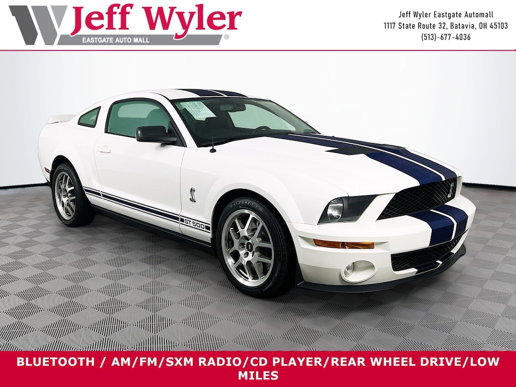 Jeff Wyler Eastgate Auto Mall is very proud to offer this good-looking 2007 Ford Mustang Shelby GT500 in White. Well equipped with: 18" x 9.5" Bright Machined Aluminum Wheels, 4-Wheel Disc Brakes, 8 Speakers, ABS brakes, Air Conditioning, Alloy wheels, AM/FM radio, Bumpers: body-color, CD player, Driver door bin, Driver vanity mirror, Dual front impact airbags, Dual front side impact airbags, Front anti-roll bar, Front Bucket Seats, Front Center Armrest, Front fog lights, Front reading lights, Front wheel independent suspension, Illuminated entry, Leather Shift Knob, Leather Sport Bucket Seats, Low tire pressure warning, Occupant sensing airbag, Panic alarm, Passenger door bin, Passenger vanity mirror, Power door mirrors, Power driver seat, Power steering, Power windows, Premium audio system: Shaker 500, Radio data system, Rear anti-roll bar, Rear window defroster, Remote keyless entry, Security system, Shaker 500 AM/FM Stereo w/CDx6/MP3, Speed control, Split folding rear seat, Spoiler, Tachometer, Tilt steering wheel, Traction control, Trip computer, and Variably intermittent wipers. Clean CARFAX. Reviews: * Youâll like this car if youâre looking for a sporty, four-passenger convertible thatâs a thoroughly modern take on a classic model. In the GT trim, the Mustang offers more bang-for-the-buck than pricier models from BMW, Nissan and Audi, all wrapped in a package that smacks of the red, white and blue. Source: KBB.comAsk about available certifications. Used vehicles 10 years of age or newer with less than 100,000 miles are eligible for the Wyler Assurance Program, but eligible vehicles must pass our reconditioning process and multi-point inspection. Provided the vehicle passes inspection, vehicles will be eligible for the 6 month/6,000 mile limited warranty. The 6 month/6,000 mile limited warranty is NOT available on AS-IS vehicles, wholesale vehicles, lease buyback/pass-thru vehicles or un-inspected vehicles. Note that this program can also apply to vehicles where the remaining factory coverage is less than 6 months or 6,000 miles. Please check the Federal Trade Commission (FTC) Buyers guide on the vehicle for full details as to whether or not warranty coverage may apply. Contact Dealer for additional details. The Wyler Assurance 6 month/6,000 Mile limited warranty ends 6 months from the date of the Retail Purchase Agreement (BUYERS ORDER) or when the vehicle's odometer registers 6,000 additional miles to the mileage listed on the BUYERS ORDER, whichever comes first. Your Deductible - The warranty holder on your contract pays the first $100 of each covered repair.