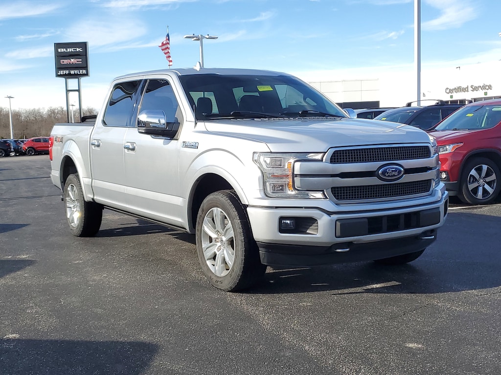 Jeff Wyler Florence Buick GMC is very proud to offer this handsome 2019 Ford F-150 Platinum in Ingot Silver. Equipment Group 700A Base, GVWR: 7,050 lbs Payload Package, 10 Speakers, 20 Polished Aluminum Wheels, Adjustable pedals, Alloy wheels, AppLink/Apple CarPlay and Android Auto, Auto High-beam Headlights, Auto tilt-away steering wheel, Auto-dimming door mirrors, Automatic temperature control, Black Unique Multi-Contour Leather Bucket Seats, Bumpers: body-color, Class IV Trailer Hitch Receiver, Delay-off headlights, Exterior Parking Camera Rear, Front Bucket Seats, Front dual zone A/C, Front fog lights, Fully automatic headlights, Genuine wood door panel insert, Heated door mirrors, Heated front seats, Heated rear seats, Heated steering wheel, Illuminated entry, Integrated Trailer Brake Controller, Memory seat, Navigation System, Pedal memory, Power door mirrors, Power driver seat, Power passenger seat, Radio: B&O Sound System by Bang & Olufsen, Rear Parking Sensors, Rear step bumper, Remote keyless entry, SiriusXM Radio, Steering wheel memory, Steering wheel mounted audio controls, SYNC 3, Telescoping steering wheel, Tilt steering wheel, Turn signal indicator mirrors, Ventilated front seats, Voice-Activated Touchscreen Navigation, 3.31 Axle Ratio, 4-Wheel Disc Brakes, ABS brakes, Air Conditioning, AM/FM radio: SiriusXM, Auto-dimming Rear-View mirror, Brake assist, Compass, Driver door bin, Driver vanity mirror, Dual front impact airbags, Dual front side impact airbags, Electronic Stability Control, Emergency communication system: SYNC 3 911 Assist, Front anti-roll bar, Front Center Armrest, Front reading lights, Front wheel independent suspension, Garage door transmitter, Low tire pressure warning, Occupant sensing airbag, Outside temperature display, Overhead airbag, Overhead console, Panic alarm, Passenger door bin, Passenger vanity mirror, Power steering, Power windows, Radio data system, Rain sensing wipers, Rear reading lights, Rear seat center armrest, Rear window defroster, Security system, Speed control, Speed-sensing steering, Split folding rear seat, Tachometer, Traction control, Trip computer, Variably intermittent wipers, and Voltmeter Our PRE-OWNED vehicles are put through a rigorous 167- POINT QUALITY ASSURANCE INSPECTION along with an average amount of over $1,400.00 SPENT to recondition each vehicle so we can be sure to deliver you the highest quality vehicle like you deserve! ***ONLINE PRICE DOES NOT INCLUDE WYLER FAMILY FIRST PACKAGE*** Stop by 1154 Burlington Pike Florence KY 41402to see for yourself, or give us a call @ 859-525-8001 to schedule your test drive!