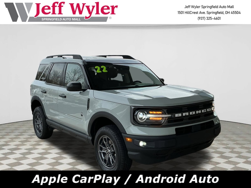 Jeff Wyler Springfield Auto Mall is excited to offer this good-looking 2022 Ford Bronco Sport Big Bend in Cactus Gray. Well equipped with: Convenience Package (Front Driver & Passenger Seatback Zipper Pockets, Heated Front Bucket Seats, Intelligent Access (Lock/Unlock), Leather-Wrapped Steering Wheel, LED Fog Lamps, Rear Parking Sensors, Universal Garage Door Opener (UGDO), and Wireless Charging Pad), Equipment Group 200A, Ford Co-Pilot360 Assist+ (Evasive Steering Assist, Intelligent Adaptive Cruise Control w/Stop & Go, and Voice-Activated Touchscreen Navigation System), 3.80 Axle Ratio, 4-Wheel Disc Brakes, 6 Speakers, ABS brakes, Air Conditioning, Alloy wheels, AM/FM radio: SiriusXM, AM/FM Stereo, Auto High-beam Headlights, Automatic temperature control, Brake assist, Compass, Delay-off headlights, Driver door bin, Driver vanity mirror, Dual front impact airbags, Dual front side impact airbags, Electronic Stability Control, Emergency communication system: SYNC 3 911 Assist, Four wheel independent suspension, Front & Rear Floor Liners, Front anti-roll bar, Front Bucket Seats, Front Center Armrest, Front reading lights, Fully automatic headlights, Heated door mirrors, Illuminated entry, Knee airbag, Low tire pressure warning, Occupant sensing airbag, Outside temperature display, Overhead airbag, Overhead console, Panic alarm, Passenger door bin, Passenger vanity mirror, Power door mirrors, Power Moonroof, Power steering, Power windows, Radio data system, Rear anti-roll bar, Rear reading lights, Rear seat center armrest, Rear window defroster, Rear window wiper, Remote keyless entry, Roof rack: rails only, Security system, SiriusXM Radio, Speed control, Speed-sensing steering, Speed-Sensitive Wipers, Split folding rear seat, Steering wheel mounted audio controls, SYNC 3 Communications & Entertainment System, SYNC 3/Apple CarPlay/Android Auto, Tachometer, Telescoping steering wheel, Tilt steering wheel, Traction control, Trip computer, Unique Cloth Front Bucket Seats, Variably intermittent wipers, and Wheels: 17" Carbonized Gray-Painted Aluminum. Ask about available certifications. Used vehicles 10 years of age or newer with less than 100,000 miles are eligible for the Wyler Assurance Program, but eligible vehicles must pass our reconditioning process and multi-point inspection. Provided the vehicle passes inspection, vehicles will be eligible for the 6 month/6,000 mile limited warranty. The 6 month/6,000 mile limited warranty is NOT available on AS-IS vehicles, wholesale vehicles, lease buyback/pass-thru vehicles or un-inspected vehicles. Note that this program can also apply to vehicles where the remaining factory coverage is less than 6 months or 6,000 miles. Please check the Federal Trade Commission (FTC) Buyers guide on the vehicle for full details as to whether or not warranty coverage may apply. Contact Dealer for additional details. The Wyler Assurance 6 month/6,000 Mile limited warranty ends 6 months from the date of the Retail Purchase Agreement (BUYERS ORDER) or when the vehicle's odometer registers 6,000 additional miles to the mileage listed on the BUYERS ORDER, whichever comes first. Your Deductible - The warranty holder on your contract pays the first $100 of each covered repair.