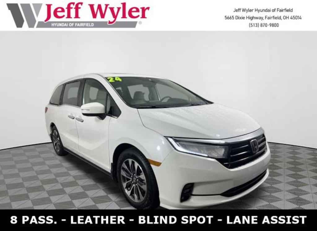 CARFAX One-Owner. Jeff Wyler Hyundai of Fairfield is very proud to offer this great 2024 Honda Odyssey EX-L in Platinum White Pearl. Well equipped with: Android Auto, Apple CarPlay, CALL NOW FOR YOUR VIP APPOINTMENT 513-870-9800, FULLY SERVICED w/RECORDS, GUARANTEED FINANCING!! NO MATTER YOUR SITUATION WE CAN GET AN APPROVAL!!, THE #1 Volume dealer in the region! Come see why for yourself Today!!, WE PAY MORE FOR YOUR TRADE!!, 18" Machine-Finished Alloy Wheels, 3.61 Axle Ratio, 3rd row seats: split-bench, 4-Wheel Disc Brakes, 7 Speakers, A/V remote: CabinControl, ABS brakes, Adaptive Cruise Control: Adaptive Cruise Control (ACC) with Low-Speed Follow, Air Conditioning, Alloy wheels, AM/FM radio: SiriusXM, Anti-whiplash front head restraints, Apple CarPlay/Android Auto, Auto High-beam Headlights, Auto-dimming Rear-View mirror, Automatic temperature control, Blind Spot Information (BSI) System warning, Brake assist, Bumpers: body-color, Delay-off headlights, Driver door bin, Driver vanity mirror, Driver's Seat Mounted Armrest, Dual front impact airbags, Dual front side impact airbags, Electronic Stability Control, Exterior Parking Camera Rear, Four wheel independent suspension, Front anti-roll bar, Front Bucket Seats, Front dual zone A/C, Front fog lights, Front reading lights, Fully automatic headlights, Garage door transmitter: HomeLink, Heated door mirrors, Heated Front Bucket Seats, Heated front seats, Illuminated entry, Knee airbag, Lane departure: Lane Keeping Assist System (LKAS) active, Leather Seat Trim, Leather steering wheel, Low tire pressure warning, Memory seat, Occupant sensing airbag, Outside temperature display, Overhead airbag, Overhead console, Panic alarm, Passenger door bin, Passenger seat mounted armrest, Passenger vanity mirror, Power door mirrors, Power driver seat, Power Liftgate, Power moonroof, Power passenger seat, Power steering, Power windows, Radio data system, Radio: 160-Watt AM/FM/HD/SiriusXM Audio System, Rear air conditioning, Rear anti-roll bar, Rear reading lights, Rear seat center armrest, Rear window defroster, Rear window wiper, Reclining 3rd row seat, Remote keyless entry, Security system, Speed control, Speed-sensing steering, Speed-Sensitive Wipers, Split folding rear seat, Spoiler, Steering wheel mounted audio controls, Tachometer, Telescoping steering wheel, Tilt steering wheel, Traction control, Trip computer, Turn signal indicator mirrors, and Variably intermittent wipers. TO CHECK ON THE AVAILABILITY OF THIS VEHICLE REACH OUT TO ONE OF OUR TEAM MEMBERS!! ALSO SHOP ONLINE AT https://www.jeffwylerhyundaioffairfield.com/ Proudly Serving: Cincinnati, Dayton, Columbus, Louisville, Lexington, Indianapolis, Hamilton, Florence, Alexandria, Beavercreek, Springdale, West Chester, Monroe, Fairfield, Kenwood, Newport and all of greater Cincinnati Ohio, Indiana, and Northern Kentucky.