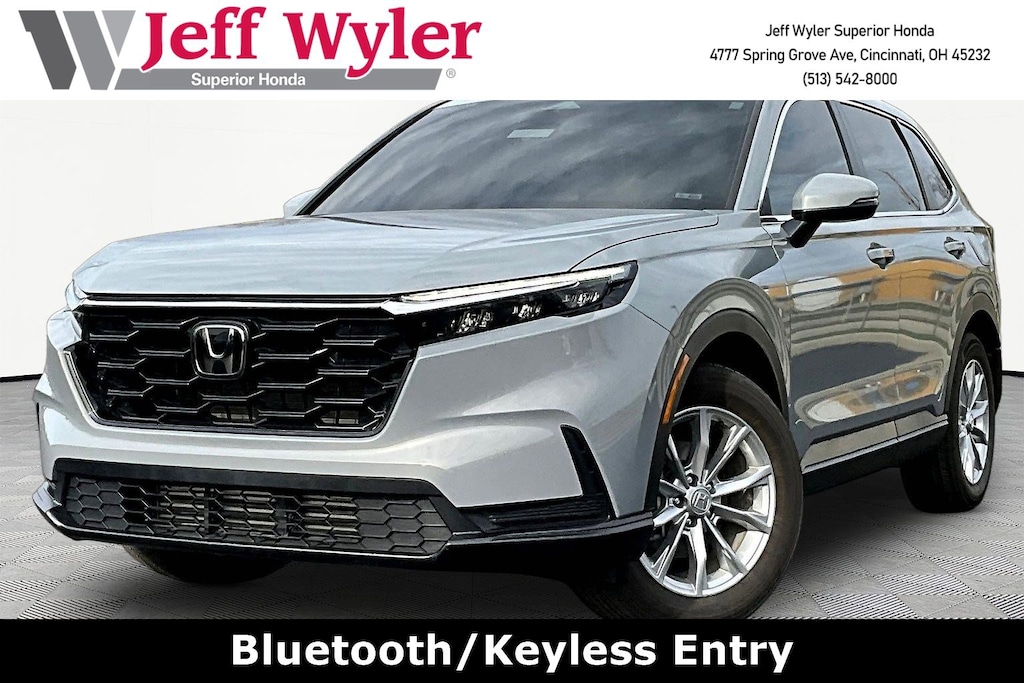 Jeff Wyler Superior Honda is very proud to offer this good-looking 2025 Honda CR-V EX in sparkle silver alloy metallic. BLUETOOTH, MOONROOF SUNROOF, CLEAN CARFAX...NO ACCIDENTS, HONDA CERTIFIED!, RECENT SUPERIOR TRADE, BOUGHT, SERVICED AND TRADED AT SUPERIOR, and ONE OWNER CR-V EX, HondaTrue Certified Certified, 4D Sport Utility, 1.5L I4 DOHC 16V, CVT, AWD, sparkle silver alloy metallic, Cloth, 4-Wheel Disc Brakes, 6 Speakers, ABS brakes, Adaptive Cruise Control: Adaptive Cruise Control (ACC) with Low-Speed Follow, Air Conditioning, Alloy wheels, Apple CarPlay/Android Auto, Auto High-beam Headlights, Automatic temperature control, Blind Spot Information (BSI) System warning, Brake assist, Bumpers: body-color, Cloth Seat Trim, Compass, Delay-off headlights, Driver door bin, Driver vanity mirror, Dual front impact airbags, Dual front side impact airbags, Electronic Stability Control, Exterior Parking Cameras, Four wheel independent suspension, Front anti-roll bar, Front Bucket Seats, Front Center Armrest, Front dual zone A/C, Front reading lights, Fully automatic headlights, Heated door mirrors, Heated Front Bucket Seats, Heated front seats, Illuminated entry, Knee airbag, Low tire pressure warning, Occupant sensing airbag, Outside temperature display, Overhead airbag, Overhead console, Panic alarm, Passenger door bin, Passenger vanity mirror, Power door mirrors, Power driver seat, Power moonroof, Power steering, Power windows, Radio data system, Radio: 240-Watt AM/FM Audio System, Rear anti-roll bar, Rear reading lights, Rear seat center armrest, Rear side impact airbag, Rear window defroster, Rear window wiper, Remote keyless entry, Security system, Speed control, Speed-sensing steering, Speed-Sensitive Wipers, Split folding rear seat, Spoiler, Steering wheel mounted audio controls, Tachometer, Telescoping steering wheel, Tilt steering wheel, Traction control, Trip computer, Turn signal indicator mirrors, Variably intermittent wipers, and Wheels: 18" Sparkle Silver Alloy Metallic Our PRE-OWNED vehicles are put through a rigorous 167- POINT QUALITY ASSURANCE INSPECTION along with an average amount of over $1,400.00 SPENT to recondition each vehicle so we can be sure to deliver you the highest quality vehicle like you deserve! ***ONLINE PRICE DOES NOT INCLUDE WYLER FAMILY FIRST PACKAGE*** Stop by 4777 Spring Grove Ave. Road to see for yourself, or give us a call @ 283-209-1858 to schedule your test drive!Vehicle pricing includes all offers and incentives. Due to limited inventory, offers and pricing are all subject to change. Tax, Title, Tags and $387 doc fees are not included in vehicle price shown and must be paid by the purchaser. Doc fees vary by location. Financing w/approved credit. Mileage est. Based on current EPA estimates reflecting new EPA methods beginning w/ 2008 models. For comparison only. Do not compare to pre 2008 models. Actual mileage may vary based on how you drive and maintain your vehicle. Information on this site includes 3rd party data believed to be reliable, subject to change without notice. Jeff Wyler reserves the right to correct any errors and/or omissions in the compilation or presentation of this data and makes no representations express or implied to any prospective purchaser as to the vehicle's condition, specifications, history, equipment or equipment function, price or warranties. This vehicle may be subject to an open recall that has not been repaired. Please consult safercar.gov for more information on the current status. It is the responsibility of purchaser to confirm any data prior to purchase. Other than MSRP, all offers only apply to this vehicle and are subject to change. Vehicle prices are subject to change and all vehicles are subject to prior sale and may not be available when you are ready to purchase. Prices listed on any other website may not be accepted. Dealership advertises the sale of vehicles through a number of different channels and cannot always control when they are upd