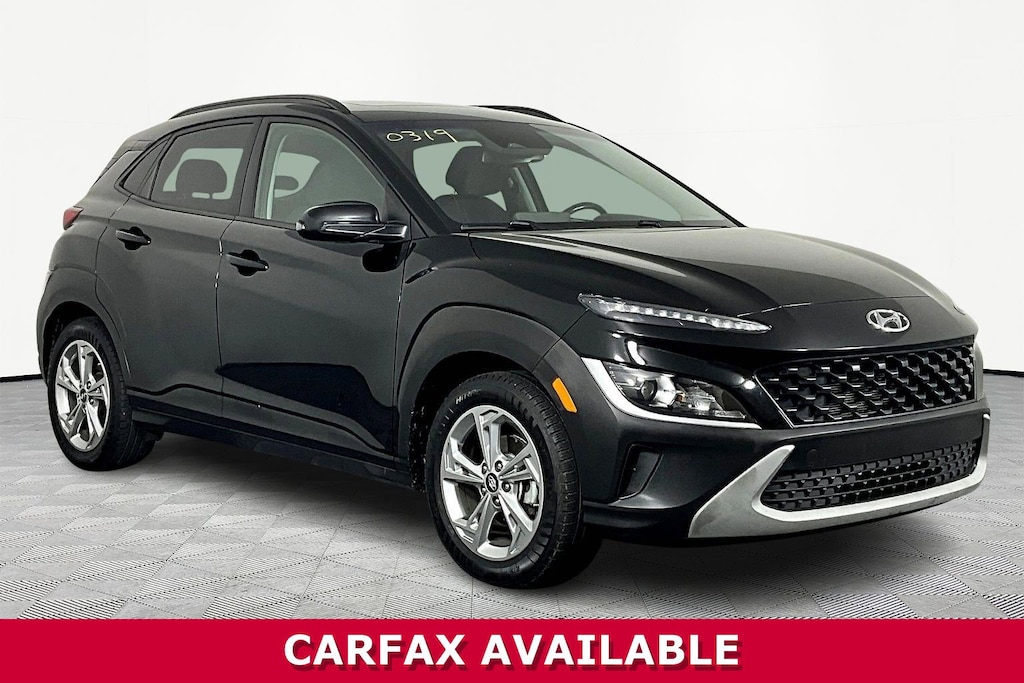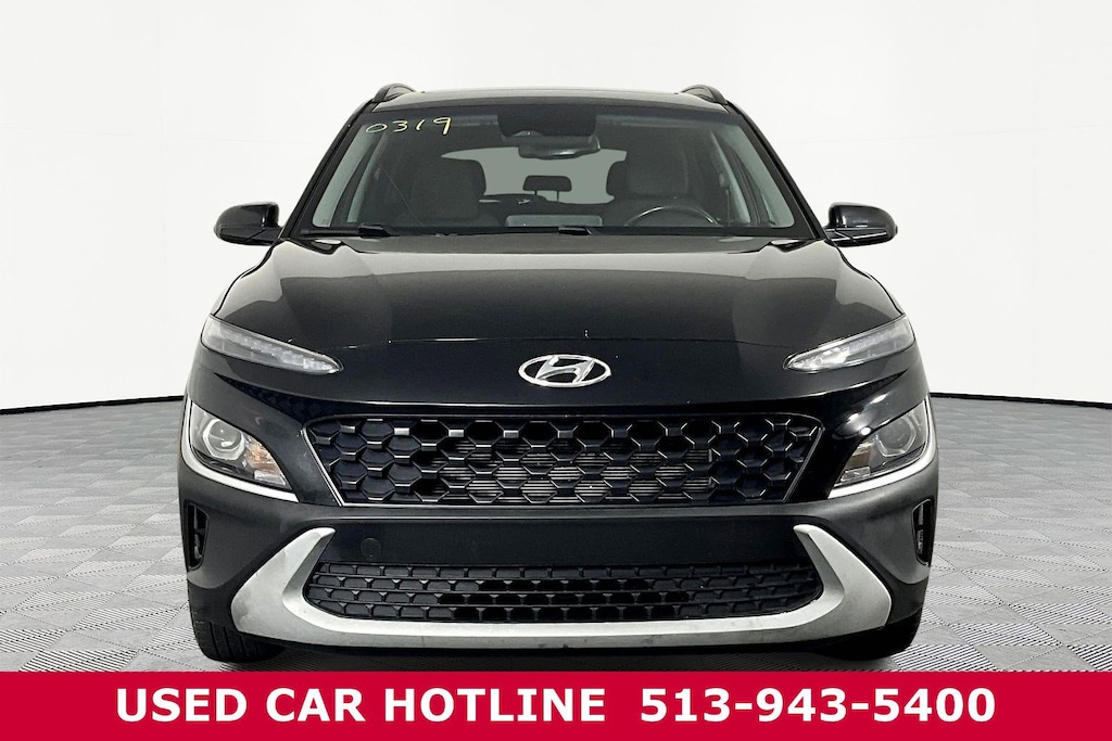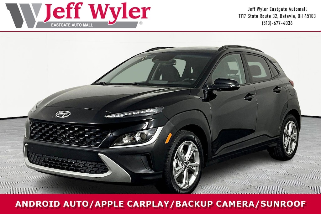 Jeff Wyler Eastgate Auto Mall is delighted to offer this handsome 2022 Hyundai Kona SEL in Ultra Black Pearl. Well equipped with: Convenience Package (Automatic Temperature Control, Heated Front Seats, Hidden Cargo-Area Storage Compartment, Leather-Wrapped Shift Knob, Leather-Wrapped Steering Wheel, NFC Digital Key, Option Group 02, Power Tilt-and-Slide Sunroof, Power Windows w/Front Auto-Down/Up, Premium Dark Grey Body Cladding, and Wireless Device Charging), 4-Wheel Disc Brakes, 5.715 Axle Ratio, 6 Speakers, ABS brakes, Air Conditioning, Alloy wheels, AM/FM radio: SiriusXM, Apple CarPlay & Android Auto, Brake assist, Bumpers: body-color, Cargo Tray, Carpeted Floor Mats, Cloth Seat Trim, Delay-off headlights, Driver door bin, Driver vanity mirror, Dual front impact airbags, Dual front side impact airbags, Electronic Stability Control, Emergency communication system: Blue Link Connected Car Service (3-year complimentary subscription), Exterior Parking Camera Rear, Front anti-roll bar, Front Bucket Seats, Front Center Armrest, Front reading lights, Front wheel independent suspension, Fully automatic headlights, Heated door mirrors, Illuminated entry, Low tire pressure warning, Occupant sensing airbag, Overhead airbag, Overhead console, Panic alarm, Passenger door bin, Passenger vanity mirror, Power door mirrors, Power steering, Power windows, Radio: AM/FM/HD Radio/SiriusXM Audio System, Rear seat center armrest, Rear window defroster, Rear window wiper, Remote keyless entry, Roof Rack Cross Rails, Security system, Speed control, Speed-sensing steering, Split folding rear seat, Spoiler, Steering wheel mounted audio controls, Tachometer, Telescoping steering wheel, Tilt steering wheel, Traction control, Trip computer, Turn signal indicator mirrors, Variably intermittent wipers, and Wheels: 17 x 7.0J Alloy. CARFAX One-Owner. Clean CARFAX. Ask about available certifications. Used vehicles 10 years of age or newer with less than 100,000 miles are eligible for the Wyler Assurance Program, but eligible vehicles must pass our reconditioning process and multi-point inspection. Provided the vehicle passes inspection, vehicles will be eligible for the 6 month/6,000 mile limited warranty. The 6 month/6,000 mile limited warranty is NOT available on AS-IS vehicles, wholesale vehicles, lease buyback/pass-thru vehicles or un-inspected vehicles. Note that this program can also apply to vehicles where the remaining factory coverage is less than 6 months or 6,000 miles. Please check the Federal Trade Commission (FTC) Buyers guide on the vehicle for full details as to whether or not warranty coverage may apply. Contact Dealer for additional details. The Wyler Assurance 6 month/6,000 Mile limited warranty ends 6 months from the date of the Retail Purchase Agreement (BUYERS ORDER) or when the vehicle's odometer registers 6,000 additional miles to the mileage listed on the BUYERS ORDER, whichever comes first. Your Deductible - The warranty holder on your contract pays the first $100 of each covered repair.