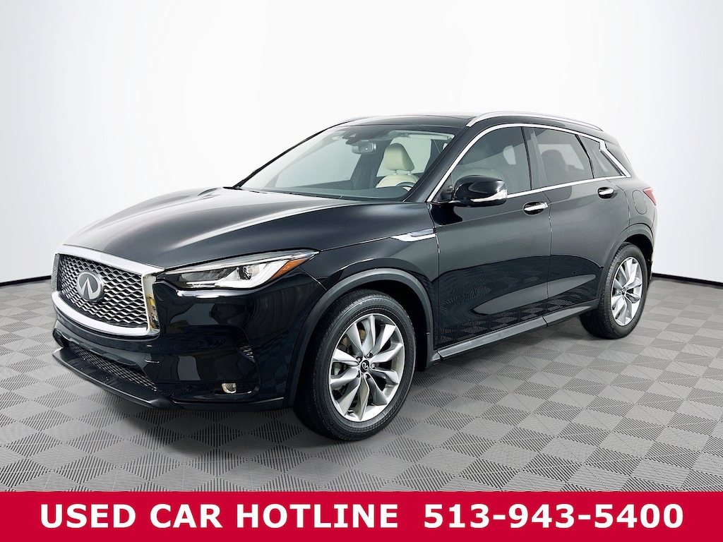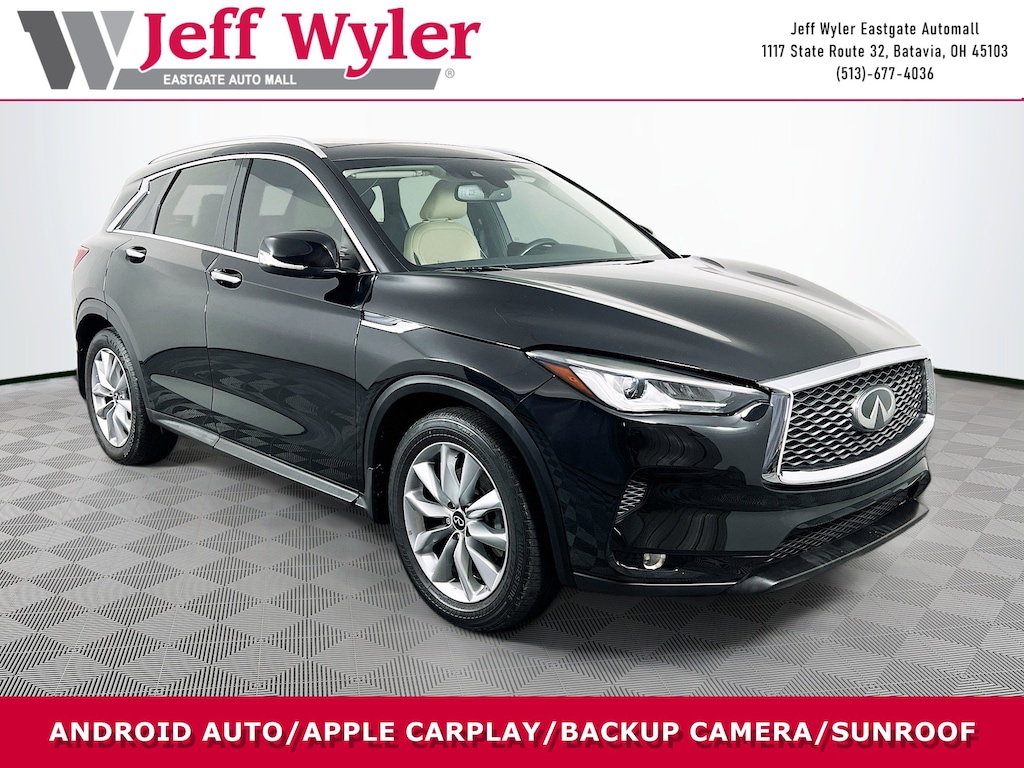 Jeff Wyler Eastgate Auto Mall is honored to offer this handsome 2022 INFINITI QX50 LUXE in Black Obsidian. Well equipped with: 4-Wheel Disc Brakes, 5.846 Axle Ratio, 6 Speakers, ABS brakes, Air Conditioning, Alloy wheels, AM/FM radio: SiriusXM, Anti-whiplash front head restraints, Auto High-beam Headlights, Auto-dimming Rear-View mirror, Automatic temperature control, Black Splash Guards (Set of 4), Brake assist, Bumpers: body-color, CD player, Delay-off headlights, Driver door bin, Driver vanity mirror, Dual front impact airbags, Dual front side impact airbags, Electronic Stability Control, Emergency communication system: INFINITI InTouch, Exterior Parking Camera Rear, Floor Mats, Four wheel independent suspension, Front anti-roll bar, Front Bucket Seats, Front Center Armrest, Front dual zone A/C, Front fog lights, Front reading lights, Fully automatic headlights, Garage door transmitter: HomeLink, Heated door mirrors, Heated Front Bucket Seats, Heated front seats, Illuminated entry, Illuminated Kick Plates, Knee airbag, Leather Shift Knob, Leather-Appointed Seat Trim, Low tire pressure warning, Occupant sensing airbag, Outside temperature display, Overhead airbag, Overhead console, Panic alarm, Passenger door bin, Passenger vanity mirror, Power door mirrors, Power driver seat, Power Liftgate, Power moonroof, Power passenger seat, Power steering, Power windows, Radio data system, Radio: HD Audio System, Rear anti-roll bar, Rear Parking Sensors, Rear reading lights, Rear seat center armrest, Rear side impact airbag, Rear window defroster, Rear window wiper, Remote keyless entry, Security system, Speed control, Speed-sensing steering, Speed-Sensitive Wipers, Split folding rear seat, Spoiler, Steering wheel mounted audio controls, Tachometer, Telescoping steering wheel, Tilt steering wheel, Traction control, Trip computer, Turn signal indicator mirrors, Variably intermittent wipers, and Wheels: 19" Silver Painted Aluminum Alloy. CARFAX One-Owner. Ask about available certifications. Used vehicles 10 years of age or newer with less than 100,000 miles are eligible for the Wyler Assurance Program, but eligible vehicles must pass our reconditioning process and multi-point inspection. Provided the vehicle passes inspection, vehicles will be eligible for the 6 month/6,000 mile limited warranty. The 6 month/6,000 mile limited warranty is NOT available on AS-IS vehicles, wholesale vehicles, lease buyback/pass-thru vehicles or un-inspected vehicles. Note that this program can also apply to vehicles where the remaining factory coverage is less than 6 months or 6,000 miles. Please check the Federal Trade Commission (FTC) Buyers guide on the vehicle for full details as to whether or not warranty coverage may apply. Contact Dealer for additional details. The Wyler Assurance 6 month/6,000 Mile limited warranty ends 6 months from the date of the Retail Purchase Agreement (BUYERS ORDER) or when the vehicle's odometer registers 6,000 additional miles to the mileage listed on the BUYERS ORDER, whichever comes first. Your Deductible - The warranty holder on your contract pays the first $100 of each covered repair.