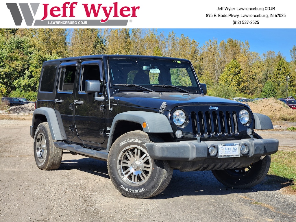 Jeff Wyler Chrysler Dodge Jeep of Lawrenceburg is honored to offer this handsome 2018 Jeep Wrangler JK Unlimited Sport in Black Clearcoat. Connectivity Group (Tire Pressure Monitoring Display, Uconnect Voice Command w/Bluetooth, and Vehicle Information Center), Power Convenience Group (Auto-Dimming Mirror w/Reading Lamp, Front 1-Touch Down Power Windows, Power Heated Mirrors, Power Locks, Remote Keyless Entry, and Security Alarm), Quick Order Package 24S Sport S (17" x 7.5" Aluminum Wheels, Chrome/Leather Wrapped Shift Knob, Deep Tint Sunscreen Windows, and Leather Wrapped Steering Wheel), 1-Yr SiriusXM Radio Service, 16" x 7.0" Luxury Styled Steel Wheels, 3.21 Rear Axle Ratio, 4-Wheel Disc Brakes, 8 Speakers, ABS brakes, Air Conditioning, AM/FM radio, Audio Jack Input for Mobile Devices, Black 3-Piece Hard Top, Brake assist, CD player, Cloth Seats w/Adjustable Head Restraints, Compass, Driver door bin, Driver Height Adjuster Seat, Driver vanity mirror, Dual front impact airbags, Electronic Stability Control, Freedom Panel Storage Bag, Freedom Top Hard Top Headliner, Front anti-roll bar, Front Bucket Seats, Front Center Armrest w/Storage, Front fog lights, Integrated roll-over protection, Low tire pressure warning, Normal Duty Suspension, Occupant sensing airbag, Outside temperature display, Passenger door bin, Passenger vanity mirror, Power steering, R1234YF A/C Refrigerant, Radio: 130, Rear anti-roll bar, Rear Window Defroster, Rear Window Wiper/Washer, Speed control, Split folding rear seat, Steering wheel mounted audio controls, Sunrider Soft Top, Tachometer, Tilt steering wheel, Traction control, Trip computer, and Variably intermittent wipers Our PRE-OWNED vehicles are put through a rigorous 167- POINT QUALITY ASSURANCE INSPECTION along with an average amount of over $1,400.00 SPENT to recondition each vehicle so we can be sure to deliver you the highest quality vehicle like you deserve! ***ONLINE PRICE DOES NOT INCLUDE WYLER FAMILY FIRST PACKAGE*** Stop by 4136 Shelbyville Road to see for yourself, or give us a call @ 502-897-3151 to schedule your test drive! Ask about available certifications.