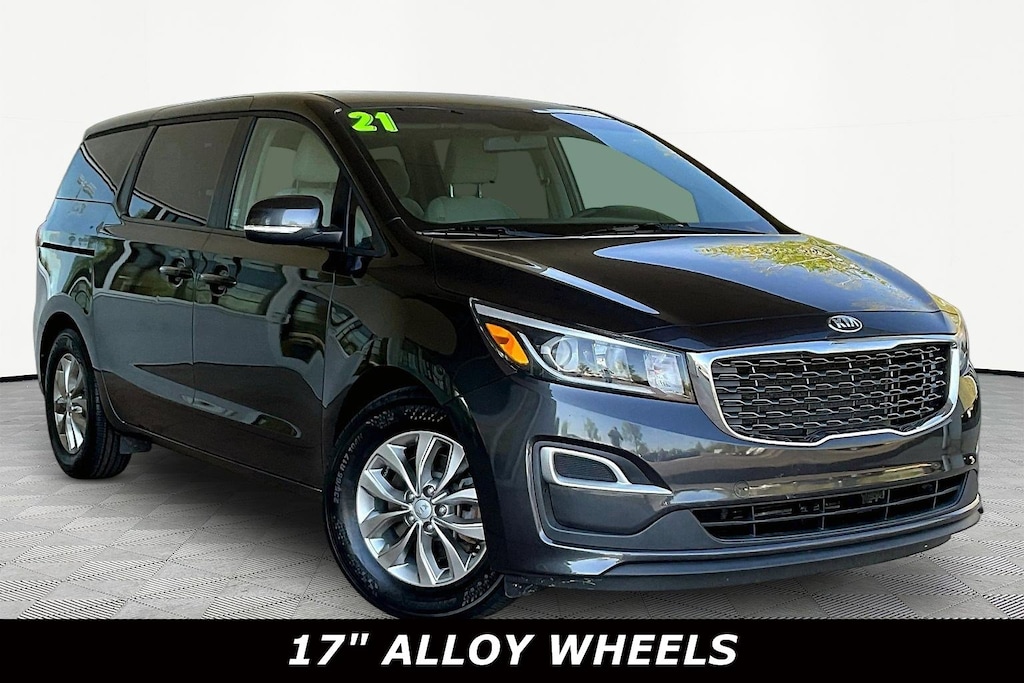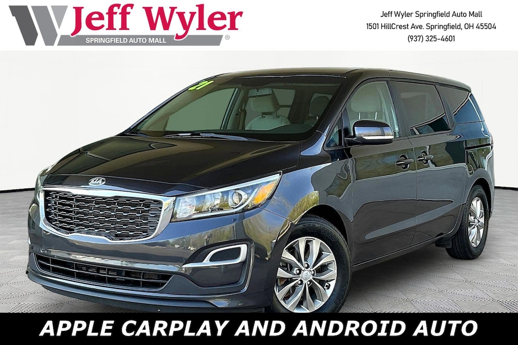 Jeff Wyler Springfield Auto Mall is honored to offer this superb-looking 2021 Kia Sedona LX in Pantera Metal. Well equipped with: 2-Way Power Driver's Lumbar Support, 3.51 Axle Ratio, 3rd row seats: split-bench, 4-Wheel Disc Brakes, 6 Speakers, 8-Way Power Driver's Seat, ABS brakes, Air Conditioning, Alloy wheels, AM/FM radio, Apple CarPlay & Android Auto, Brake assist, Bumpers: body-color, Carpeted Floor Mats, Cloth Seat Trim w/YES Essentials, Delay-off headlights, Driver door bin, Driver vanity mirror, Dual front impact airbags, Dual front side impact airbags, Electronic Stability Control, Exterior Parking Camera Rear, Four wheel independent suspension, Front anti-roll bar, Front Bucket Seats, Front Center Armrest, Front reading lights, Fully automatic headlights, Illuminated entry, Low tire pressure warning, Occupant sensing airbag, Outside temperature display, Overhead airbag, Overhead console, Panic alarm, Passenger door bin, Passenger vanity mirror, Power door mirrors, Power driver seat, Power steering, Power windows, Radio: AM/FM Audio System, Rear air conditioning, Rear anti-roll bar, Rear reading lights, Rear window defroster, Rear window wiper, Reclining 3rd row seat, Remote keyless entry, Security system, Speed control, Speed-sensing steering, Split folding rear seat, Spoiler, Steering wheel mounted audio controls, Tachometer, Telescoping steering wheel, Tilt steering wheel, Traction control, Trip computer, Turn signal indicator mirrors, Variably intermittent wipers, and Wheels: 17" x 6.5J Clear Silver Painted Alloy. Ask about available certifications. Used vehicles 10 years of age or newer with less than 100,000 miles are eligible for the Wyler Assurance Program, but eligible vehicles must pass our reconditioning process and multi-point inspection. Provided the vehicle passes inspection, vehicles will be eligible for the 6 month/6,000 mile limited warranty. The 6 month/6,000 mile limited warranty is NOT available on AS-IS vehicles, wholesale vehicles, lease buyback/pass-thru vehicles or un-inspected vehicles. Note that this program can also apply to vehicles where the remaining factory coverage is less than 6 months or 6,000 miles. Please check the Federal Trade Commission (FTC) Buyers guide on the vehicle for full details as to whether or not warranty coverage may apply. Contact Dealer for additional details. The Wyler Assurance 6 month/6,000 Mile limited warranty ends 6 months from the date of the Retail Purchase Agreement (BUYERS ORDER) or when the vehicle's odometer registers 6,000 additional miles to the mileage listed on the BUYERS ORDER, whichever comes first. Your Deductible - The warranty holder on your contract pays the first $100 of each covered repair.