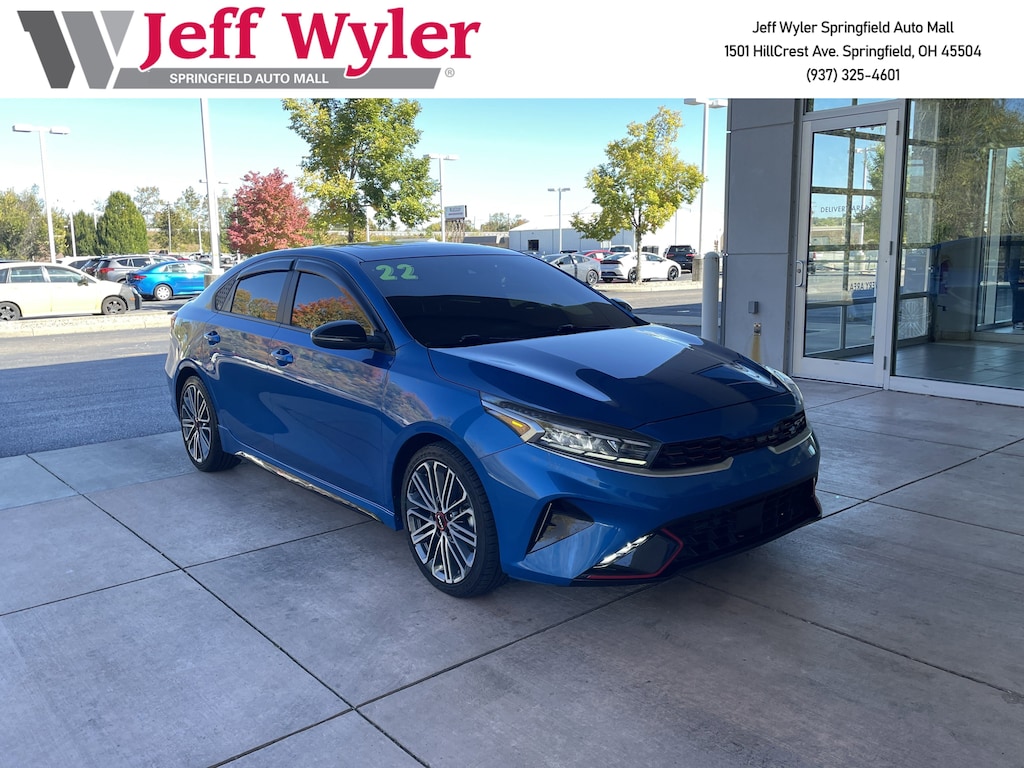 Jeff Wyler Springfield Auto Mall is very proud to offer this terrific-looking 2022 Kia Forte GT in Sporty Blue. Well equipped with: GT2 Package (10-Way Power Driver's Seat, Electronic Parking Brake (EPB) w/Auto Hold, Forward Collision Avoidance-Assist - Cyclist, Heated & Ventilated Front Seats, Highway Driving Assist (HDA), Navigation-Based Smart Cruise Control (NSCC), Overhead LED Front & Rear Reading Lamps, Parking Distance Warning-Reverse, Power Sunroof, Radio: AM/FM/MP3 harman/kardon Premium Audio System, Smart Cruise Control, and SynTex Seat Trim), 4-Wheel Disc Brakes, 6 Speakers, ABS brakes, Air Conditioning, Alloy wheels, AM/FM radio: SiriusXM, Apple CarPlay & Android Auto, Auto High-beam Headlights, Automatic temperature control, Brake assist, Bumpers: body-color, Cloth & Leatherette Seat Trim, Delay-off headlights, Driver door bin, Driver vanity mirror, Dual front impact airbags, Dual front side impact airbags, Electronic Stability Control, Emergency communication system: UVO eServices, Exterior Parking Camera Rear, Four wheel independent suspension, Front anti-roll bar, Front Bucket Seats, Front Center Armrest, Front dual zone A/C, Front fog lights, Front reading lights, Front Sport Seats, Fully automatic headlights, Heated door mirrors, Illuminated entry, Leather Shift Knob, Leather steering wheel, Low tire pressure warning, Navigation System, Occupant sensing airbag, Outside temperature display, Overhead airbag, Overhead console, Panic alarm, Passenger door bin, Passenger vanity mirror, Power door mirrors, Power steering, Power windows, Radio data system, Radio: UVO Link Audio System, Rear anti-roll bar, Rear seat center armrest, Rear window defroster, Remote keyless entry, Security system, Speed control, Split folding rear seat, Spoiler, Sport steering wheel, Steering wheel mounted audio controls, Tachometer, Telescoping steering wheel, Tilt steering wheel, Traction control, Trip computer, Turn signal indicator mirrors, Variably intermittent wipers, and Wheels: 18" Machine Finish Alloy. Ask about available certifications. Used vehicles 10 years of age or newer with less than 100,000 miles are eligible for the Wyler Assurance Program, but eligible vehicles must pass our reconditioning process and multi-point inspection. Provided the vehicle passes inspection, vehicles will be eligible for the 6 month/6,000 mile limited warranty. The 6 month/6,000 mile limited warranty is NOT available on AS-IS vehicles, wholesale vehicles, lease buyback/pass-thru vehicles or un-inspected vehicles. Note that this program can also apply to vehicles where the remaining factory coverage is less than 6 months or 6,000 miles. Please check the Federal Trade Commission (FTC) Buyers guide on the vehicle for full details as to whether or not warranty coverage may apply. Contact Dealer for additional details. The Wyler Assurance 6 month/6,000 Mile limited warranty ends 6 months from the date of the Retail Purchase Agreement (BUYERS ORDER) or when the vehicle's odometer registers 6,000 additional miles to the mileage listed on the BUYERS ORDER, whichever comes first. Your Deductible - The warranty holder on your contract pays the first $100 of each covered repair.