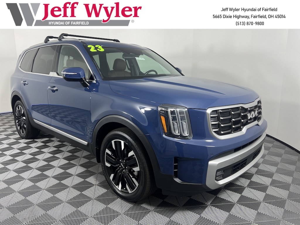 CARFAX One-Owner. Jeff Wyler Hyundai of Fairfield is excited to offer this handsome 2023 Kia Telluride SX in Midnight Lake Blue. Well equipped with: Mahogany Interior Color Package, Android Auto, Apple CarPlay, CALL NOW FOR YOUR VIP APPOINTMENT 513-870-9800, FULLY SERVICED w/RECORDS, GUARANTEED FINANCING!! NO MATTER YOUR SITUATION WE CAN GET AN APPROVAL!!, THE #1 Volume dealer in the region! Come see why for yourself Today!!, WE PAY MORE FOR YOUR TRADE!!, 10 Speakers, 3.648 Axle Ratio, 3rd row seats: split-bench, 4-Wheel Disc Brakes, ABS brakes, Air Conditioning, Alloy wheels, AM/FM radio: SiriusXM, Apple CarPlay & Android Auto, Auto High-beam Headlights, Auto-dimming Rear-View mirror, Automatic temperature control, Brake assist, Bumpers: body-color, Cargo Cover, Carpet Floor Mats, Compass, Delay-off headlights, Driver door bin, Driver vanity mirror, Dual front impact airbags, Dual front side impact airbags, Electronic Stability Control, Emergency communication system: 911 Connect, Exterior Parking Camera Rear, Four wheel independent suspension, Front anti-roll bar, Front Bucket Seats, Front Center Armrest, Front dual zone A/C, Front fog lights, Front reading lights, Fully automatic headlights, Garage door transmitter: HomeLink, harman/kardon® Speakers, Heated & Ventilated Front Bucket Seats, Heated door mirrors, Heated front seats, Heated steering wheel, Illuminated entry, Knee airbag, Leather Seat Trim, Leather Shift Knob, Leather steering wheel, Low tire pressure warning, Memory seat, Mud Guard Kit, Navigation System, Occupant sensing airbag, Outside temperature display, Overhead airbag, Overhead console, Panic alarm, Passenger door bin, Passenger vanity mirror, Power door mirrors, Power driver seat, Power Liftgate, Power moonroof, Power passenger seat, Power steering, Power windows, Radio data system, Radio: AM/FM harman/kardon Audio System, Rear air conditioning, Rear anti-roll bar, Rear audio controls, Rear reading lights, Rear side impact airbag, Rear window defroster, Rear window wiper, Reclining 3rd row seat, Remote keyless entry, Roof rack: rails only, Security system, Smart Key w/ Push Button and Remote Start, Speed control, Speed-sensing steering, Split folding rear seat, Spoiler, Steering wheel mounted audio controls, Tachometer, Telescoping steering wheel, Tilt steering wheel, Traction control, Trip computer, Turn signal indicator mirrors, Variably intermittent wipers, Ventilated front seats, and Wheels: 20" x 7.5" Black Finish. TO CHECK ON THE AVAILABILITY OF THIS VEHICLE REACH OUT TO ONE OF OUR TEAM MEMBERS!! ALSO SHOP ONLINE AT https://www.jeffwylerhyundaioffairfield.com/ Proudly Serving: Cincinnati, Dayton, Columbus, Louisville, Lexington, Indianapolis, Hamilton, Florence, Alexandria, Beavercreek, Springdale, West Chester, Monroe, Fairfield, Kenwood, Newport and all of greater Cincinnati Ohio, Indiana, and Northern Kentucky.